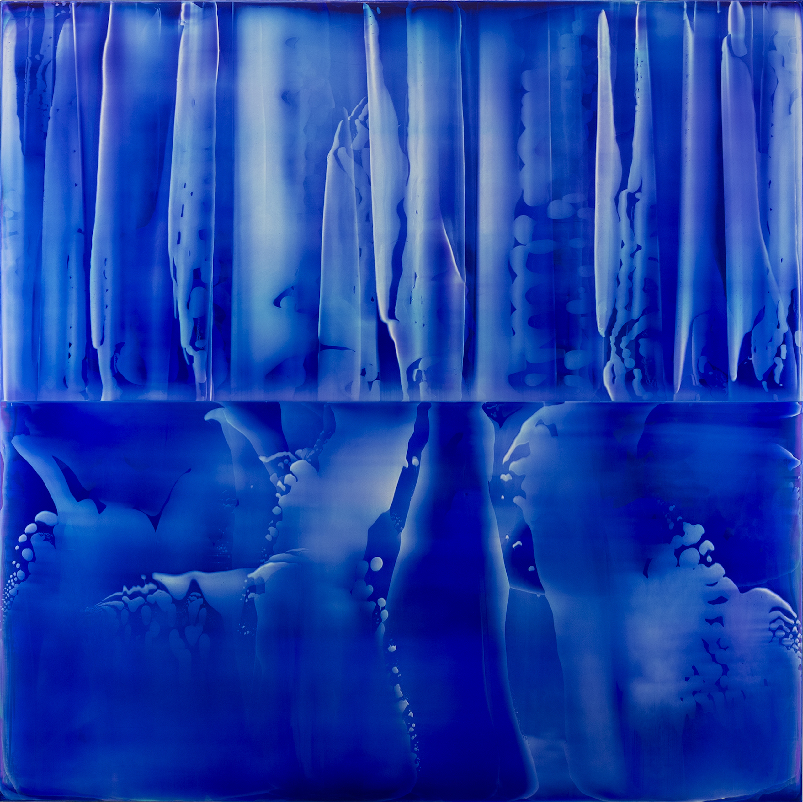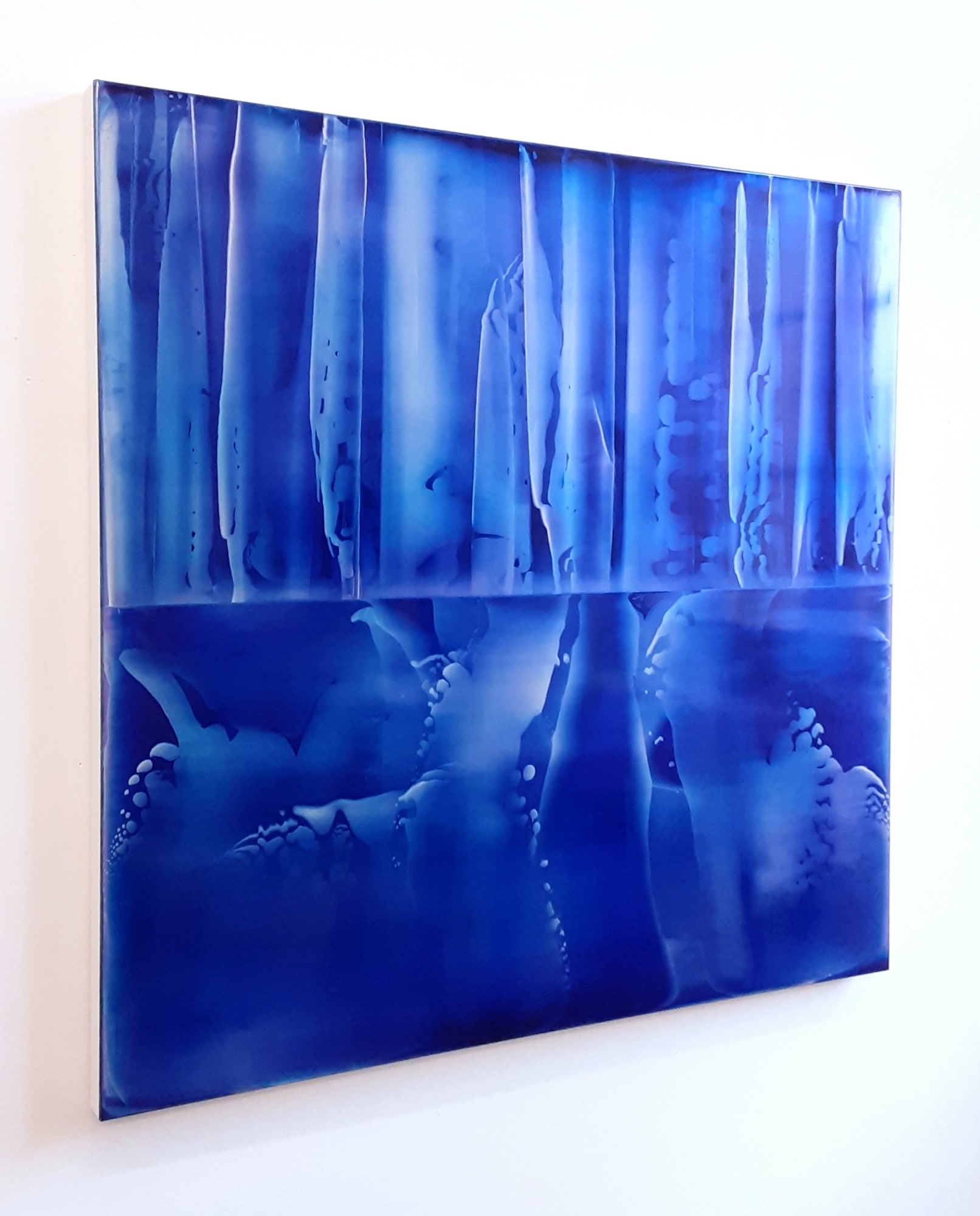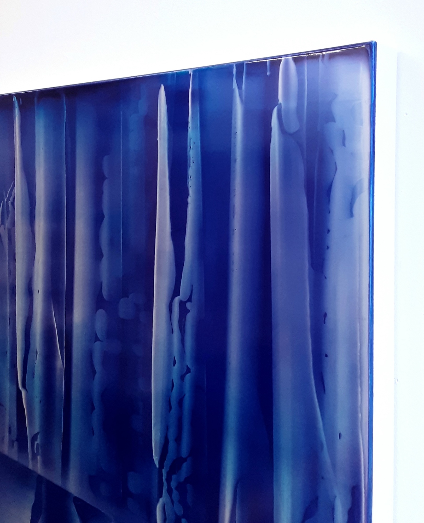 James Lumsden’s abstract paintings explore themes of light, colour and depth. His creative process involves superimposing dozens of thin layers of acrylic paint and gel gloss onto the canvas. This mixture is worked with specific tools to conceal or bring out traces and marks. Layer by layer, the artist succeeds in creating an illusion of depth and light within the painting, immersing the viewer in a mysterious and seductive universe.