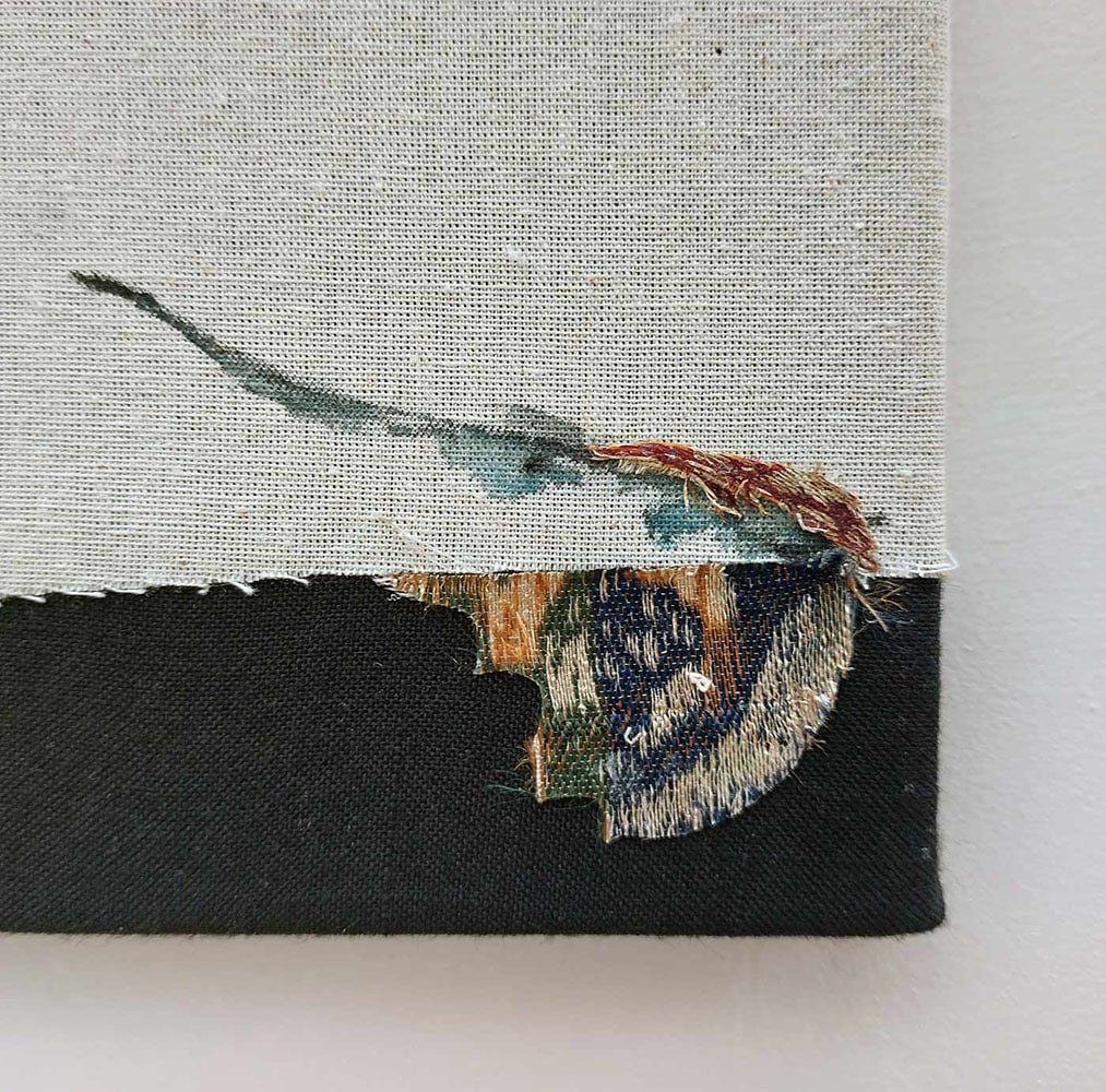 This work is part of a recent series by the artist entitled Remembrance. The memory of living beings, but also of objects, is a theme dear to the artist. With her art she wants to reveal stories, freezing them in time and bringing them out of oblivion. For this series, she chose an object from the Japanese tradition: the kimono. She procures old kimonos, cuts them up and incorporates them into the canvas and paint.