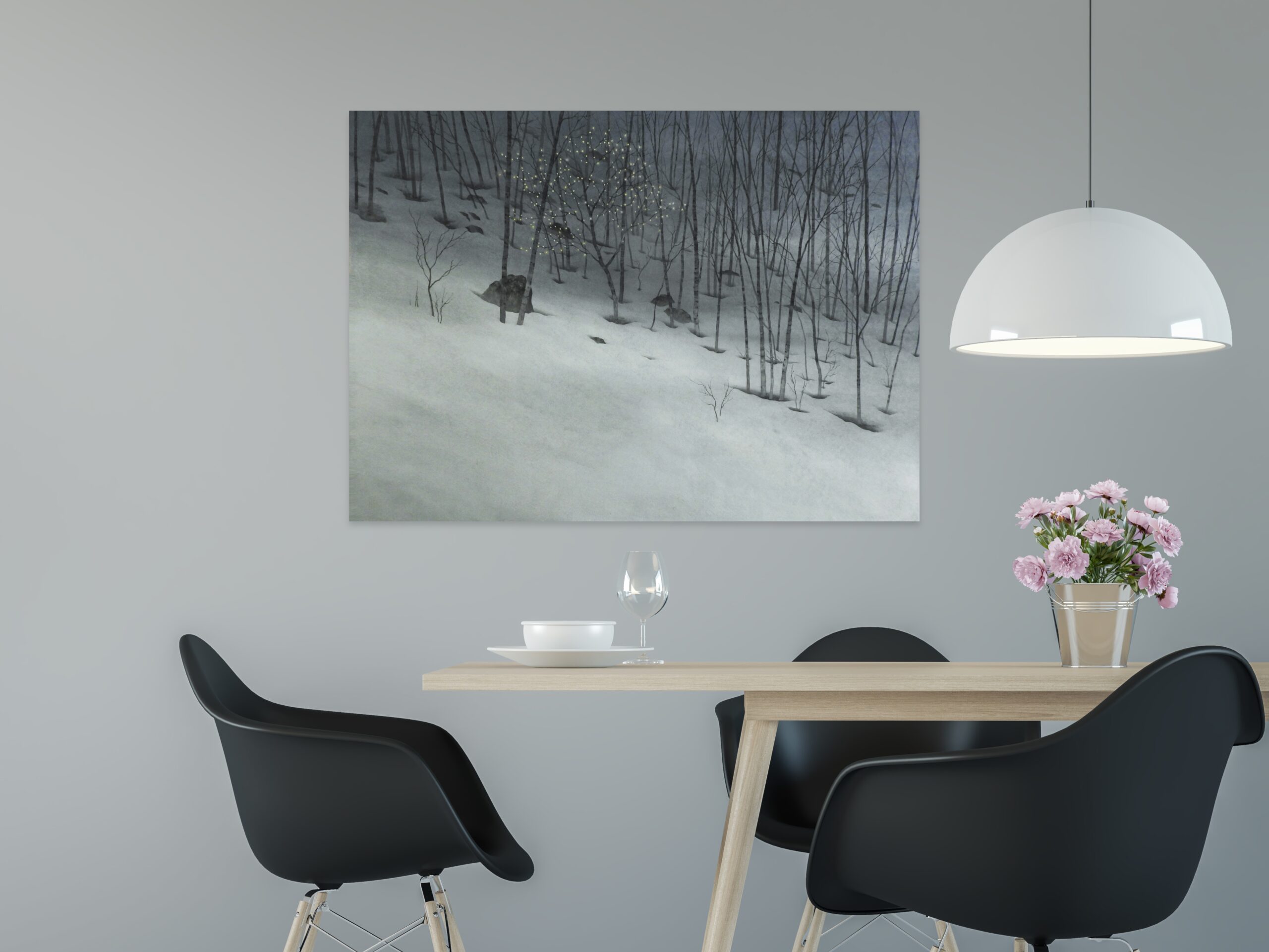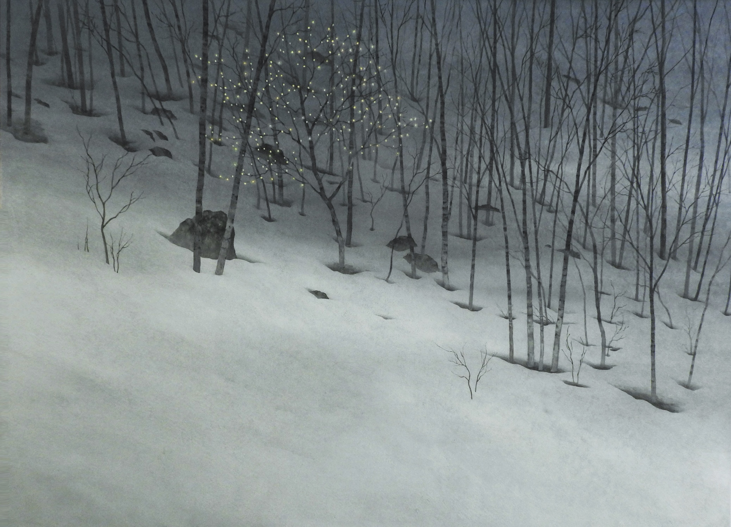 Revenant is a painting by Japanese artist Shoko Okumura from the series Wandering Seasons.The painting depicts a snowy setting, with trees delicately rendered in ink and surrounded by snow in diffuse grey tones.