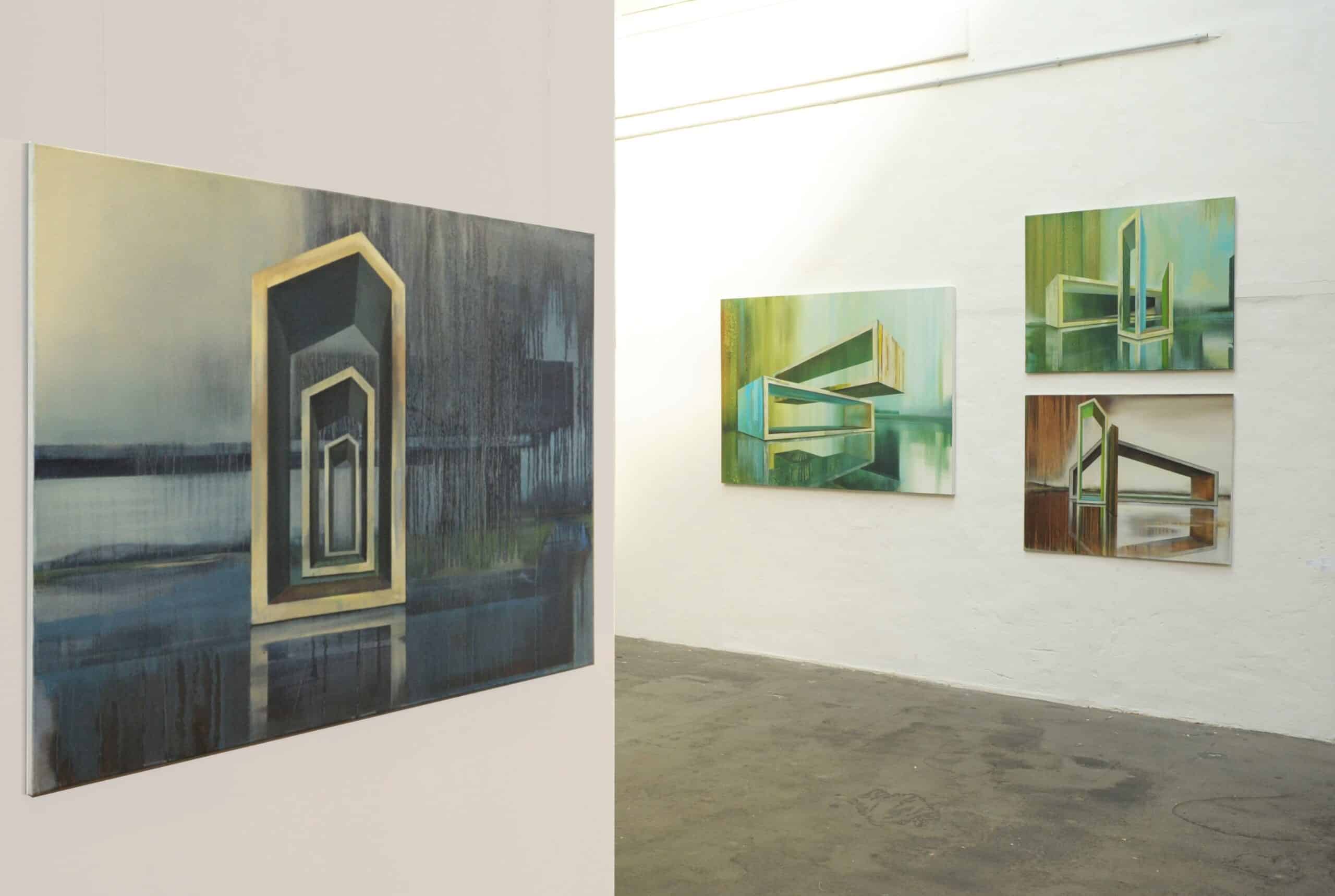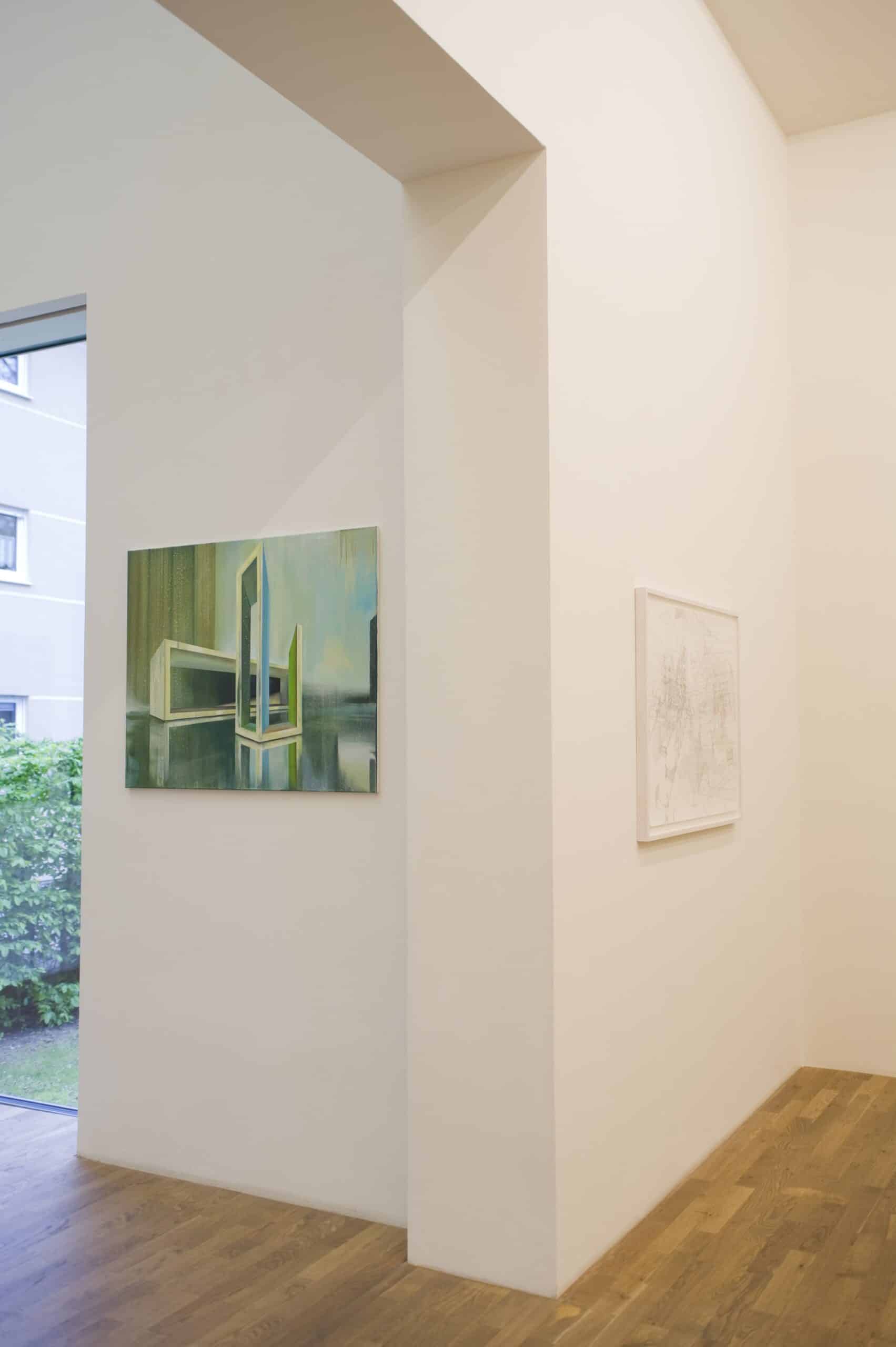 As far as Emanuel Schulze also is a stage designer, he takes a particular interest in the planning of space, which he transposes into his paintings. According to him, geometric shapes are essential as they allow us to structure and bound our living world. The landscaped spaces, the second central element of his work, are elaborate with much more experimentation and without exact planning, leaving more space for imagination. Emanuel Schulze plays on the tension between the technical precision of architectural forms and the pictorial freedom of landscaped spaces.