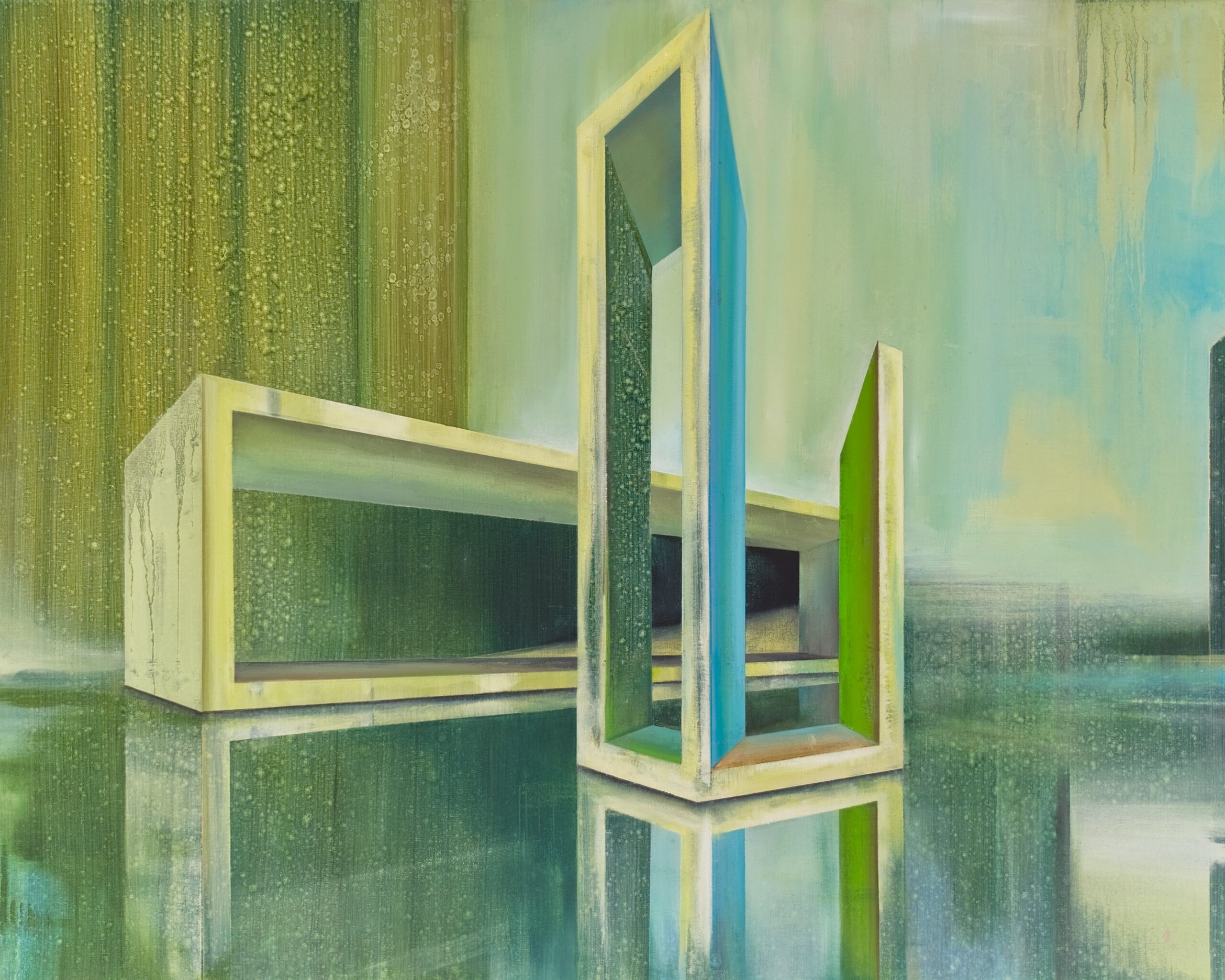 To give depth to this painting, the artist plays on its reflections. The geometric structures are reflected in an immense body of water and anchor themselves in the canvas to become, according to the artist, “islands of the landscape.” Here, Emanuel Schulze also works on the harmony of cold colors as well as the flow of the layers of paint, giving this composition its peculiarity.
