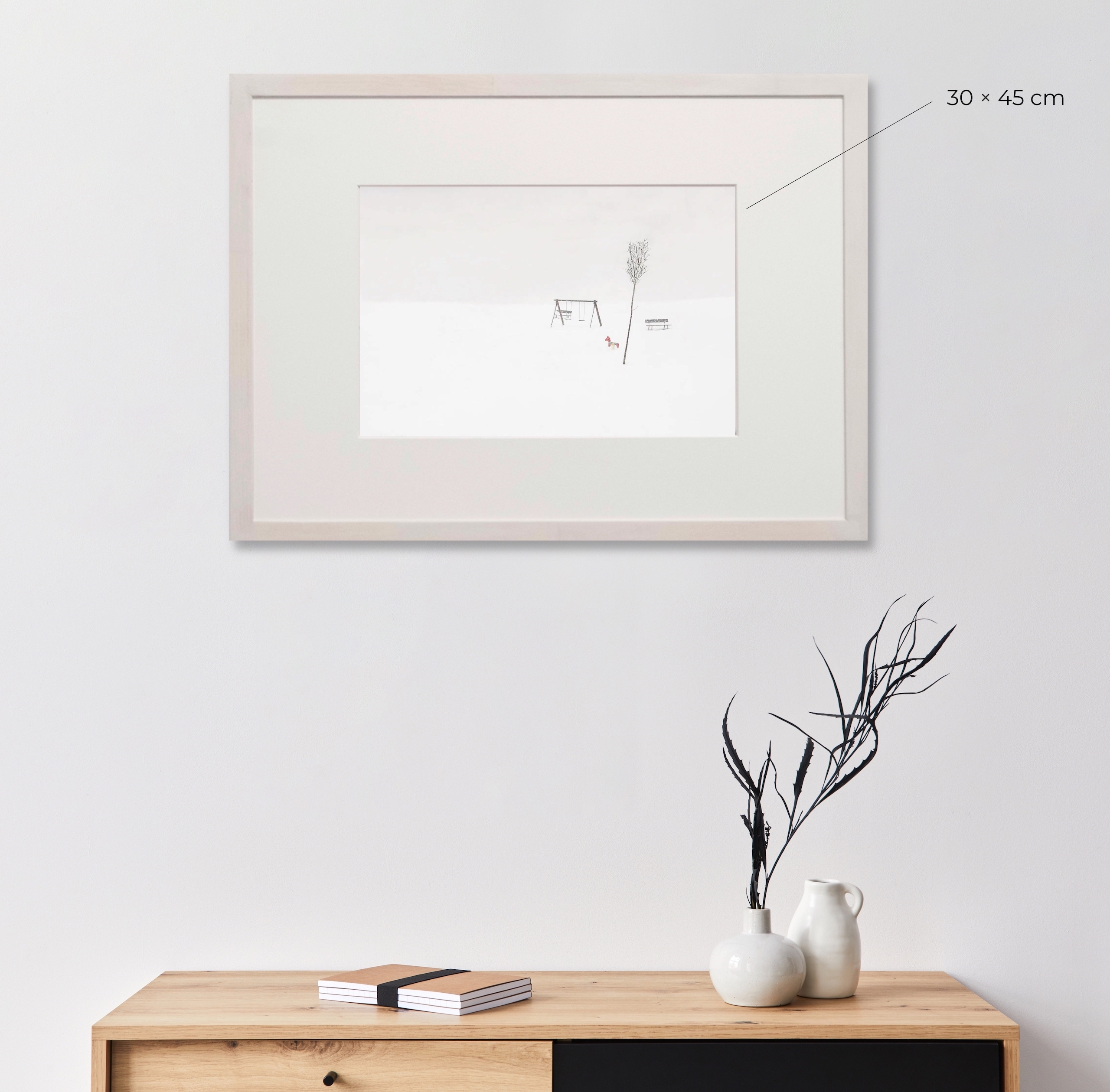 The artist uses overexposure when shooting to achieve a restrained language of clear, luminous tones, in which only the essential is visible. The simplicity of lines, shapes and colors is combined with careful, long-studied composition. The photographs are personally printed by the artist on textured cotton paper, which gives the image a velvety matte effect that is visually similar to watercolor.