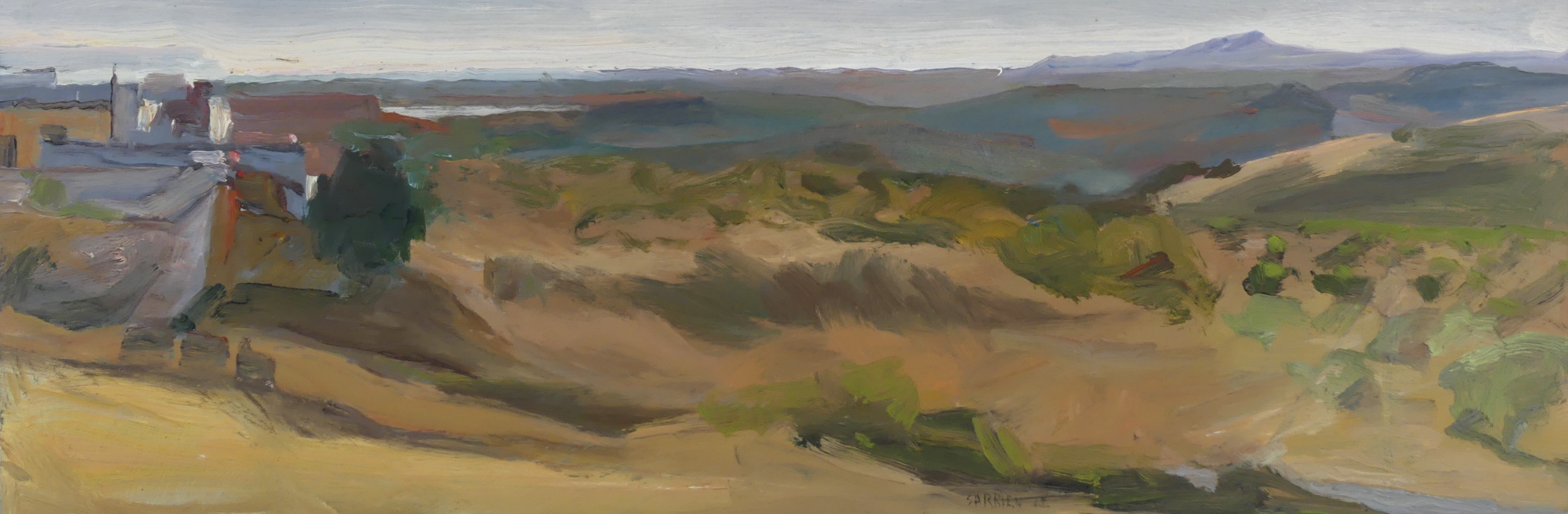 San Rita is a work by the artist Valerie de Sarrieu. This oil painting is part of the “En plein air” series. This painting depicts a southern landscape, featuring a plain and mountains in the distance. The dynamic brushstrokes convey the beauty of an endless nature.