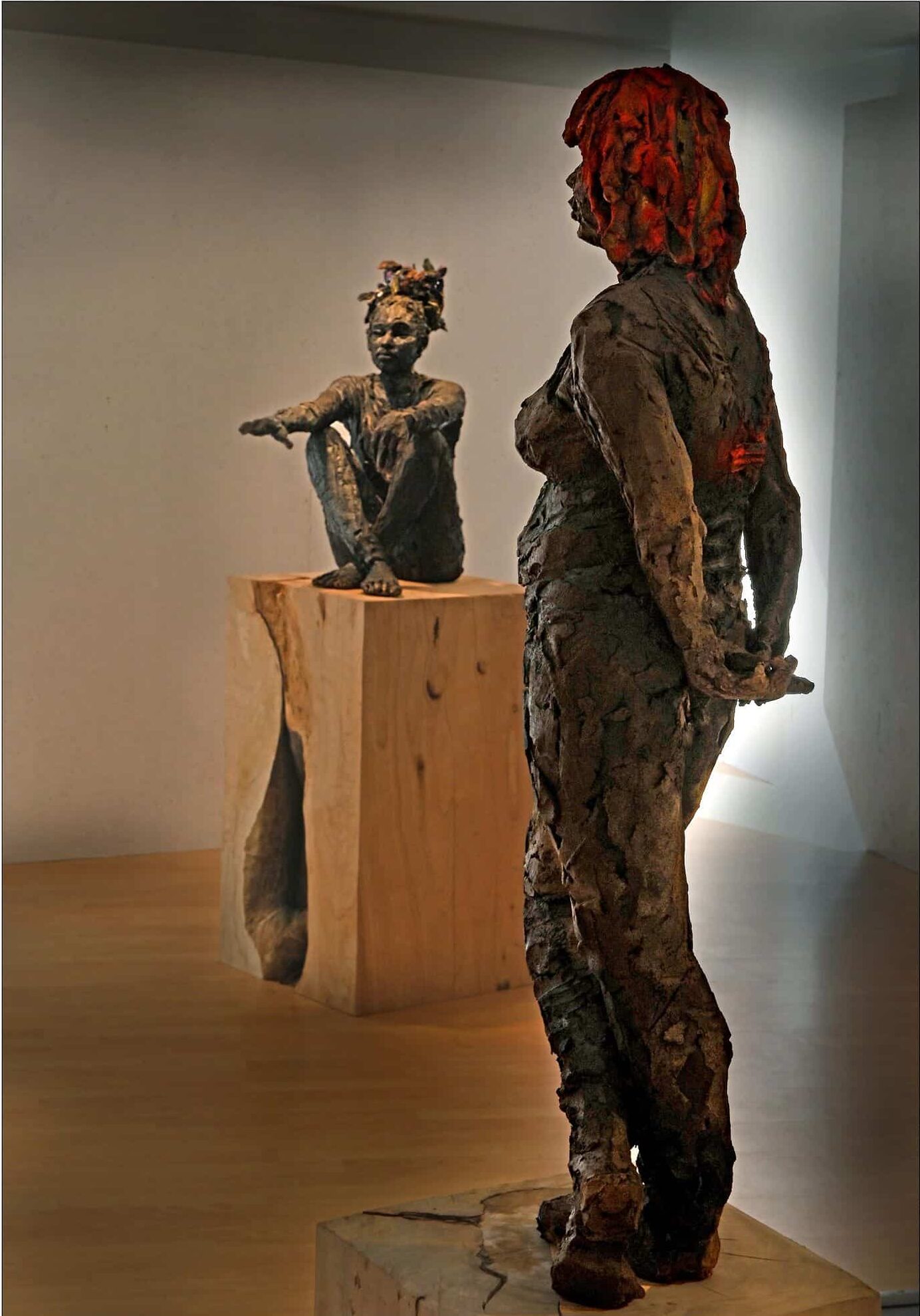 Scarlet (with Lindsay) is a smoky sandstone sculpture by the contemporary artist Cécile Raynal of a red headed woman.