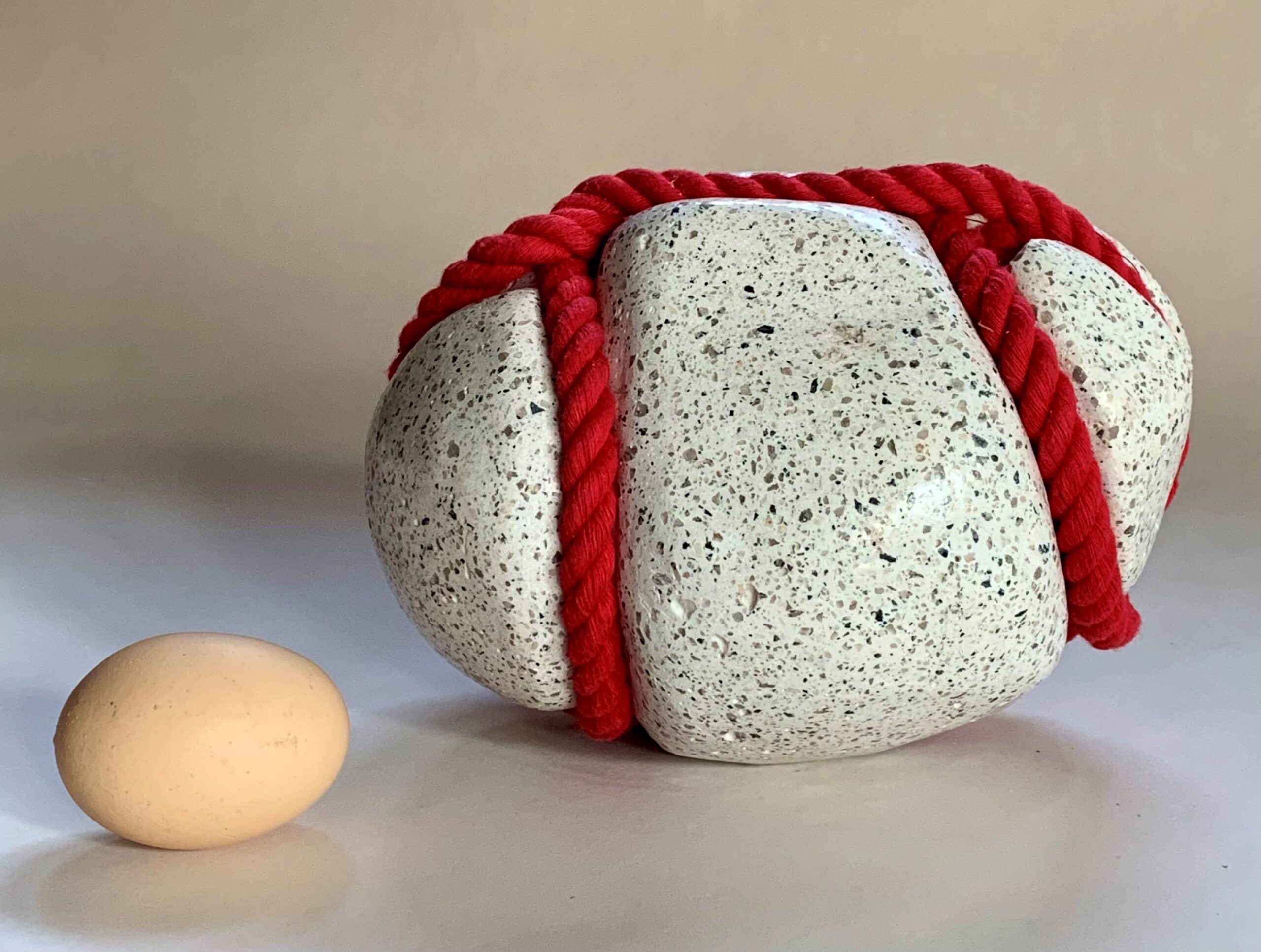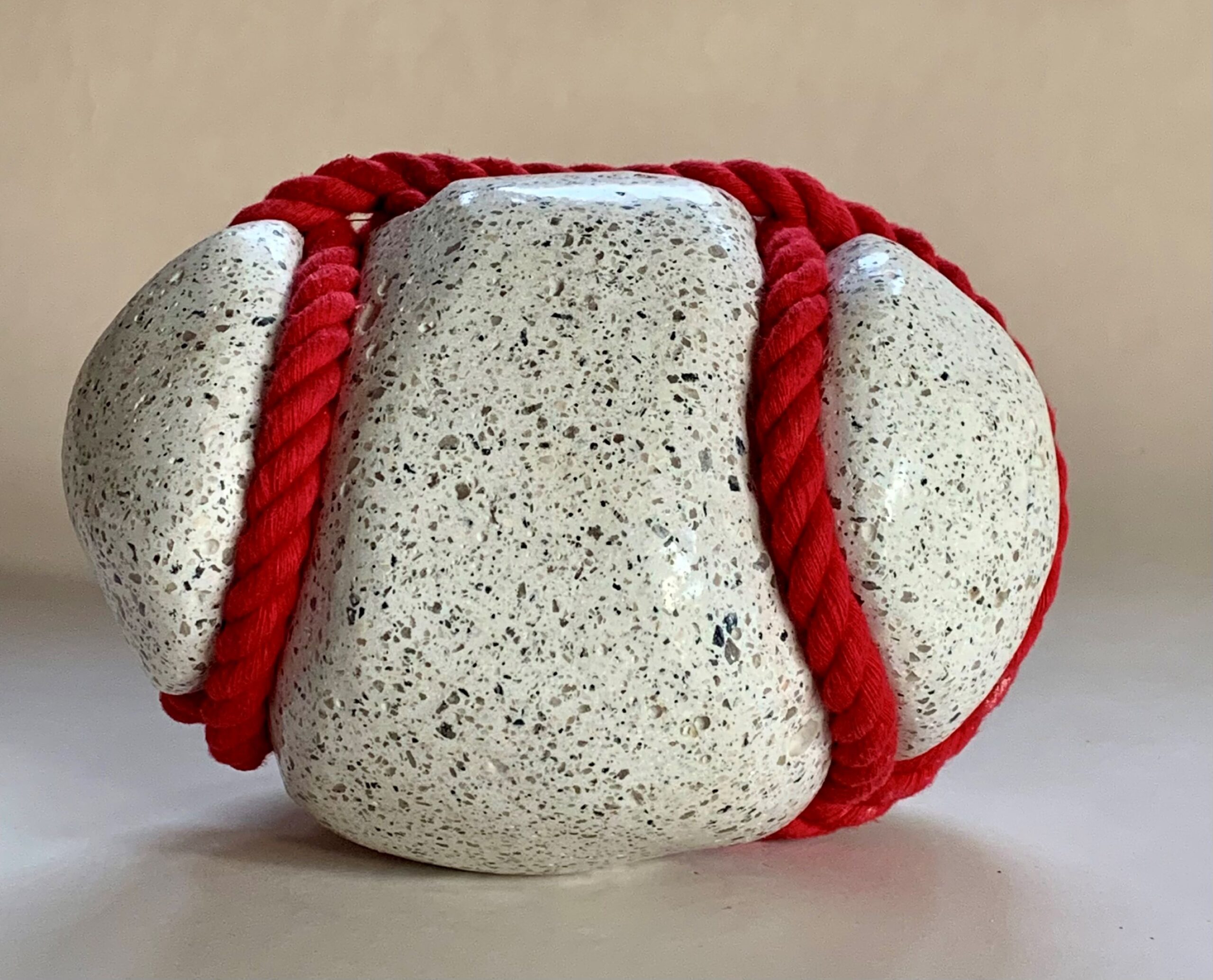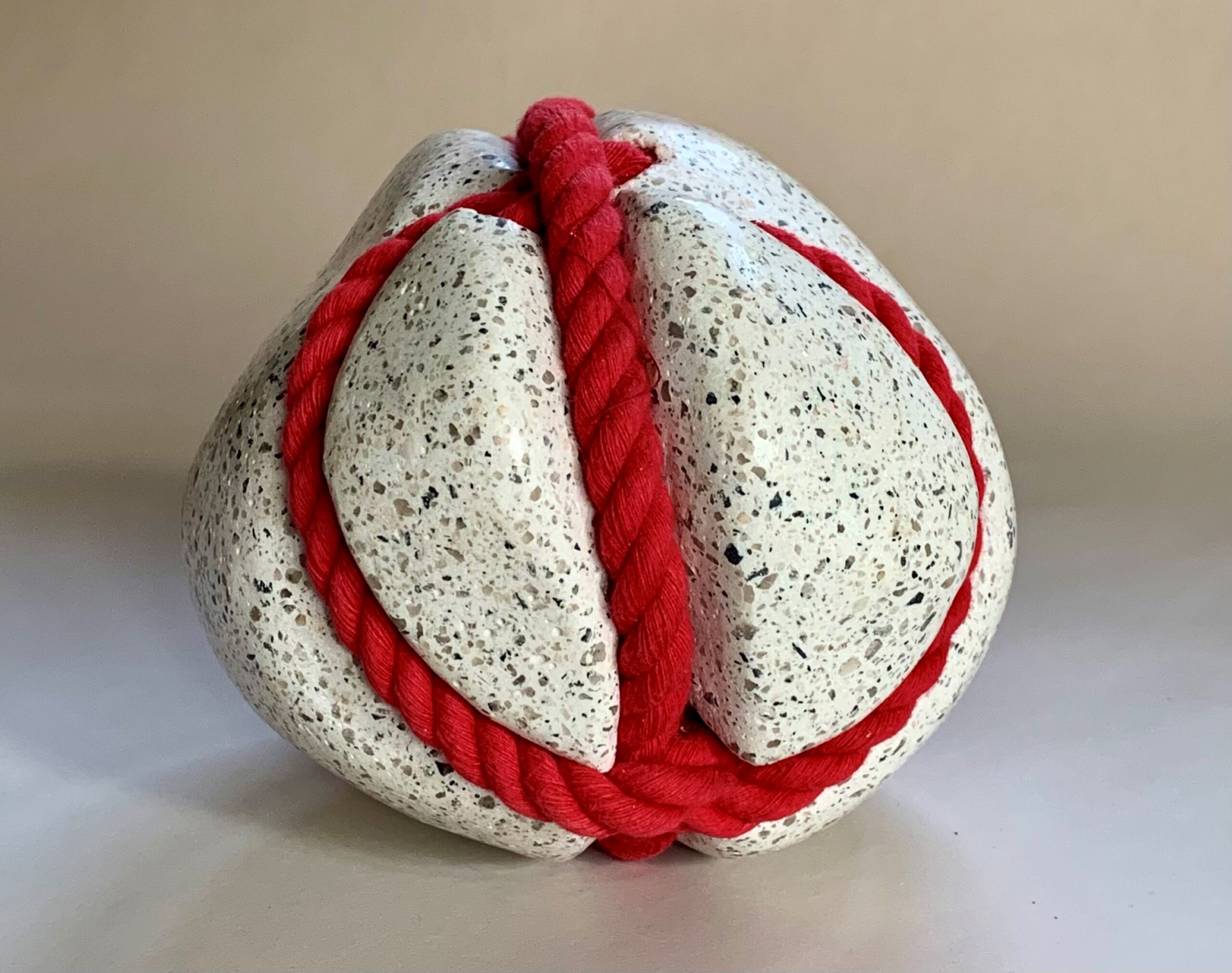 Second Chance is a sculpture by contemporary British artist Peter Brooke-Ball made with Jesmonite though a mold cast. Jesmonite is a composite material created with a gypsum-based material and an acrylic resin. The artist added marble grit to the mixture which gives it texture. This contemporary sculpture is surrounded by a red rope in a juxtaposition that highlights a strong color contrast.