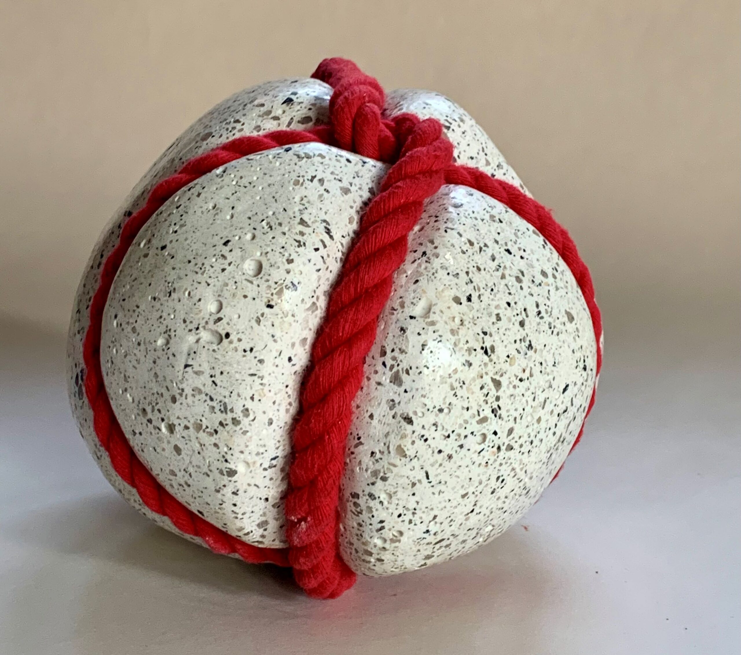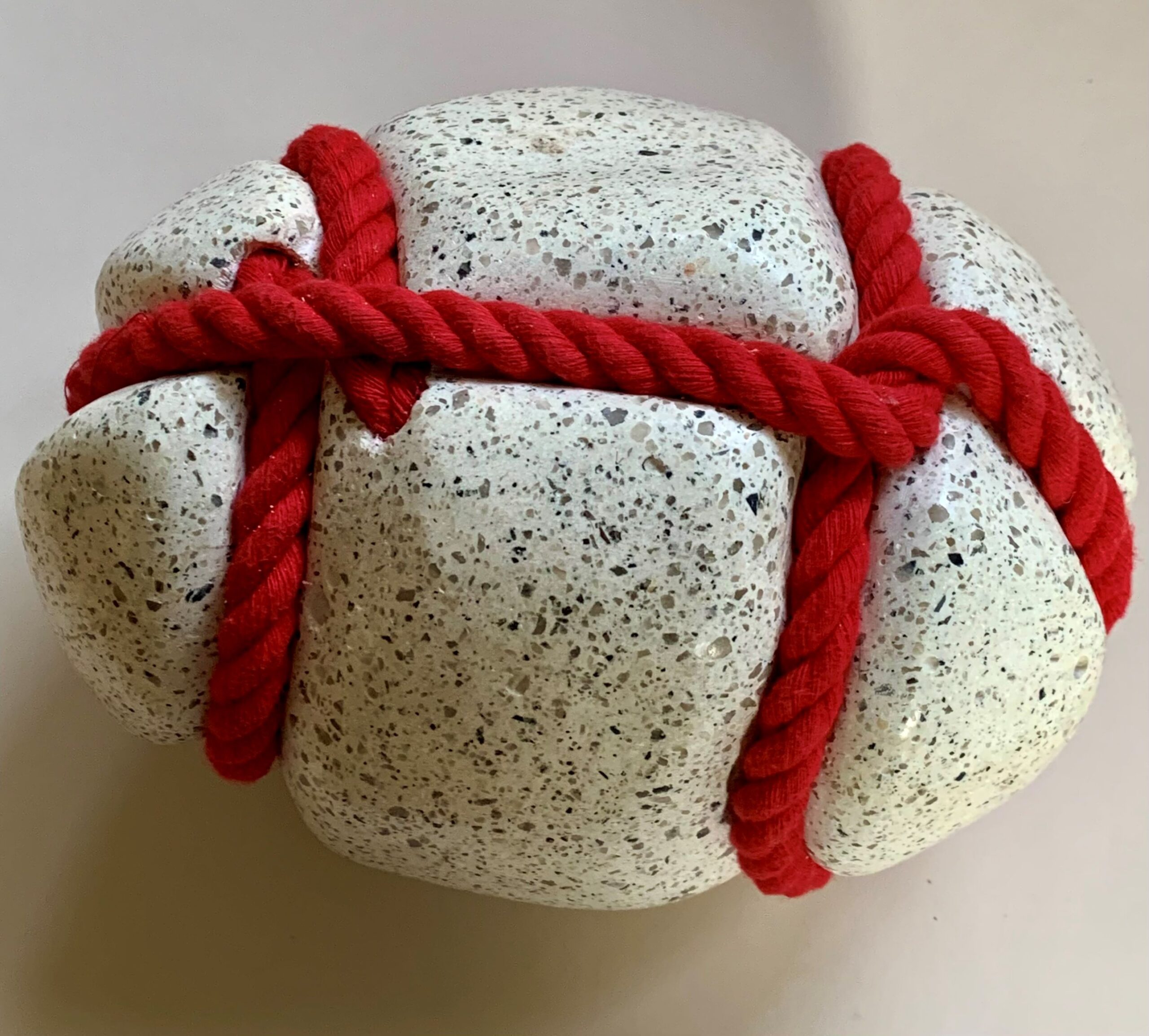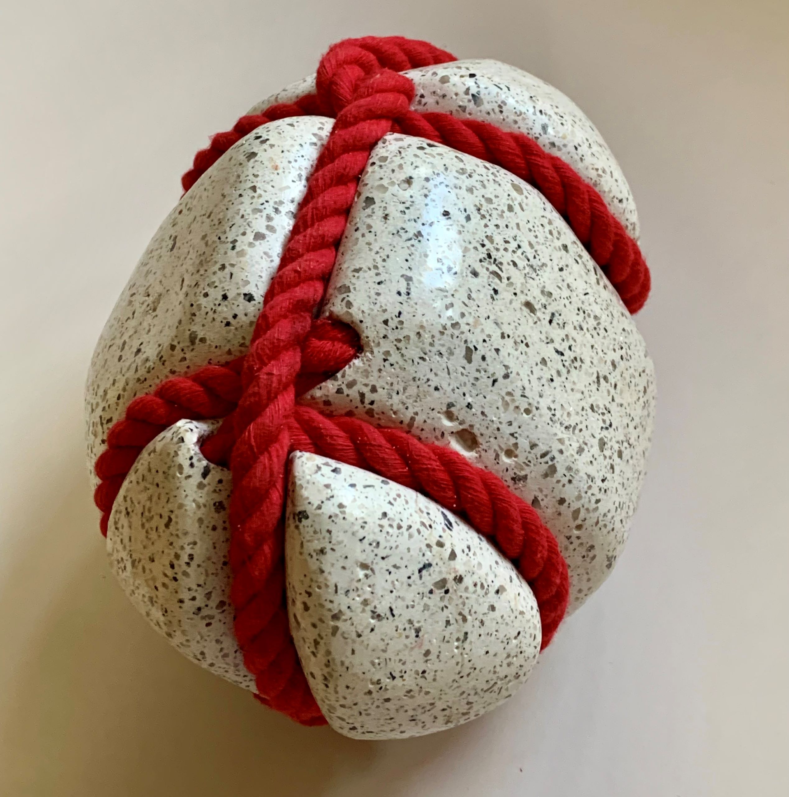 Second Chance is a sculpture by contemporary British artist Peter Brooke-Ball made with Jesmonite though a mold cast. Jesmonite is a composite material created with a gypsum-based material and an acrylic resin. The artist added marble grit to the mixture which gives it texture. This contemporary sculpture is surrounded by a red rope in a juxtaposition that highlights a strong color contrast.