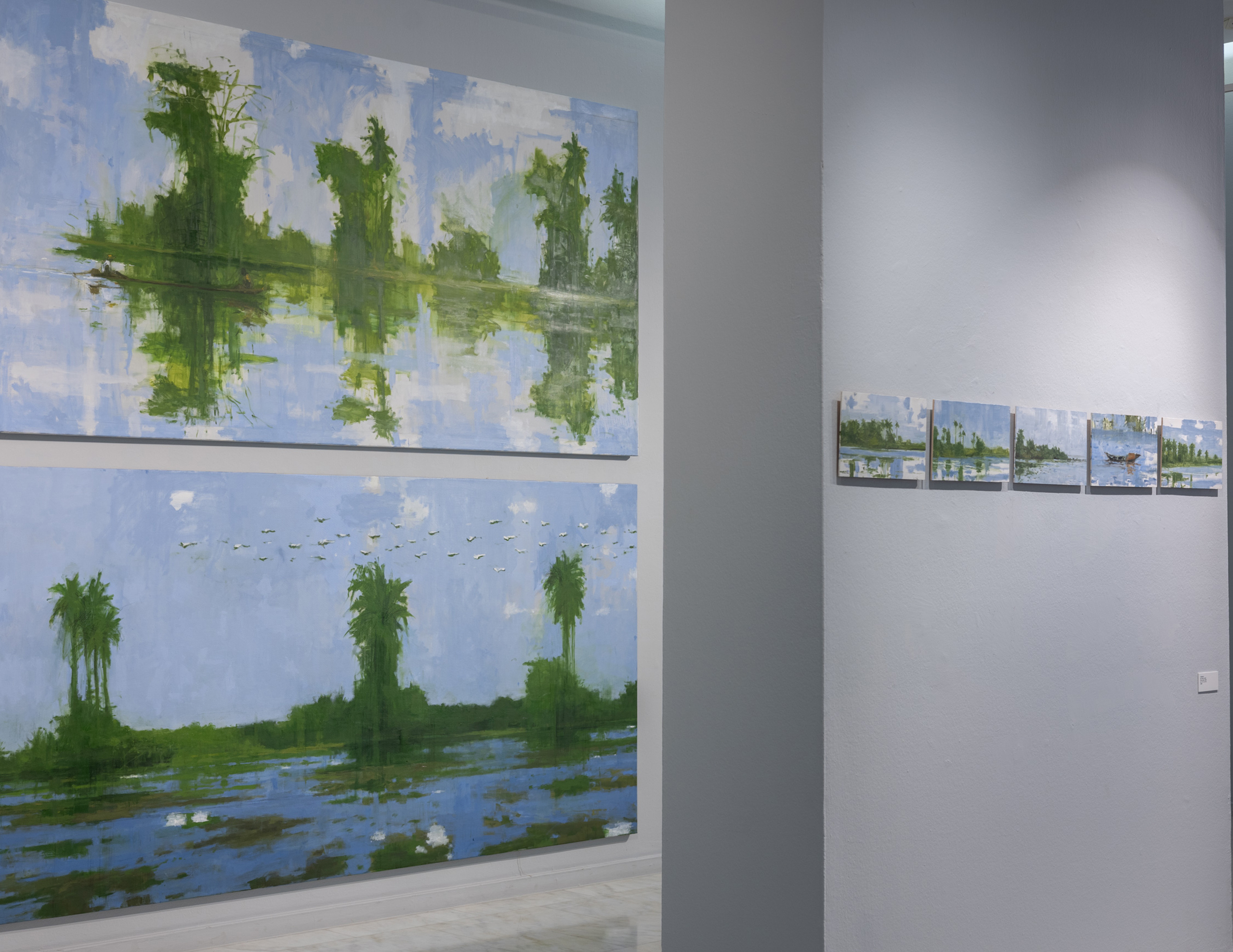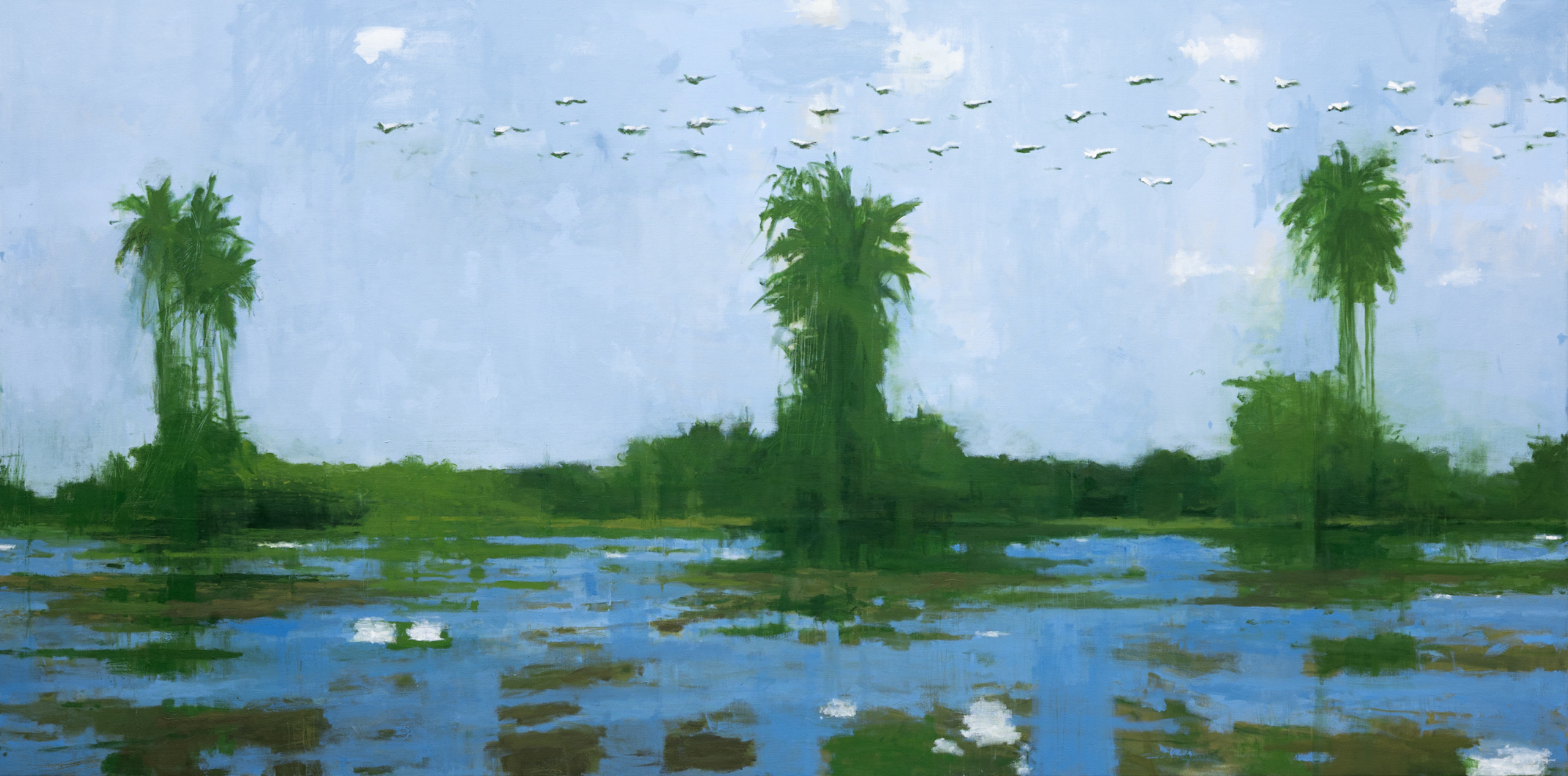 Sedhiou N1 is a painting by the Spanish artist Calo Carratalá. In this work, the artist depicts a serene wetland landscape in the Sédhiou region of Senegal, known for its tropical vegetation and calm waters. Palm trees and reflections on the water create a tranquil atmosphere that invites the viewer to pause.