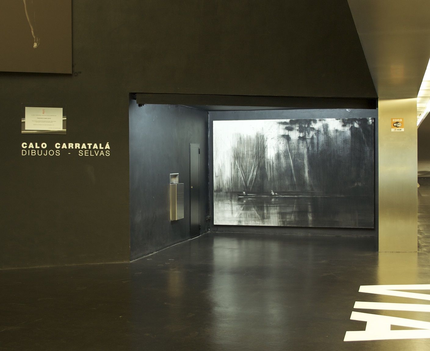 Selvas Negras n°2, Jungle Series is an artwork by Spanish contemporary artist Calo Carratala. This artwork represents two men navigating a boat on a river of the Amazonian Jungle. The atmosphere seems calm but dense, which effect is emphasized by the overlay of pencil lines and by the intensity of the black color.