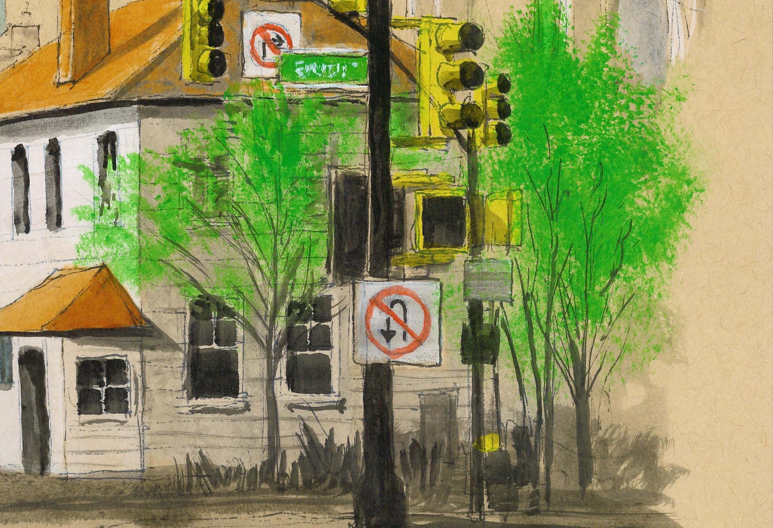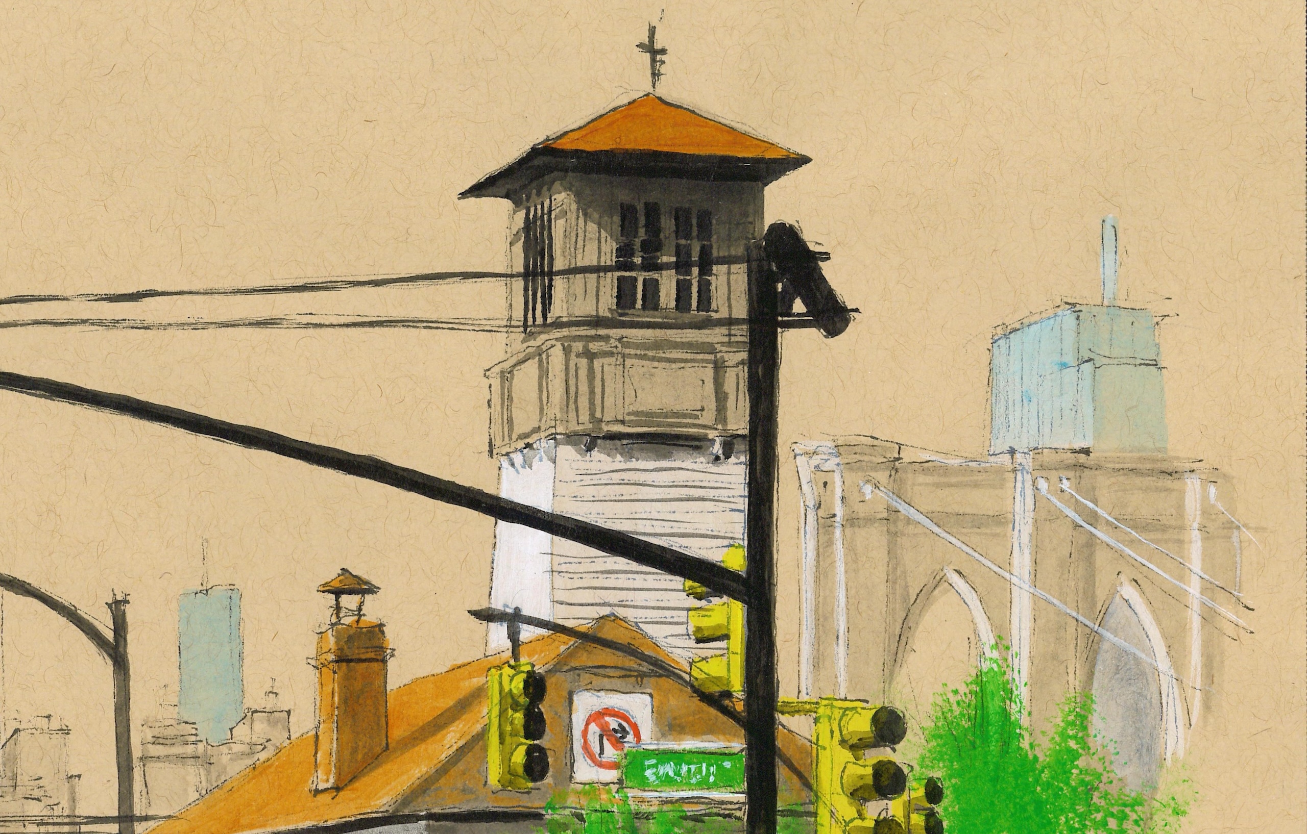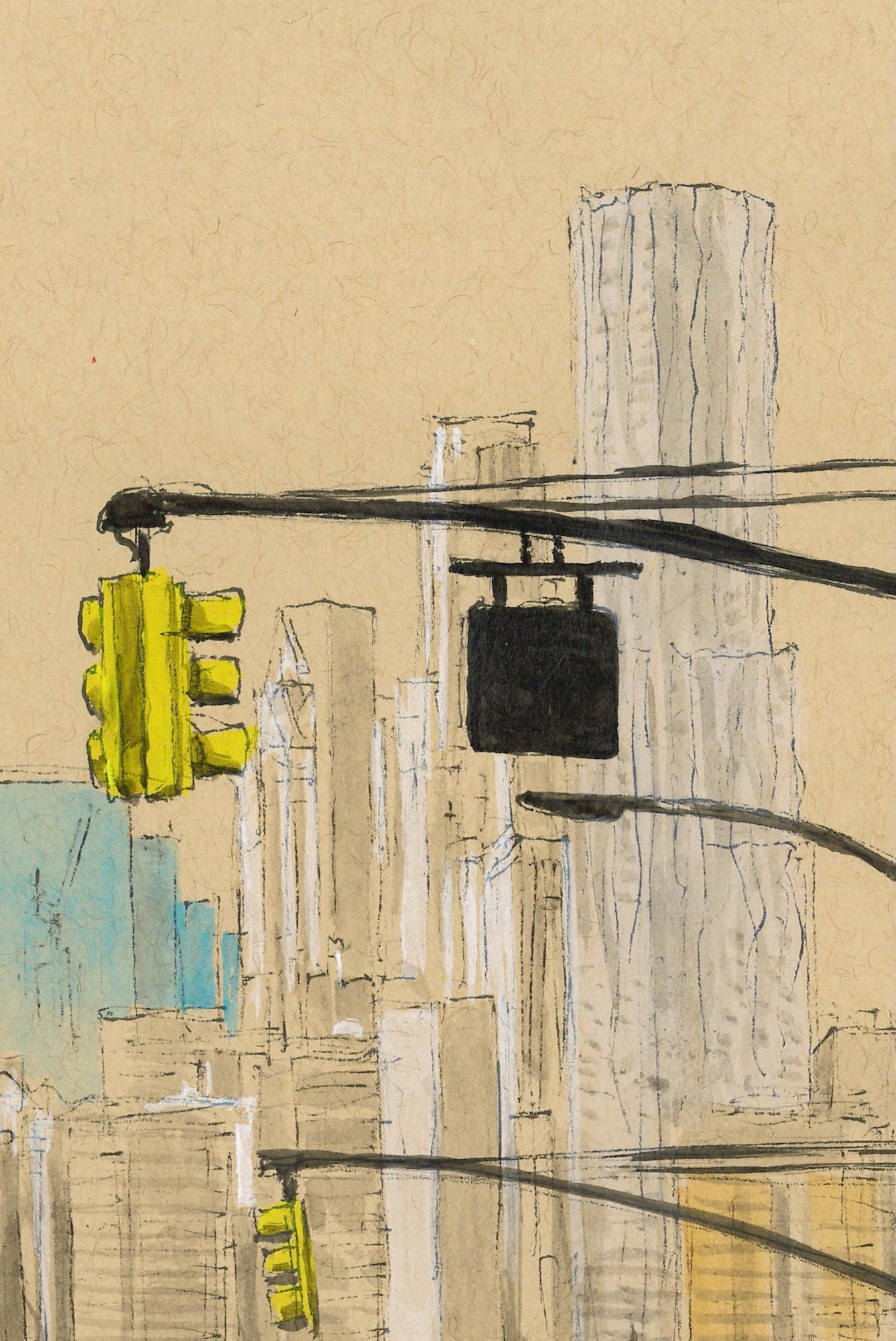 September is a drawing by French contemporary artist Guillaume Chansarel, part of the New York series. This highly detailed drawing represents a typical view of New York, featuring traffic lights, skyscrapers, the Brooklyn Bridge, and diverse architecture.