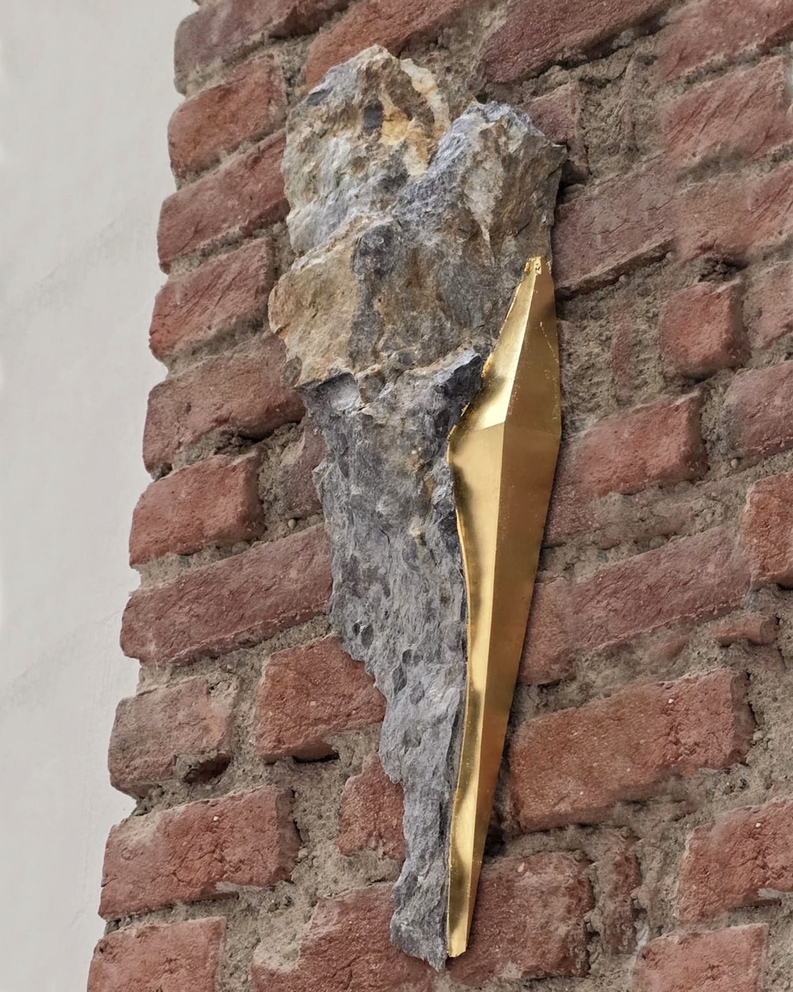 In order to further accentuate certain forms and lines in the stone, the artist applies gold leaf. This series of works, entitled “Sezione aurea” (“Golden section”), was born out of the observation of rocks containing mica. Thanks to this mineral, which makes the stone sparkle, the artist decided to crystallise this golden presence, using gold leaf. For Mattia Bosco, if stone is the solid incarnation of time, gold is akin to light, in solid state.