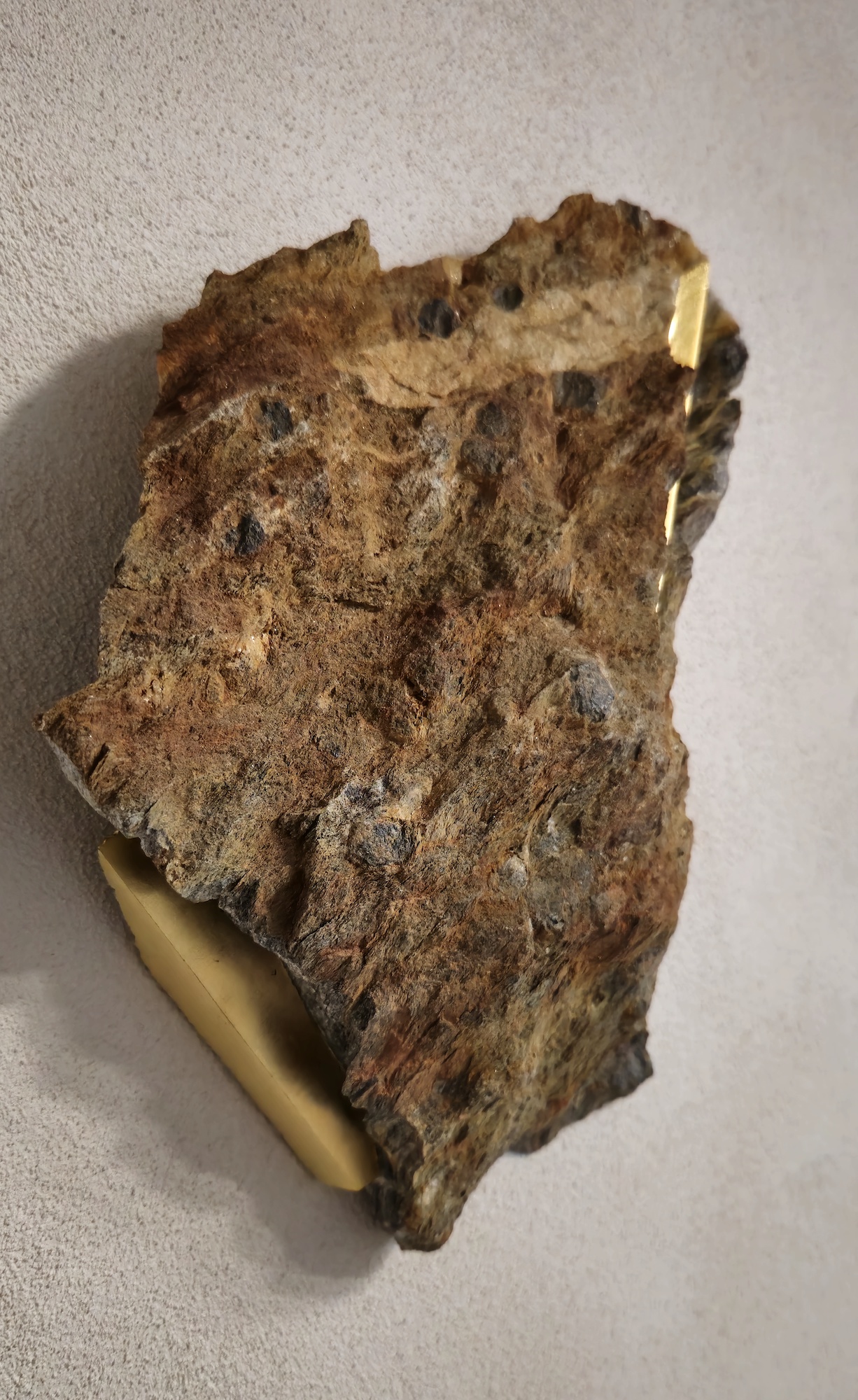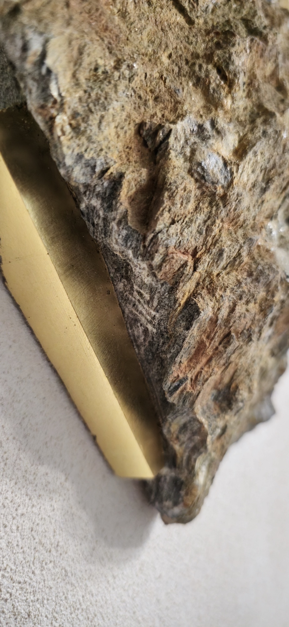 In order to further accentuate certain forms and lines in the stone, the artist applies gold leaf. This series of works, entitled “Sezione aurea” (“Golden section”), was born out of the observation of rocks containing mica. Thanks to this mineral, which makes the stone sparkle, the artist decided to crystallise this golden presence, using gold leaf. For Mattia Bosco, if stone is the solid incarnation of time, gold is akin to light, in solid state.
