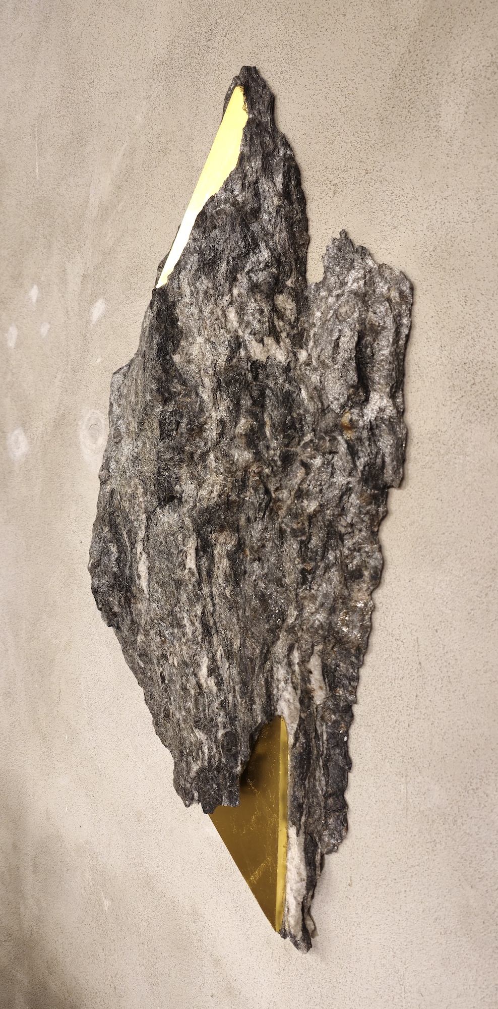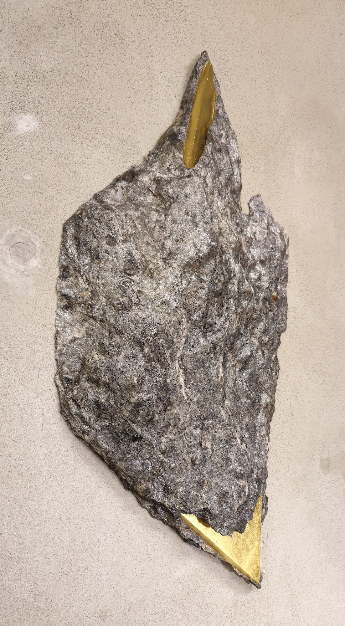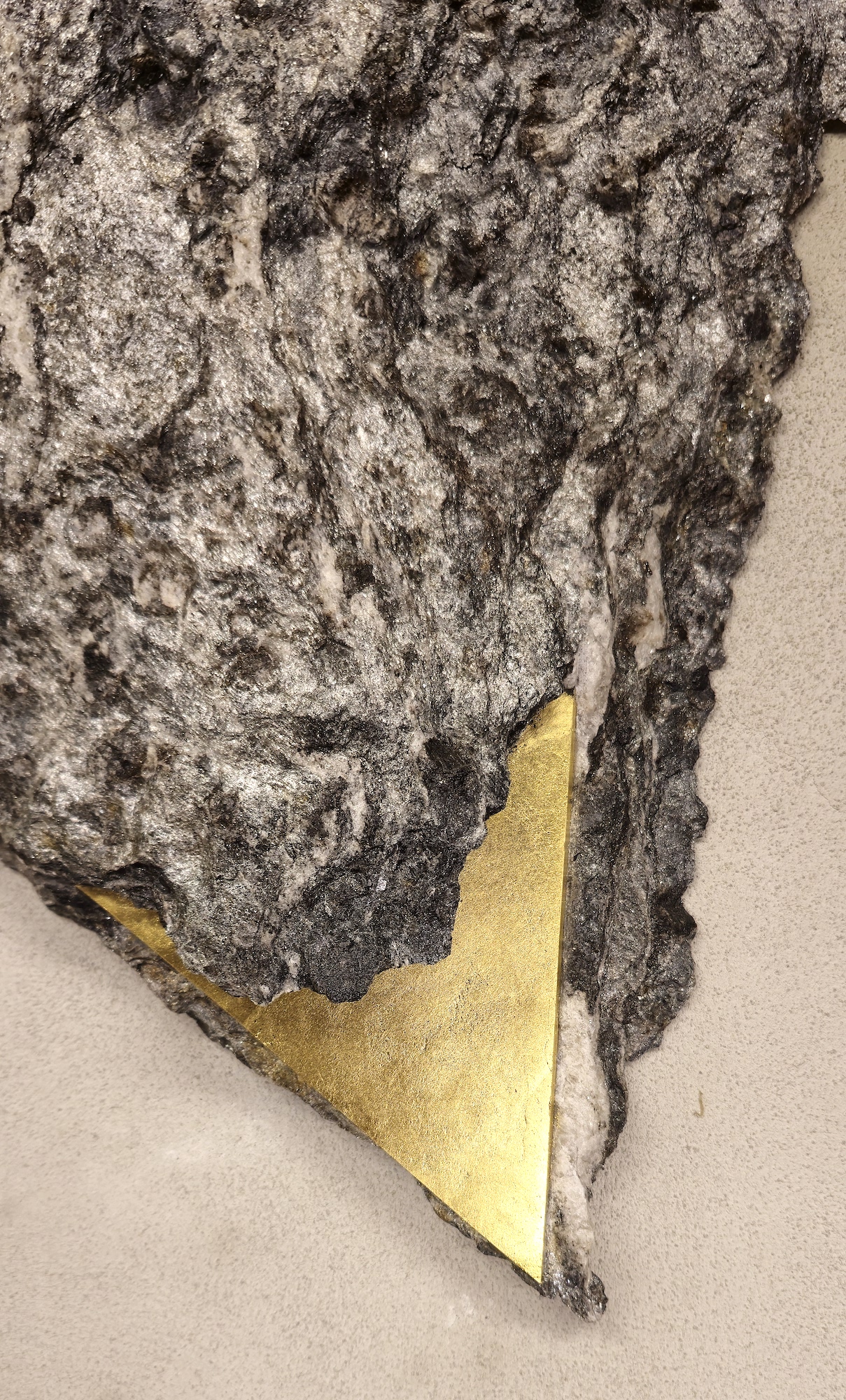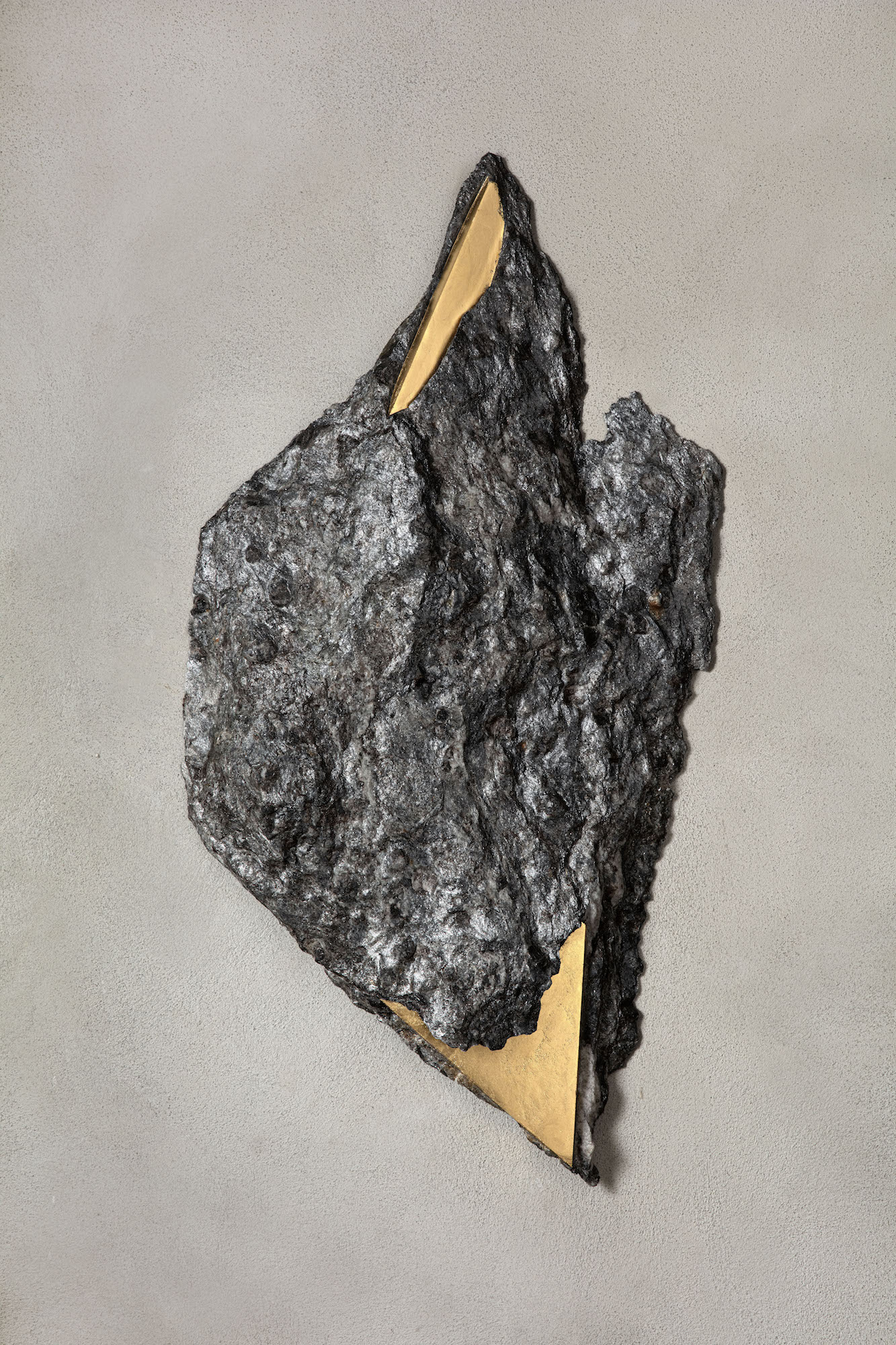 In order to further accentuate certain forms and lines in the stone, the artist applies gold leaf. This series of works, entitled “Sezione aurea” (“Golden section”), was born out of the observation of rocks containing mica. Thanks to this mineral, which makes the stone sparkle, the artist decided to crystallise this golden presence, using gold leaf. For Mattia Bosco, if stone is the solid incarnation of time, gold is akin to light, in solid state.