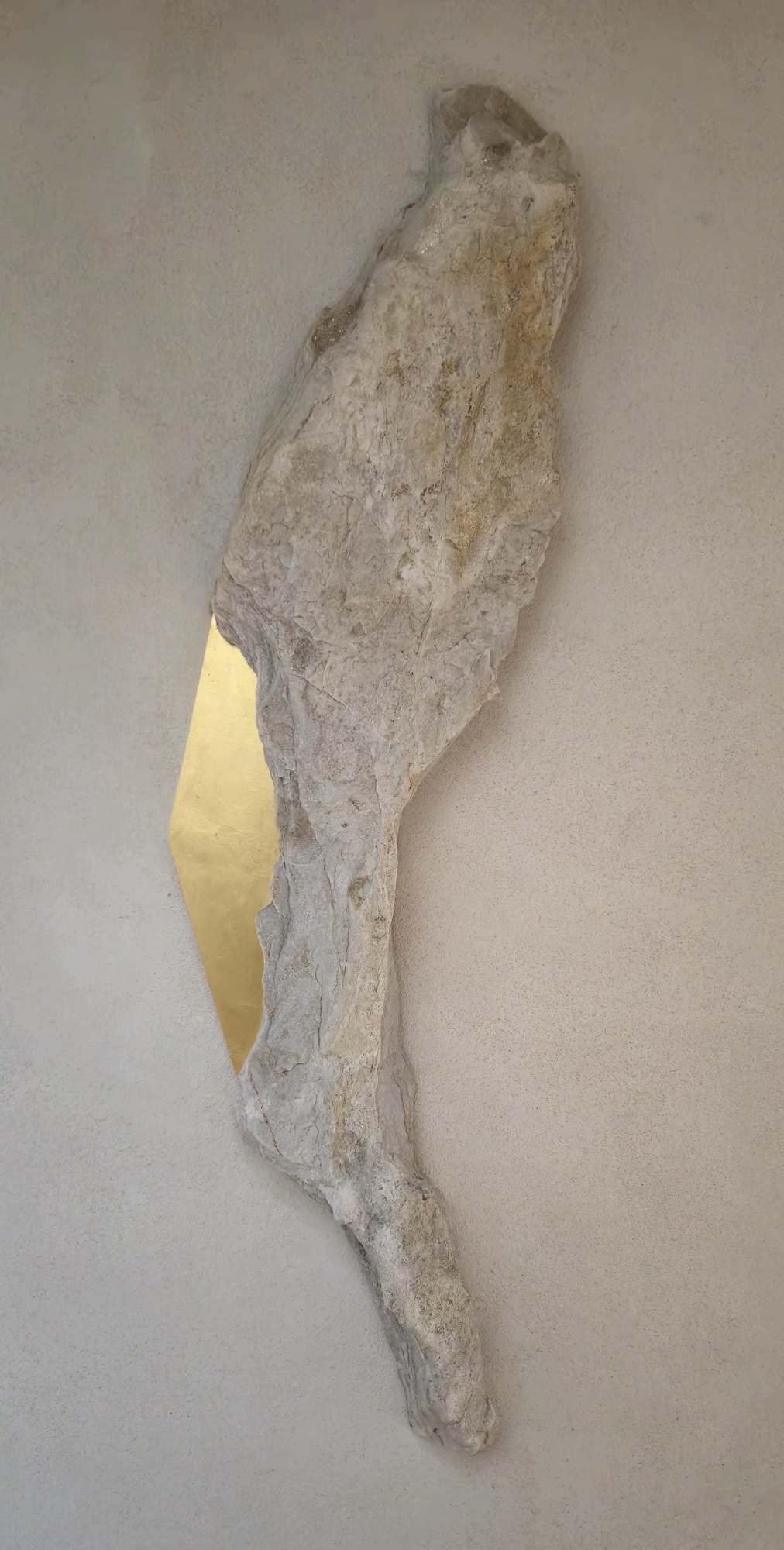 In order to further accentuate certain forms and lines in the stone, the artist applies gold leaf. This series of works, entitled “Sezione aurea” (“Golden section”), was born out of the observation of rocks containing mica. Thanks to this mineral, which makes the stone sparkle, the artist decided to crystallise this golden presence, using gold leaf. For Mattia Bosco, if stone is the solid incarnation of time, gold is akin to light, in solid state.