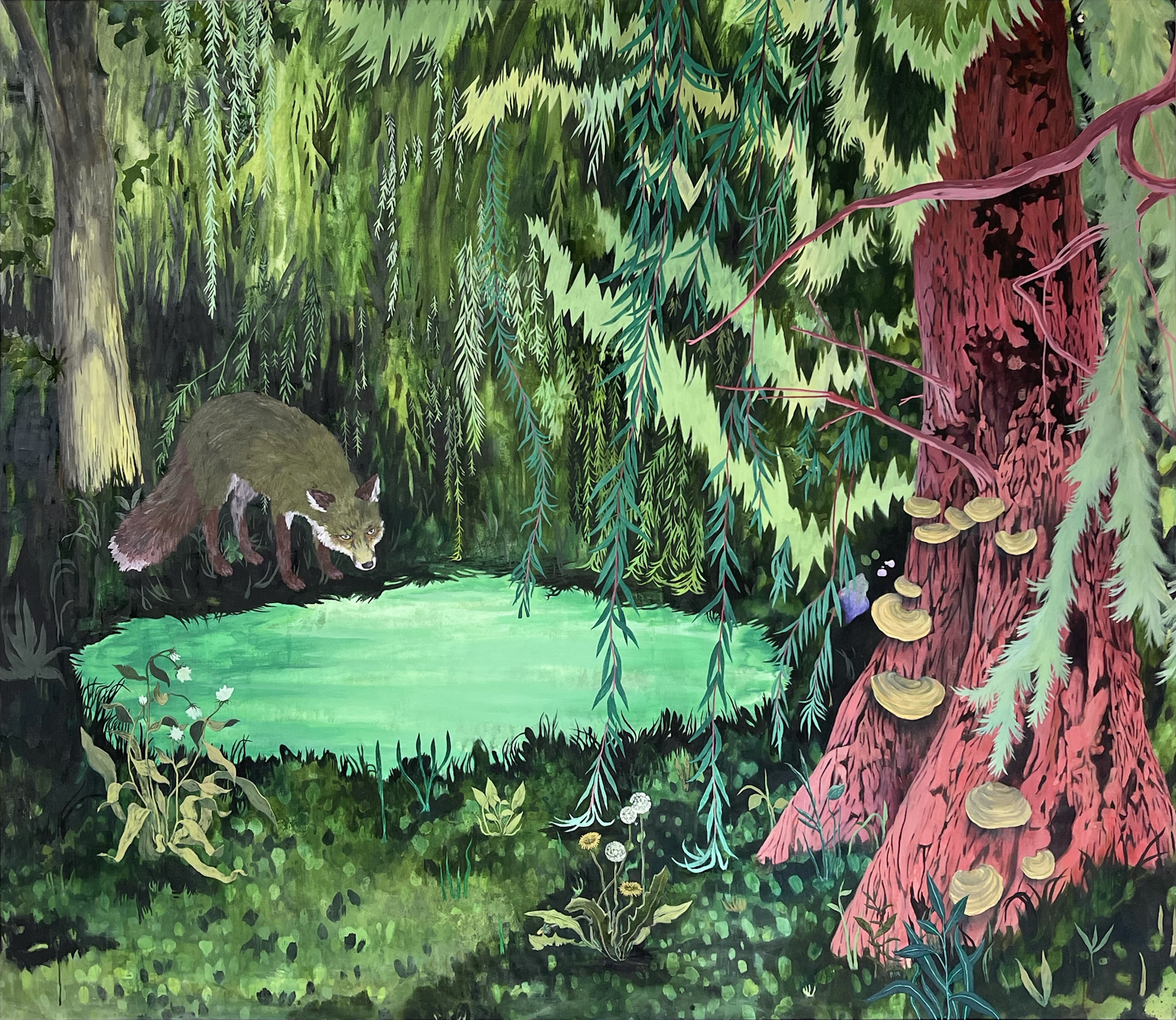 Shadow under the Willow Tree is an acrylic on canvas by the artist Rene Gonzalez representing a fox drinking at the edge of a lake surrounded by a lush and mysterious nocturnal forest. The large format of this work echoes Rene Gonzalez’s artistic past: in his youth in Costa Rica, he accumulated a wealth of experience as a mural painter.