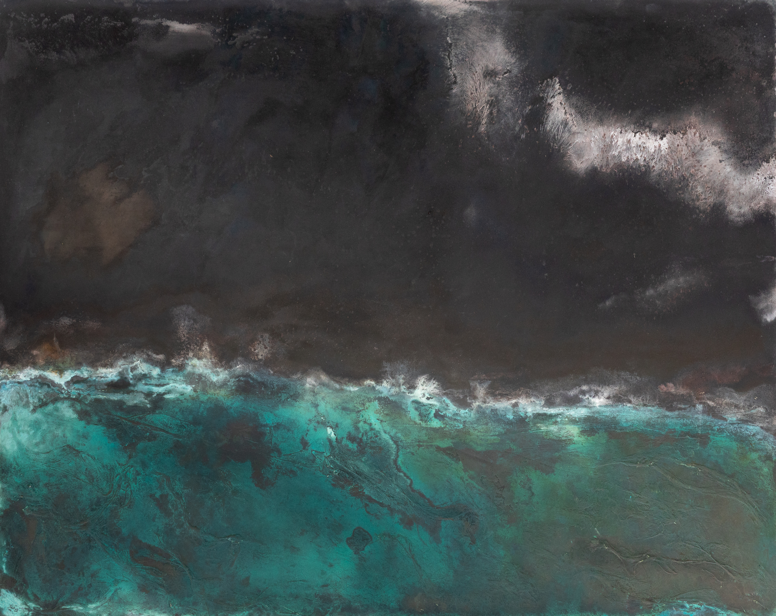 Frédérique Domergue finds her inspiration in nature and especially in the seaside. Her paintings evoke landscapes, skies and seas that are sometimes calm and tranquil, sometimes dark and turbulent. This abstract work seems to portray turbulent waves under an inky sky. The line and the contrast — between the sky and the water — are often a feature of the artist’s work.