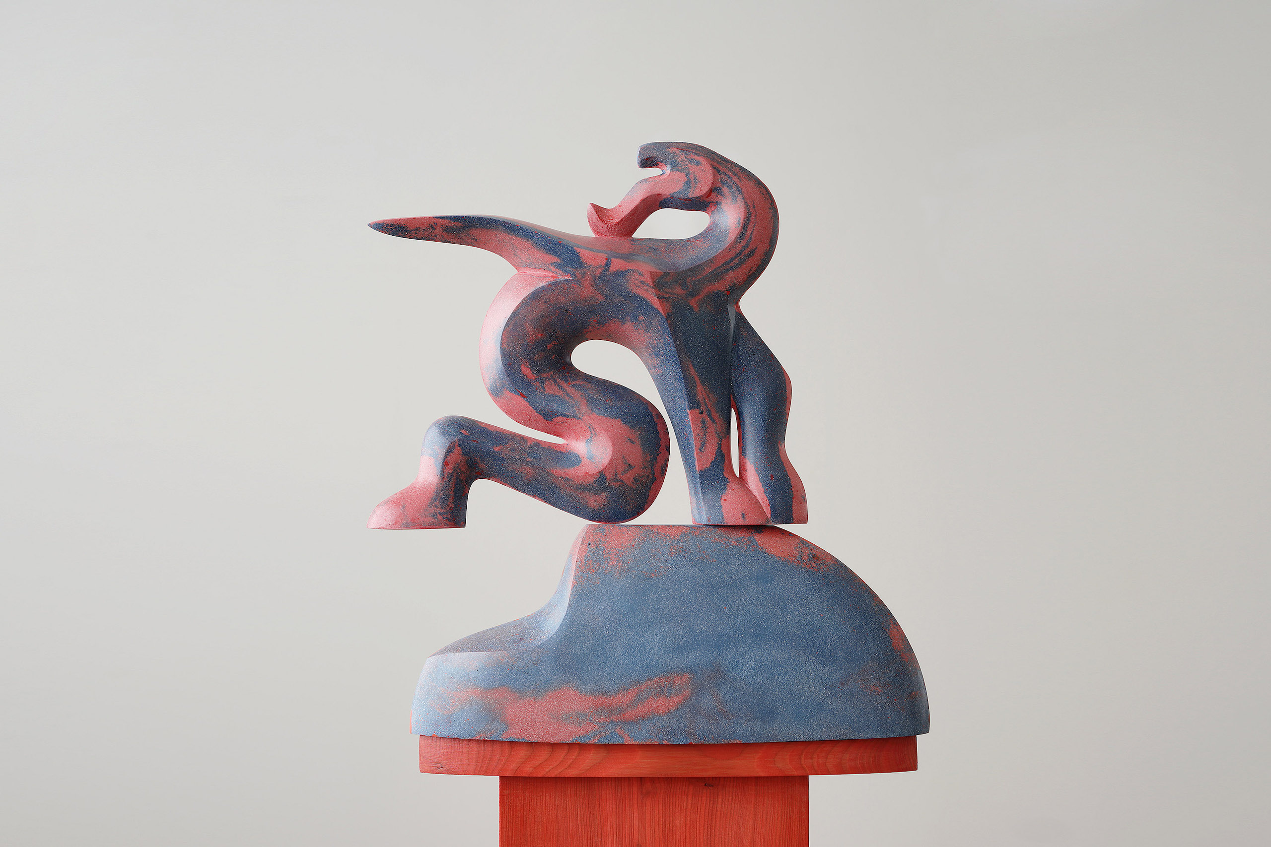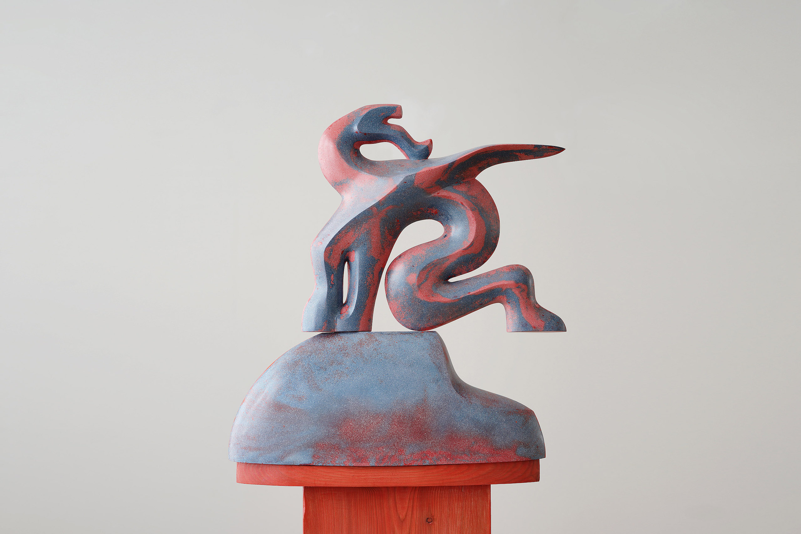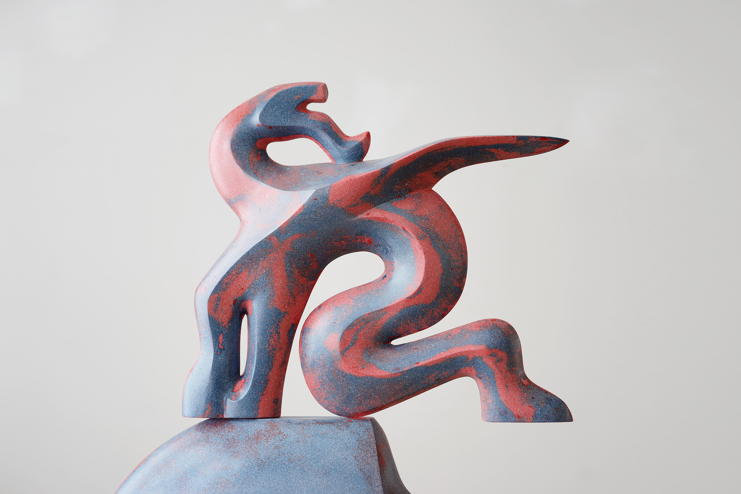 This sculpture suggests the form of a sleeping dragon, its abstract and fluid shapes evoking both serenity and hidden power. The blend of red and blue tones enhances its mystique, as if shifting between fire and shadow.