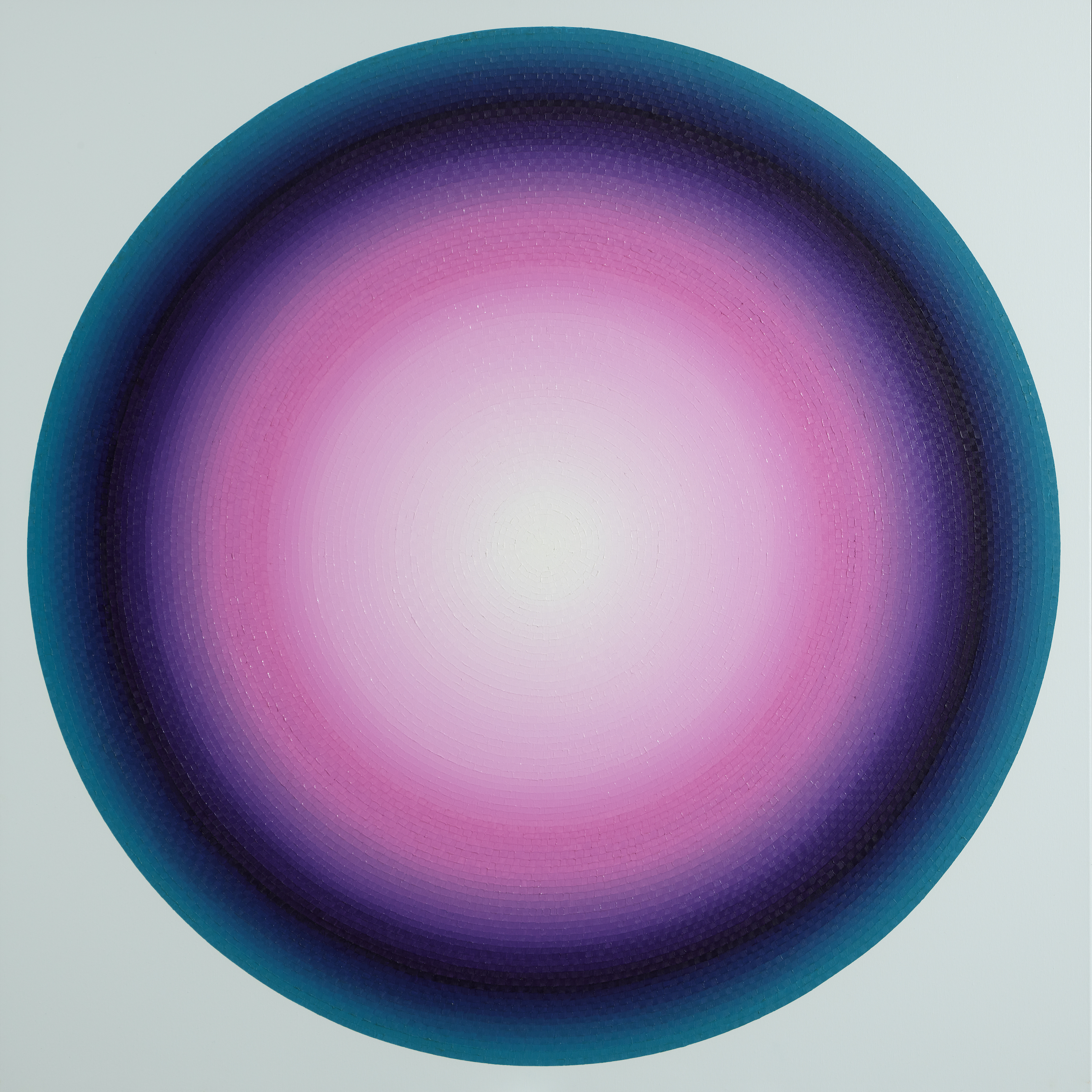 Mathieu Piffeteau works with all colours except red; for this paintings, he used shades of pink, violet and blue. Here, the artist combines two types of paint and techniques, diversifying the texture and reflections on the surface of the work: part is done in oil using his fragmentation technique, while the flat colour is done in acrylic. In this paintings, we can appreciate the two colour gradation techniques used by the artist: the short gradation, which creates a visual effect of luminous ‘blur’, and the long gradation, which creates a visual effect of luminous radiance.