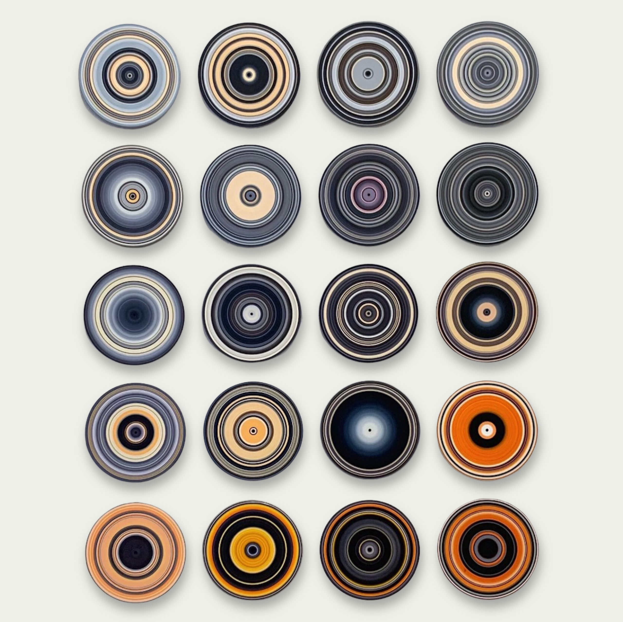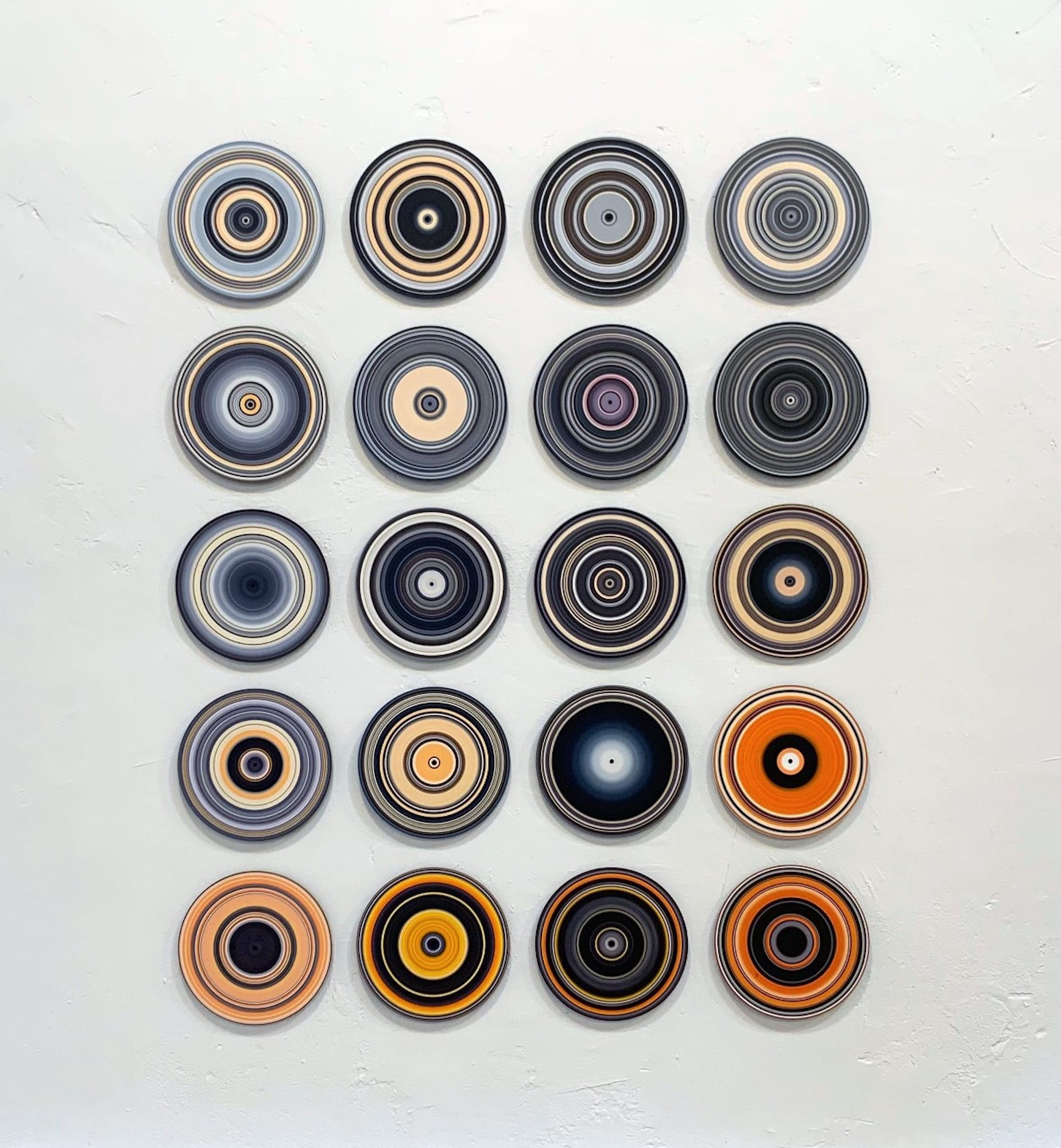 In this last series Sound and Vision, the line remains the only motif of the compositions, but it is illustrated on a new medium which is none other than a vinyl disk. In painting on a turntable, the artist transformed these acoustic data carriers into visual aids: as if the musical pieces are replayed with a brush, in a sort of transformation of sound into image. Individually made in an enduring search for a balance between line, colour and rhythm, these paintings make up an alphabet from which the artist draws on to create different installations and collections.