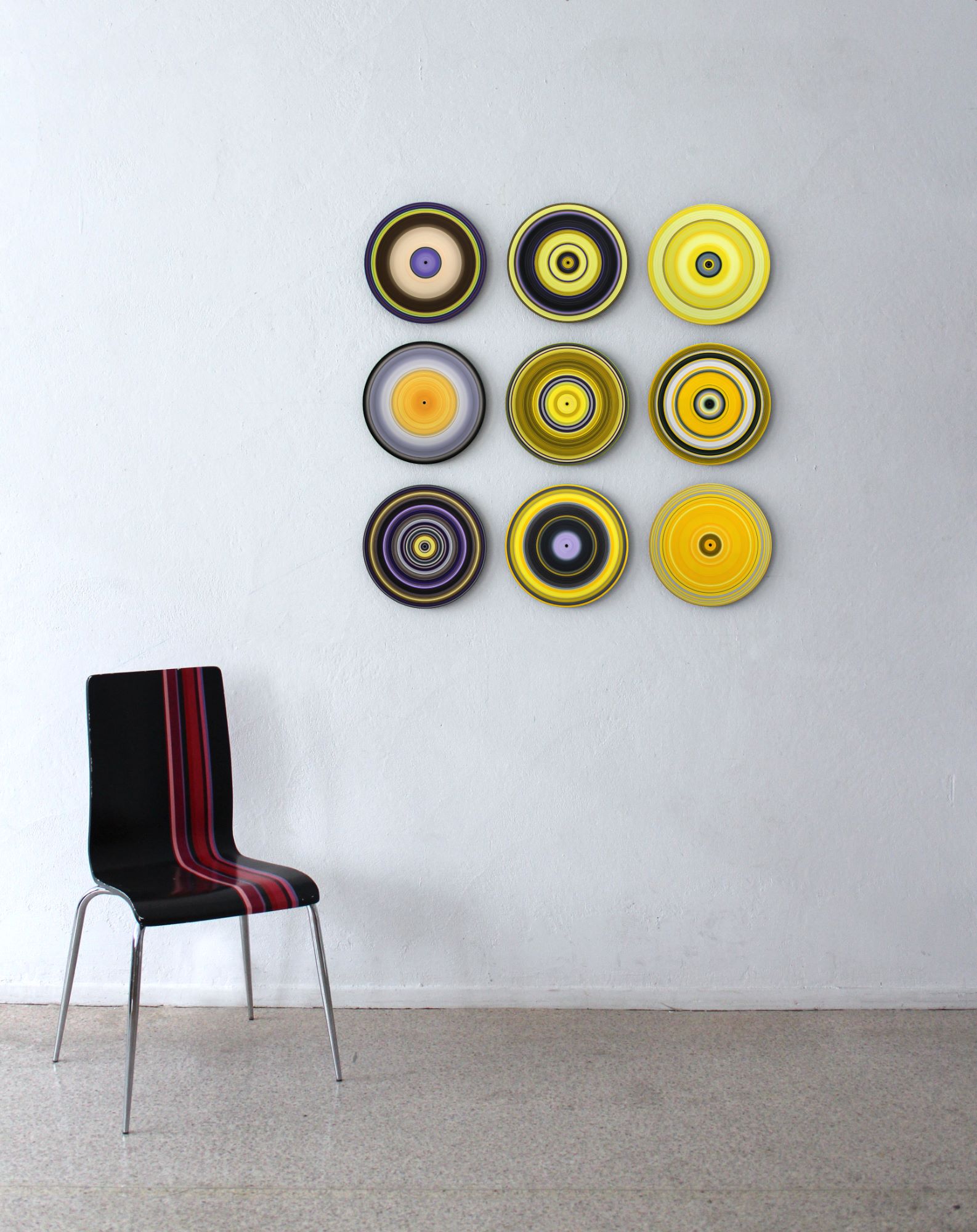 In this last series Sound and Vision, the line remains the only motif of the compositions, but it is illustrated on a new medium which is none other than a vinyl disk. In painting on a turntable, the artist transformed these acoustic data carriers into visual aids: as if the musical pieces are replayed with a brush, in a sort of transformation of sound into image. Individually made in an enduring search for a balance between line, colour and rhythm, these paintings make up an alphabet from which the artist draws on to create different installations and collections.