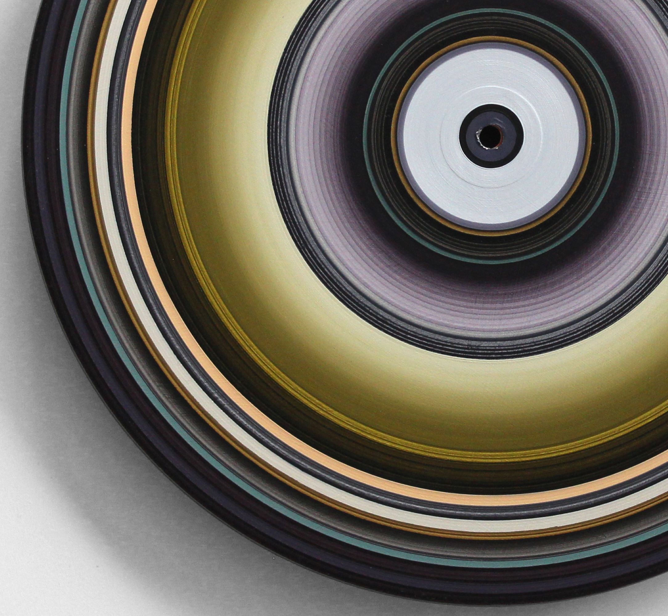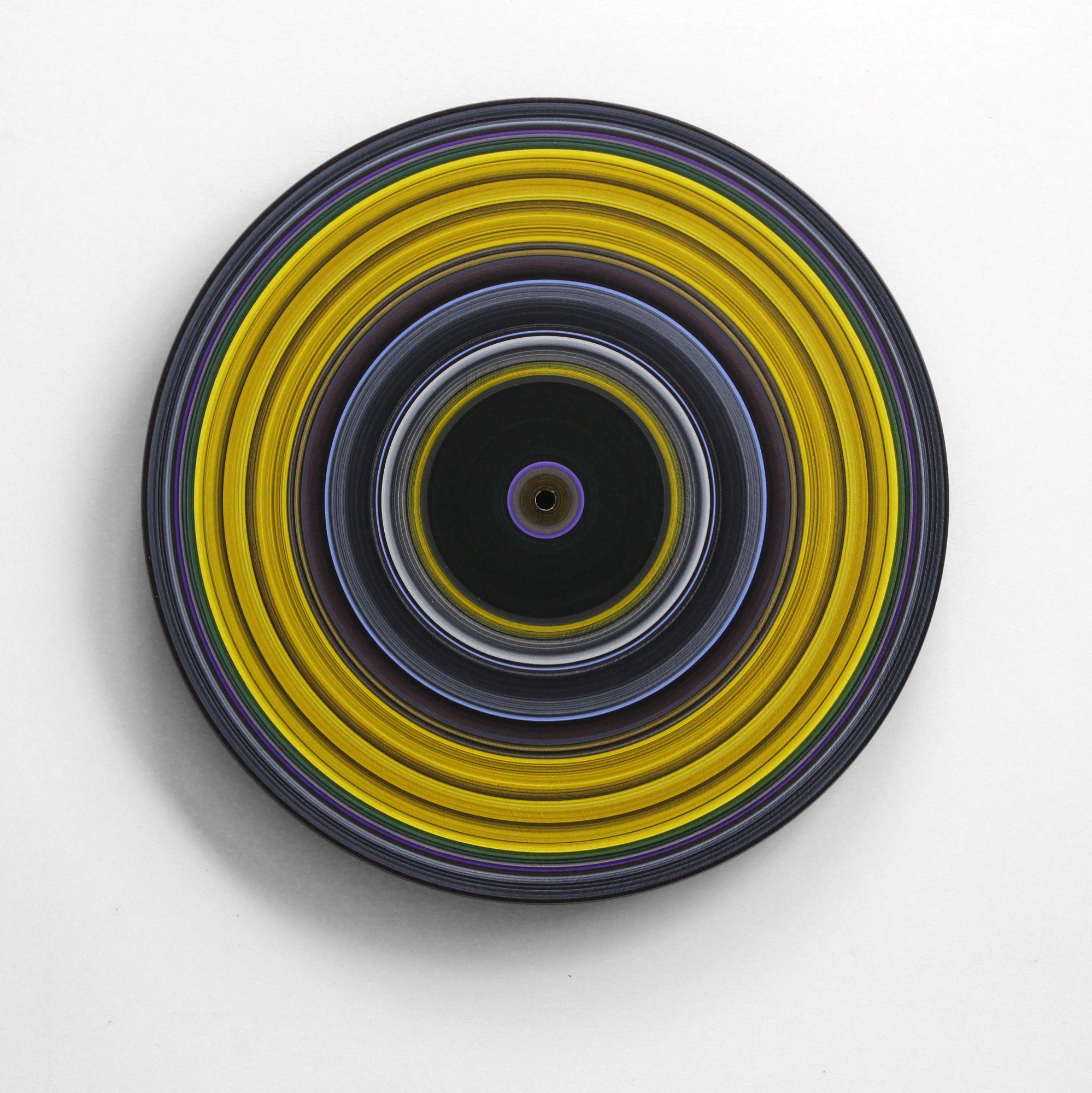 In this last series Sound and Vision, the line remains the only motif of the compositions, but it is illustrated on a new medium which is none other than a vinyl disk. In painting on a turntable, the artist transformed these acoustic data carriers into visual aids: as if the musical pieces are replayed with a brush, in a sort of transformation of sound into image. Individually made in an enduring search for a balance between line, colour and rhythm, these paintings make up an alphabet from which the artist draws on to create different installations and collections.