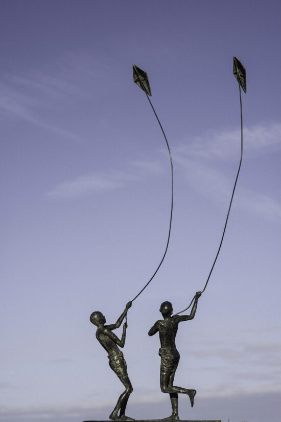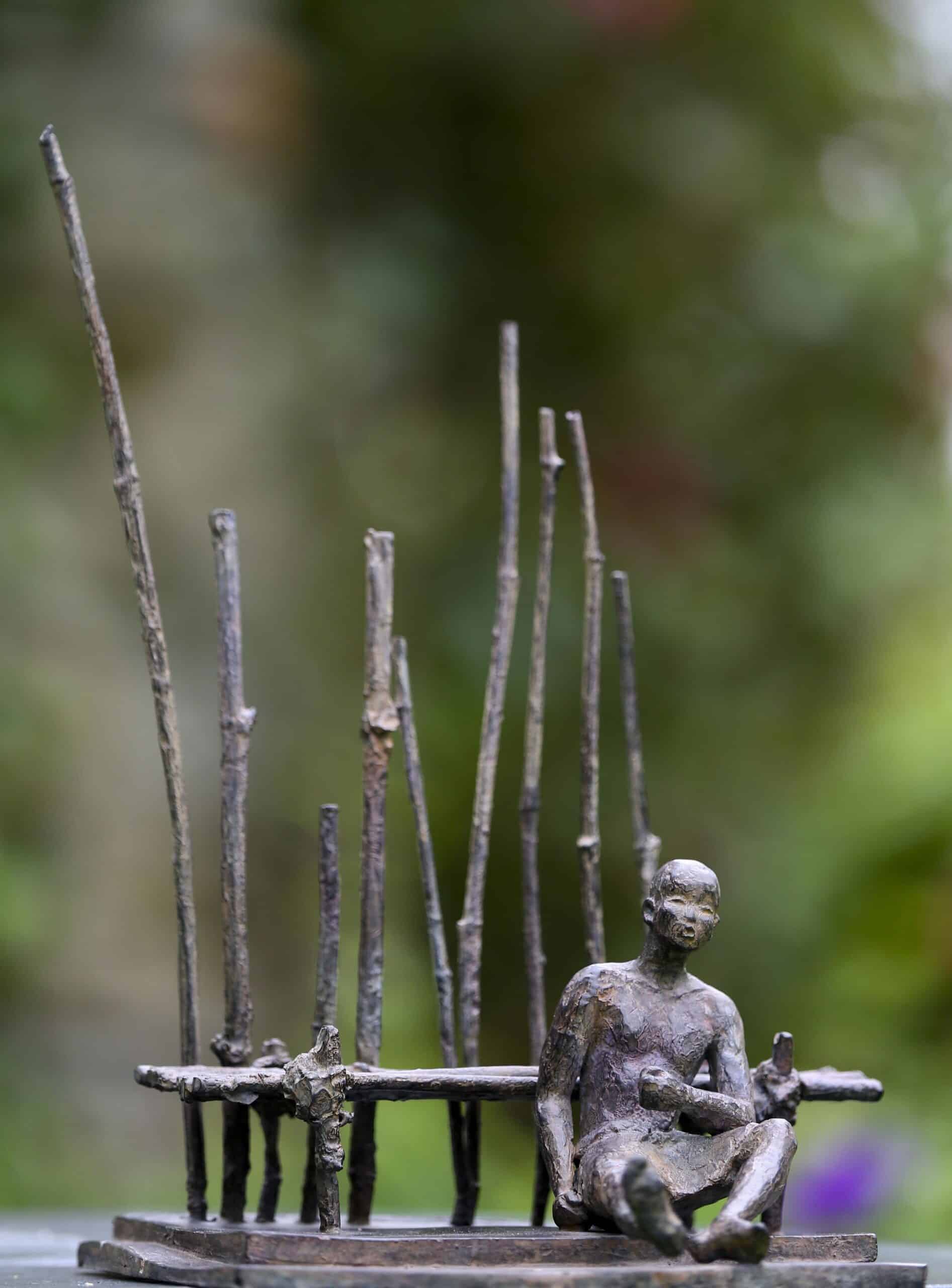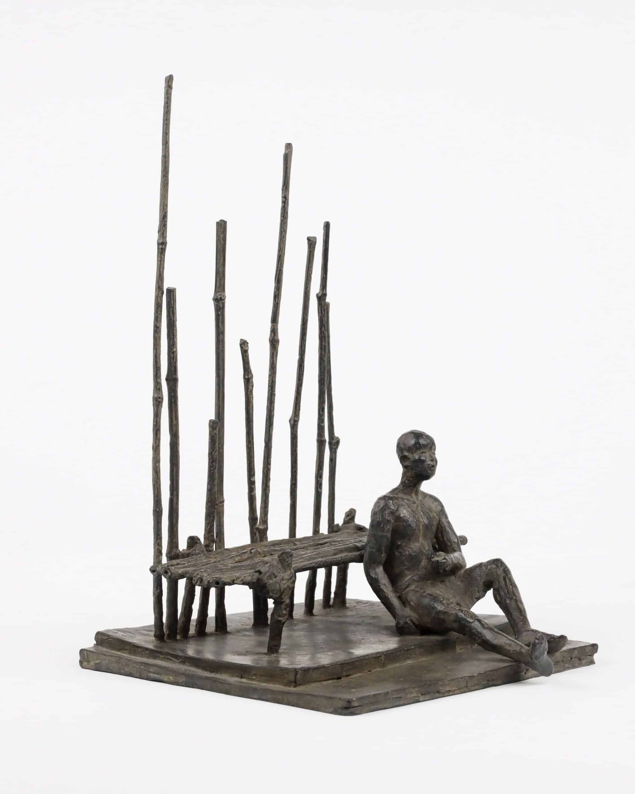 Sous le soleil exactement (Exactly under the sun) is an artwork by French contemporary sculptor Marine de Soos. This bronze sculpture is from the “Figure” series. It is produced in limited edition (8 copies and IV artist’s proofs). This figurative artwork represents a young man sitting with his legs outstretched, wearing only a loin-cloth. He looks as if he is whistling or singing and making the most of the sun. Behind him is a structure made out of poles. The artist gets her inspiration from real or imaginary scenes. This bronze sculpture could be placed in an outside setting.
