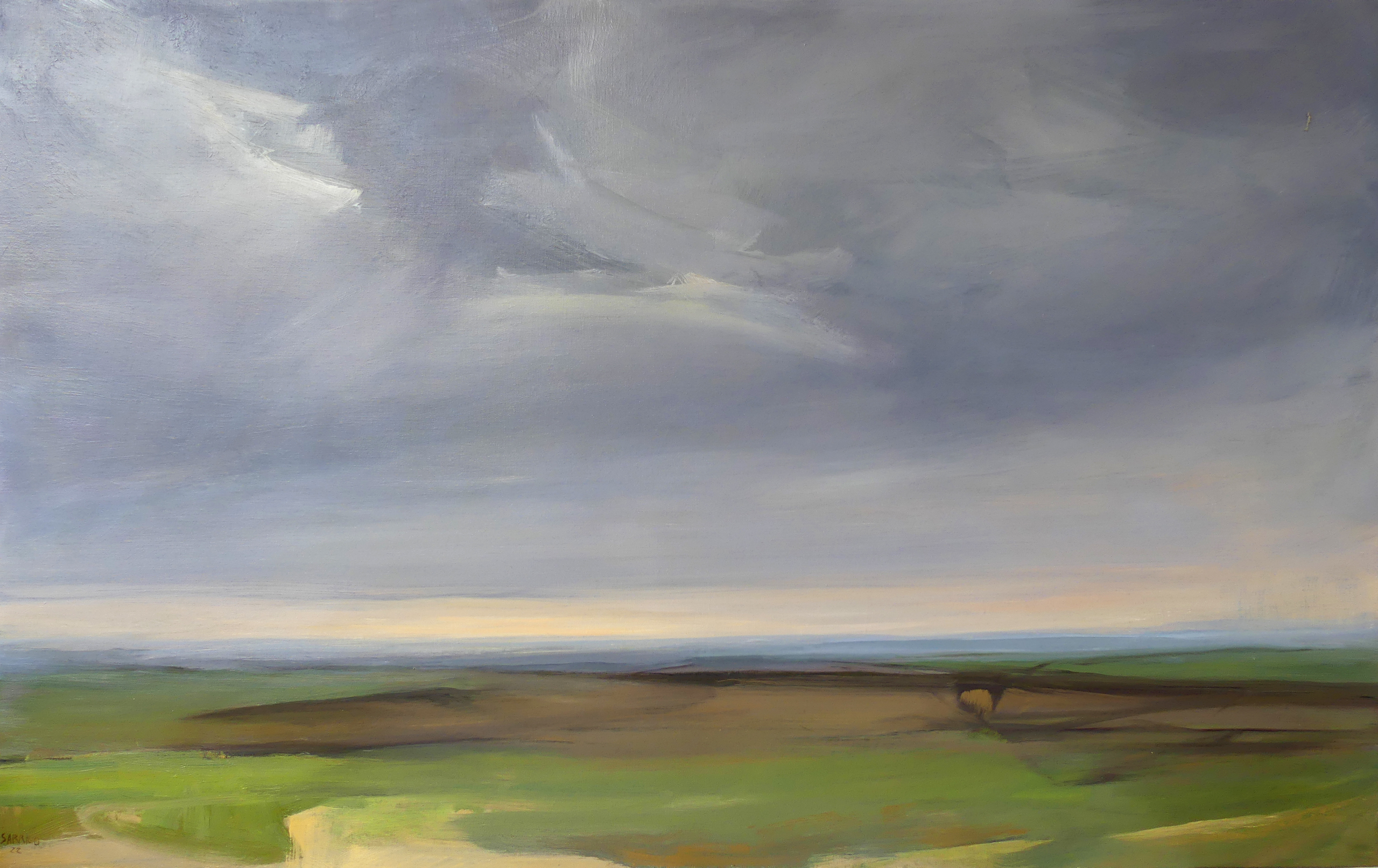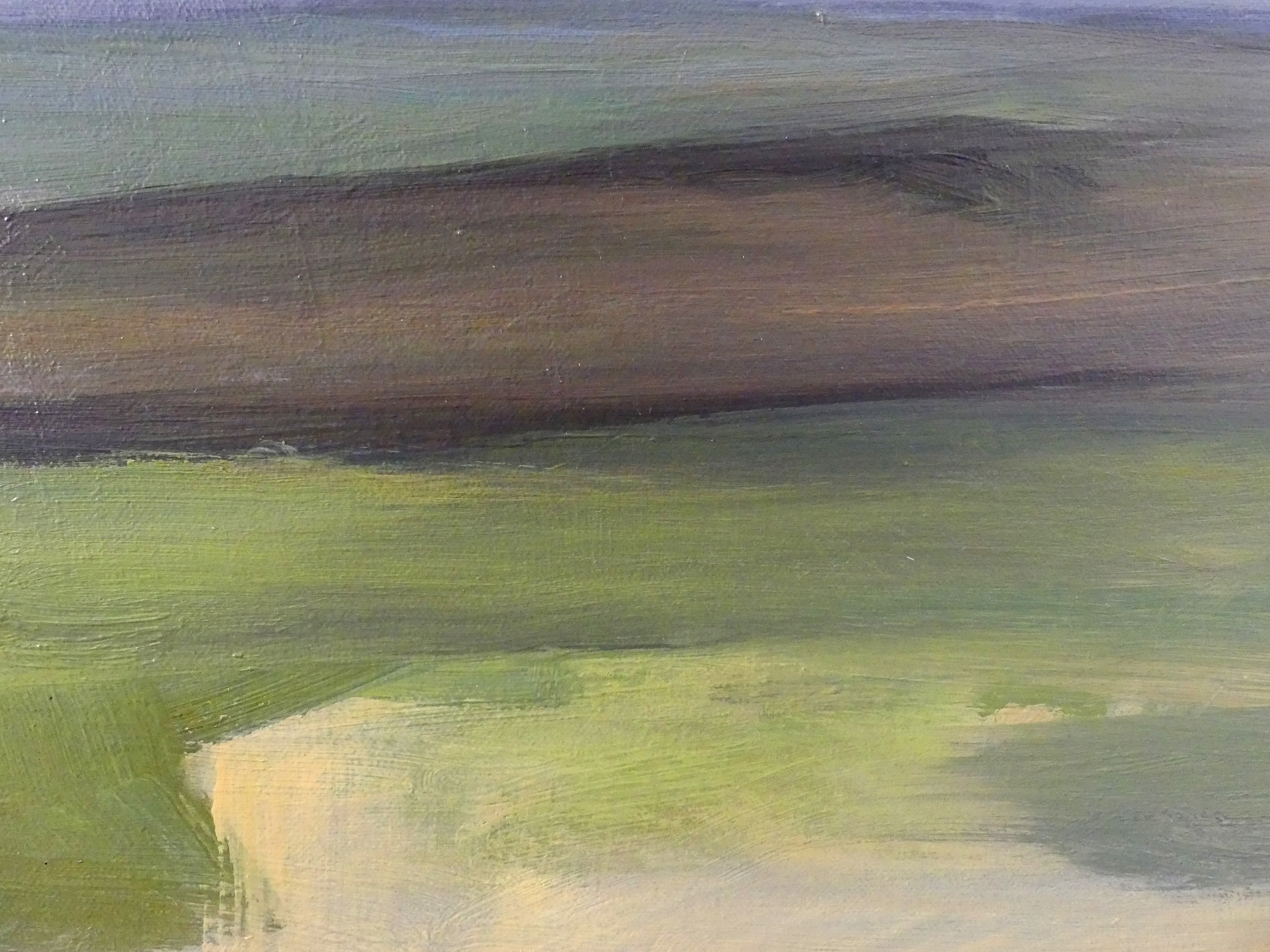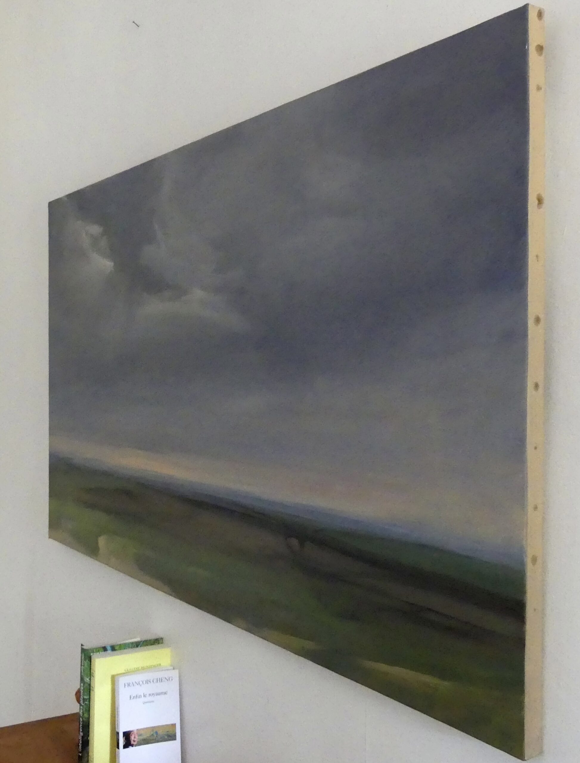 The artist, who manages to represent the way time influences natural landscapes, involves the sky in her compositions. In this artwork, this recurrent pattern shows a light grey and blue stained by numerous clouds, and is straight away confronted to the green elements of nature, which can be seen through the visible brushstrokes of the artist.