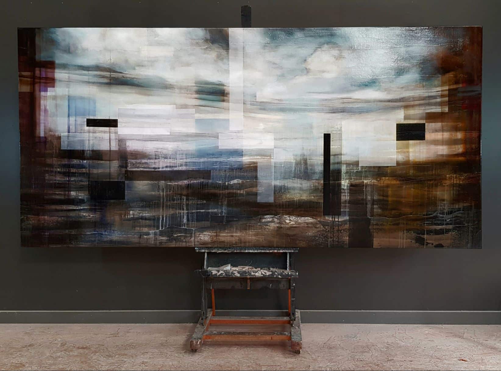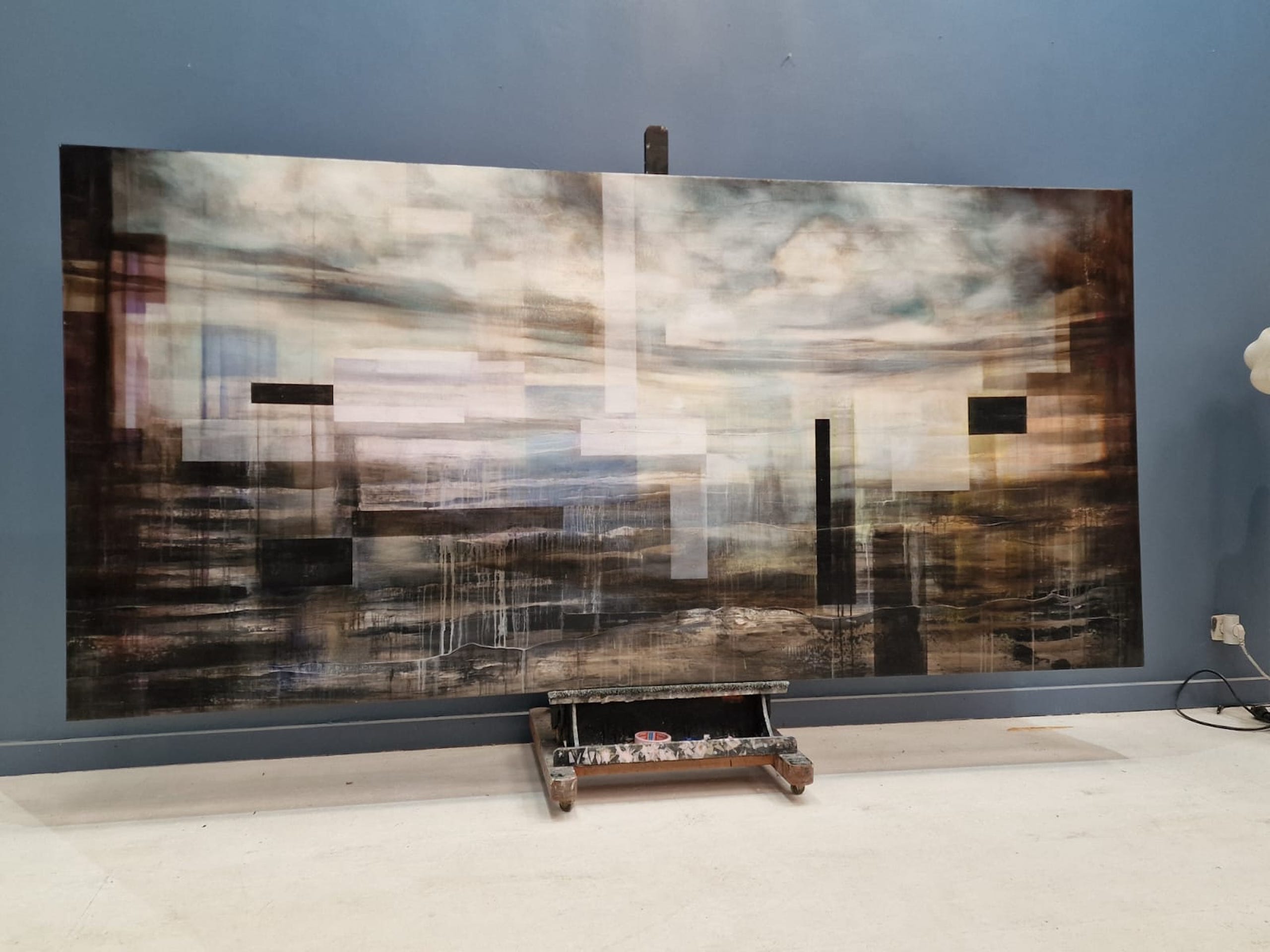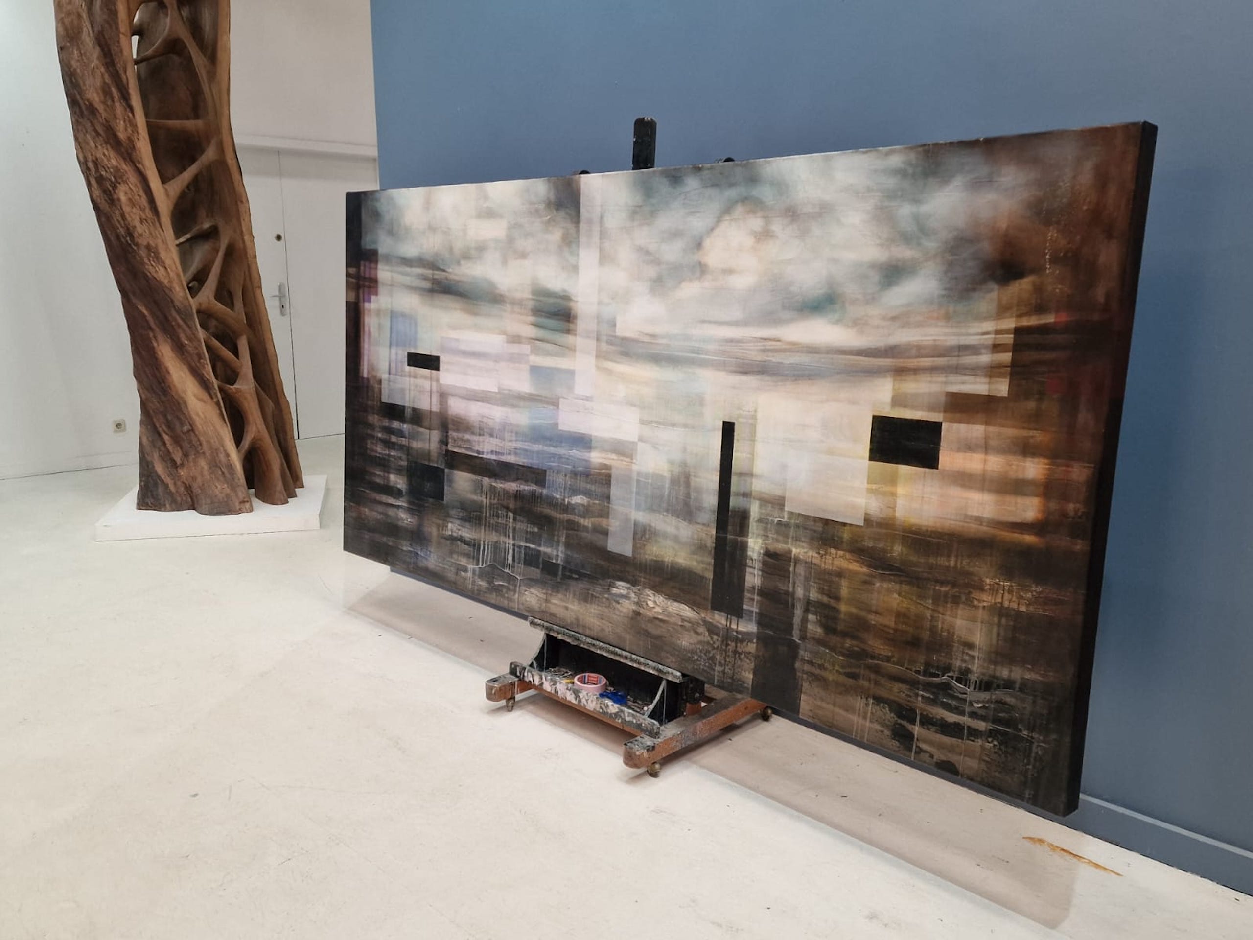 Joachim van der Vlugt’s work is definitively inspired by the great Dutch Masters. Together with a voluntarily restricted palette of colours – black and white, brown, beige and blue, the artist paints a succession of layers. He gradually brings out the nuances and intensity of light, and he sometimes integrates different shapes and geometric forms.