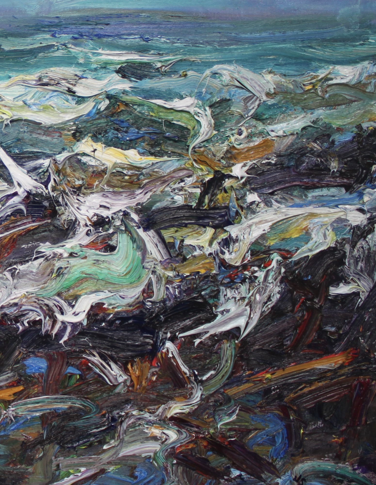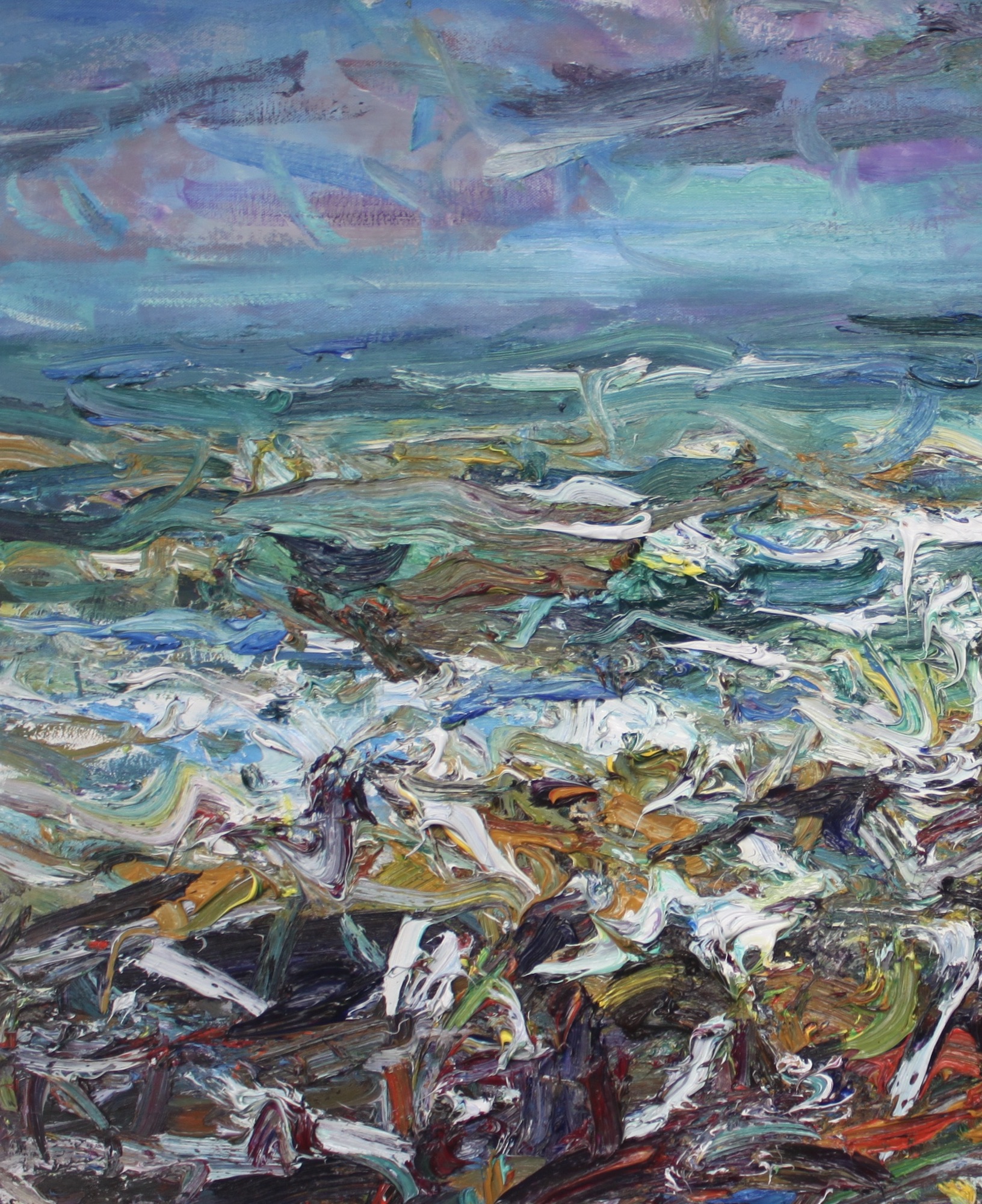 Before painting, Jonathan Shearer totally immerges himself in the wild landscapes and establishes a connection by extensively walking through them, by contemplating them and by visiting them multiple times. On site he draws small oil sketches and takes digital photographs, which he uses as a reference for the final artworks that he paints later at the studio. His way of painting at the studio is strongly gestural and vigorous, causing sometimes the paint to run and drip on the surface.