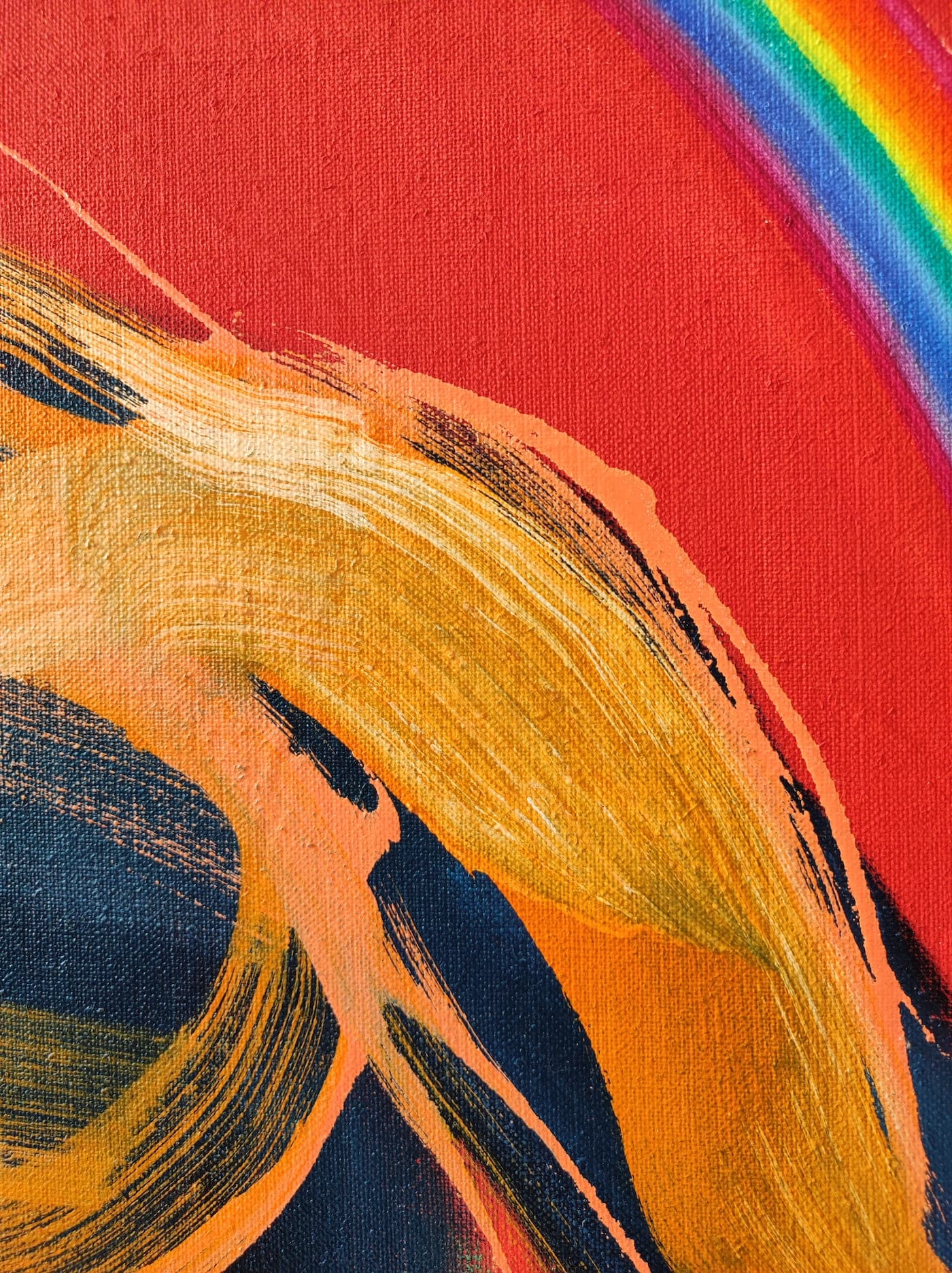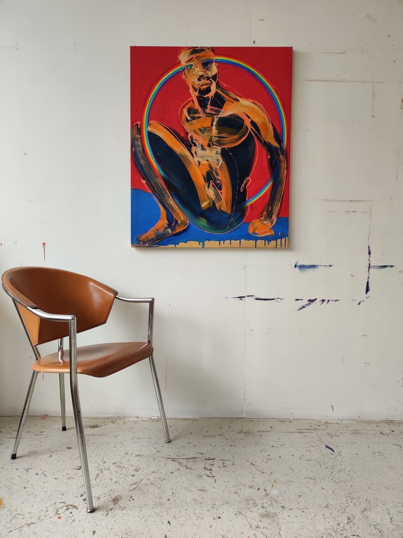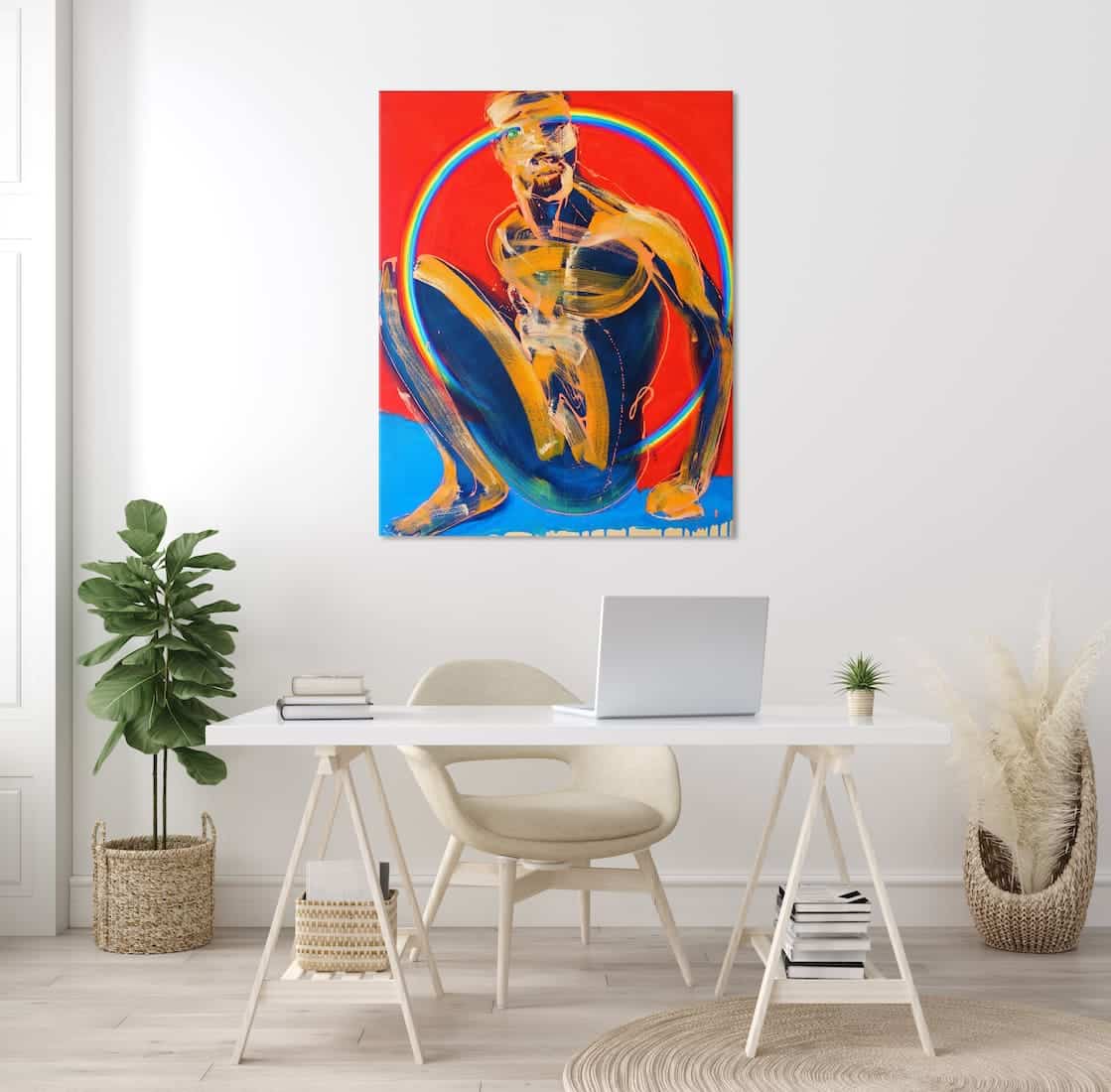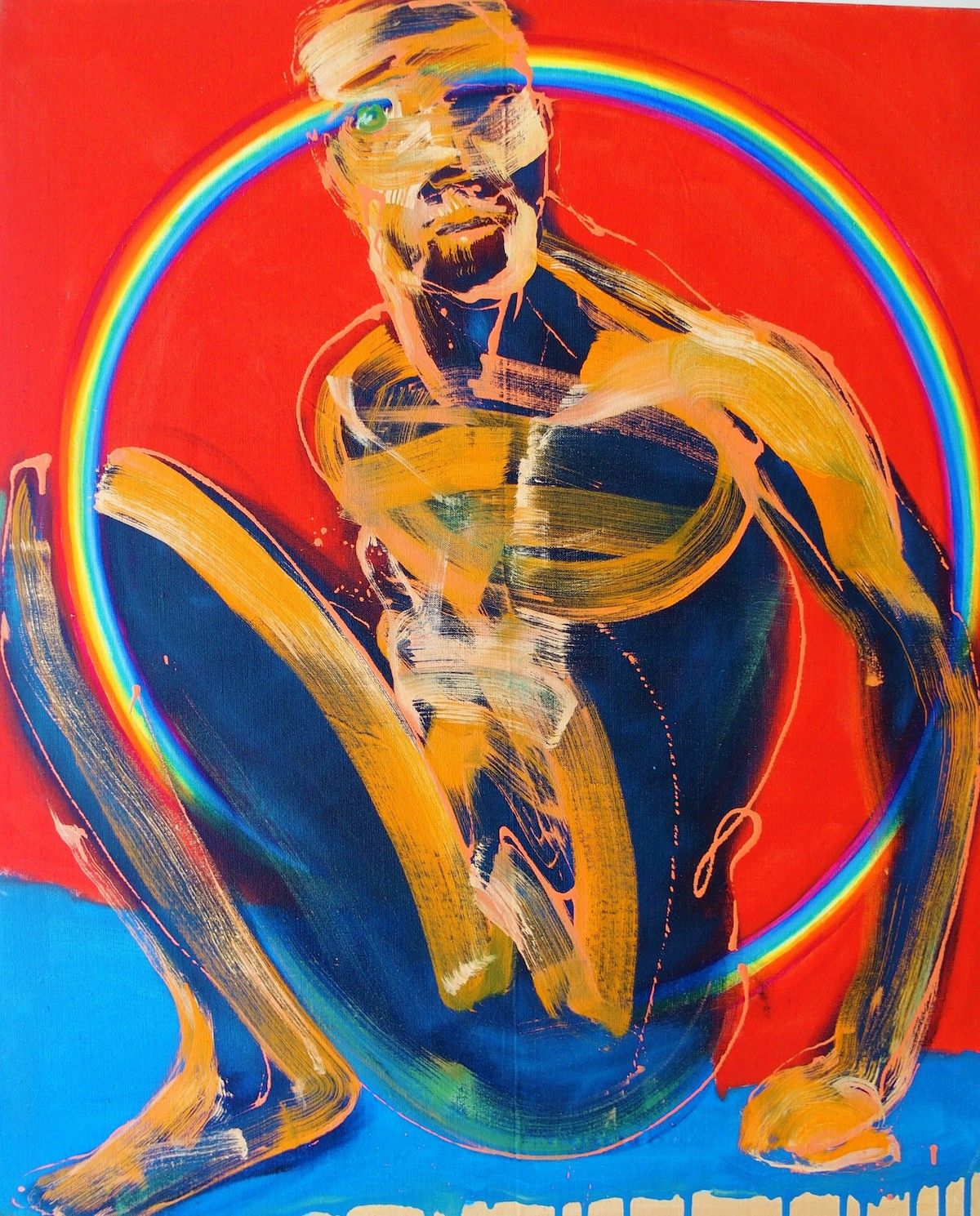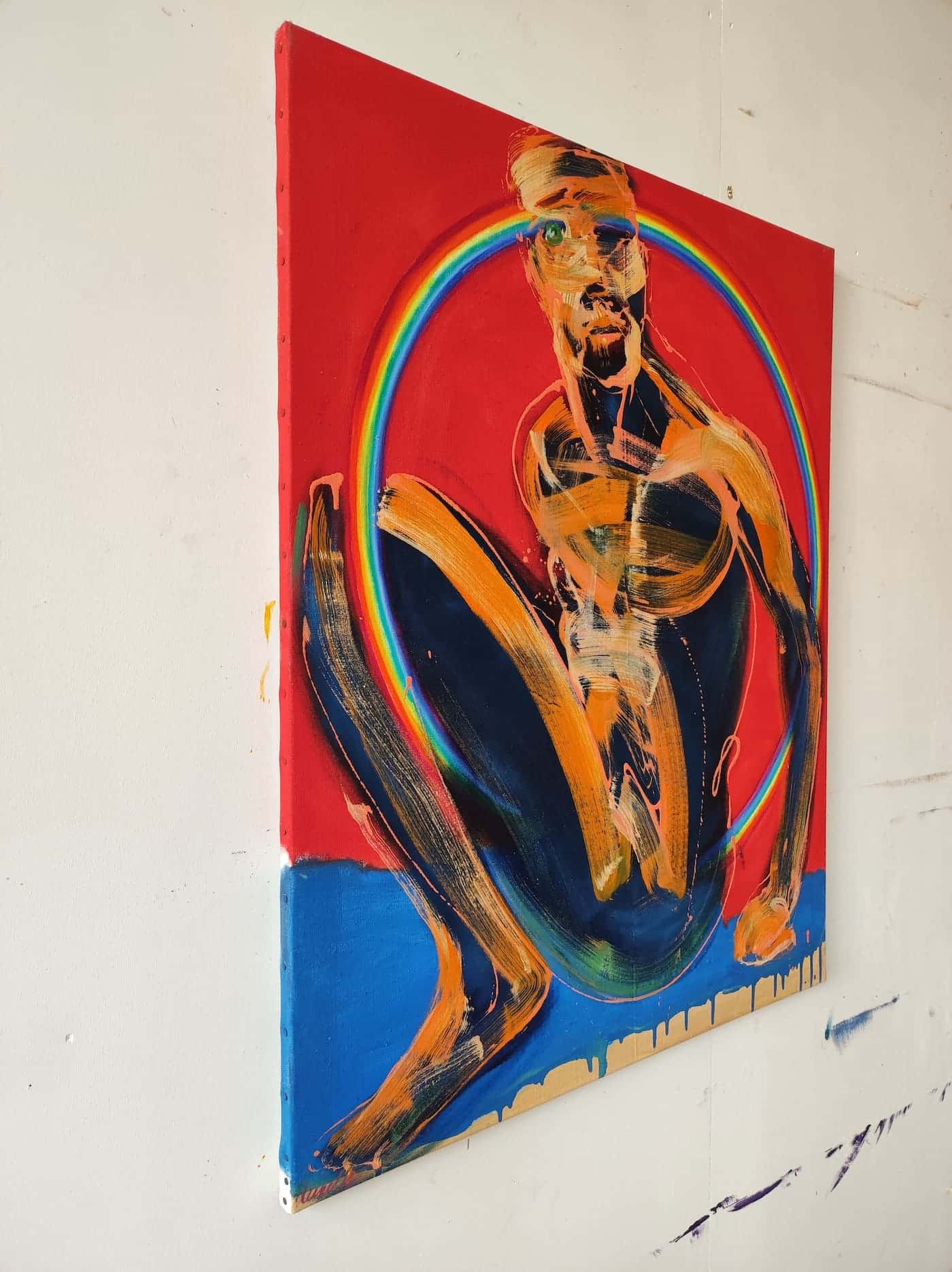 In the sun is a painting by French contemporary artist Christophe Dupety. The paintings’ warm colours are linked to the title, ‘Full Sun’ (Plein Soleil), and the rainbow surrounding the figure.