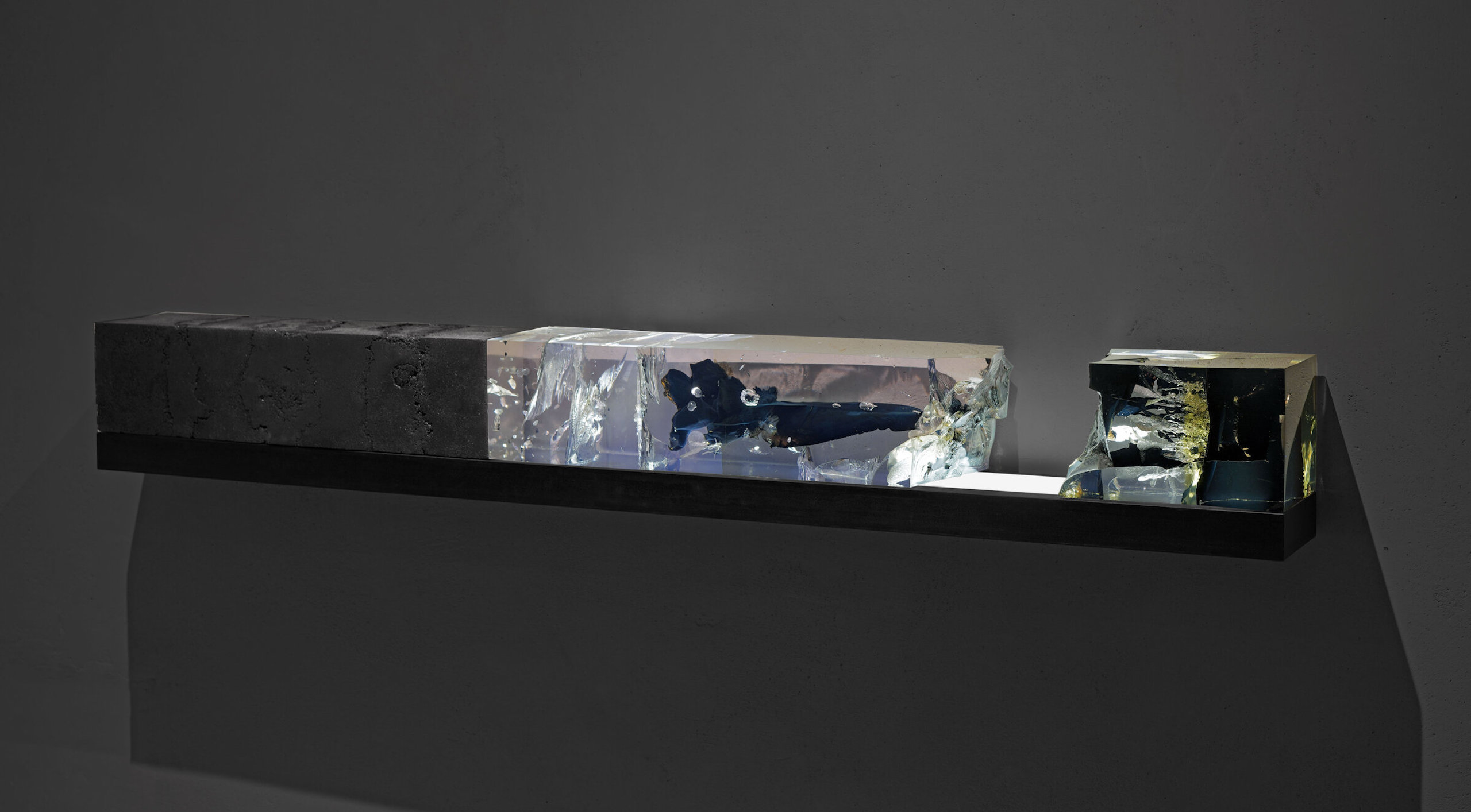 In the Synthesis series, Tom Price forces resin and tar to live in the same space, experimenting with the chemical reactions through heating materials and catalysis process. As the tar fragments inserted into the resin blocks widen, they develop fissures, voids and cracks, modifying the original appearance, colour and characteristics of the resin. A new element is now created by the synthesis of the two.
