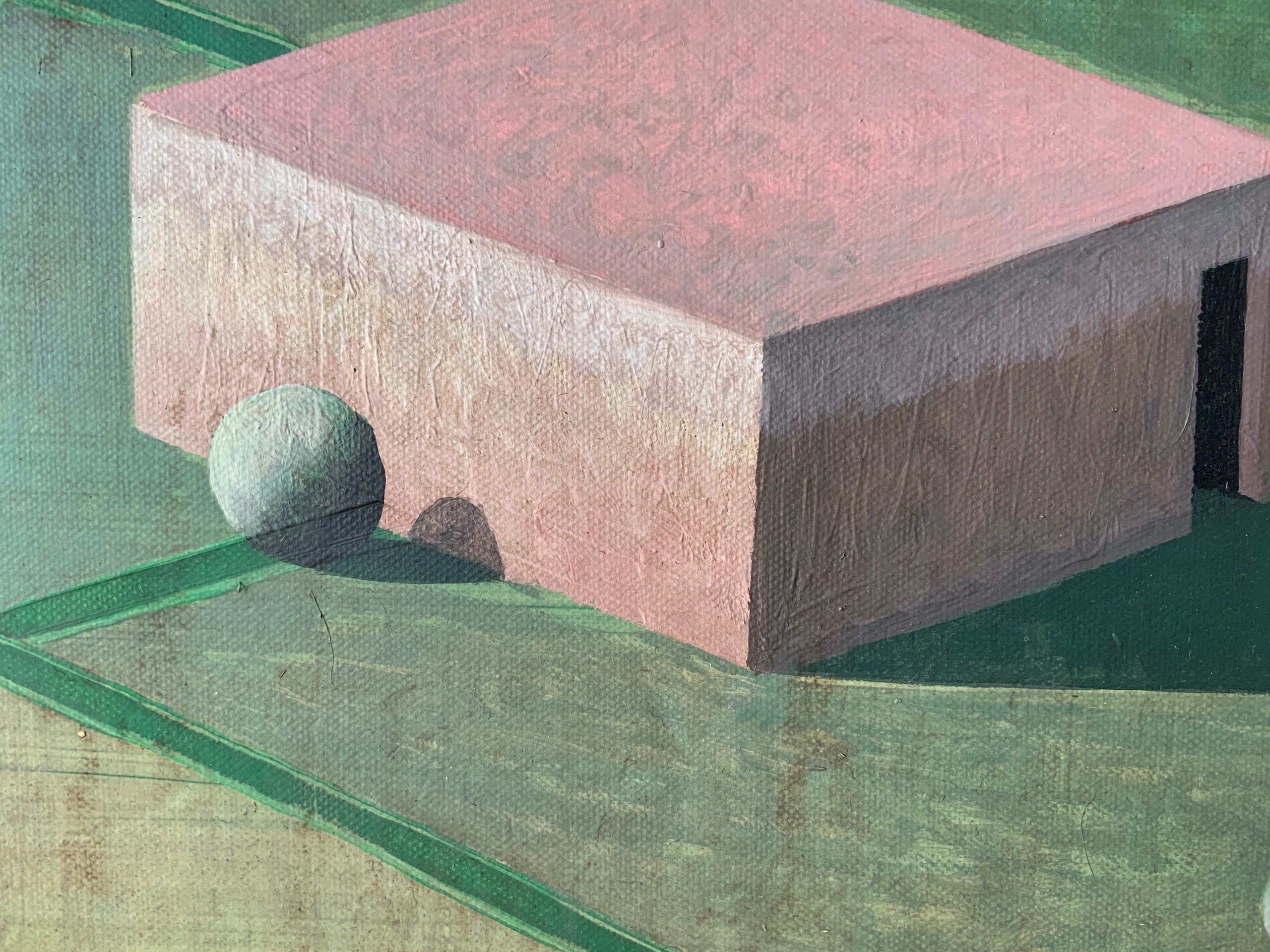 In these paintings, the artist establishes a conversation between architecture and landscape in a figurative work boasting geometric shapes and an enigmatic atmosphere. The landscapes and the simplicity of the forms (nearly abstract) make for a very theatrical view of architecture.