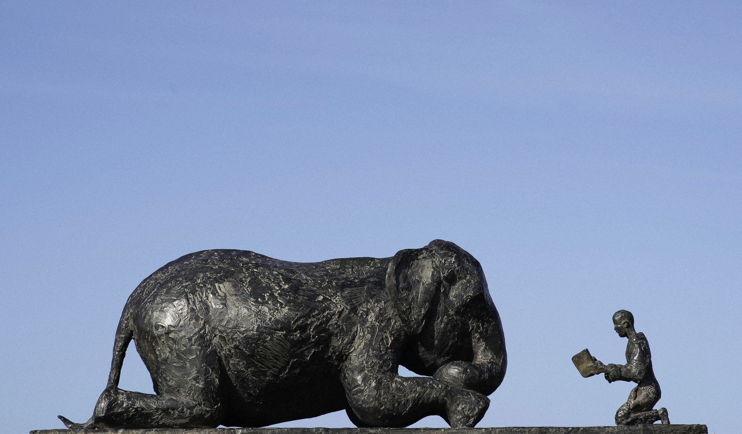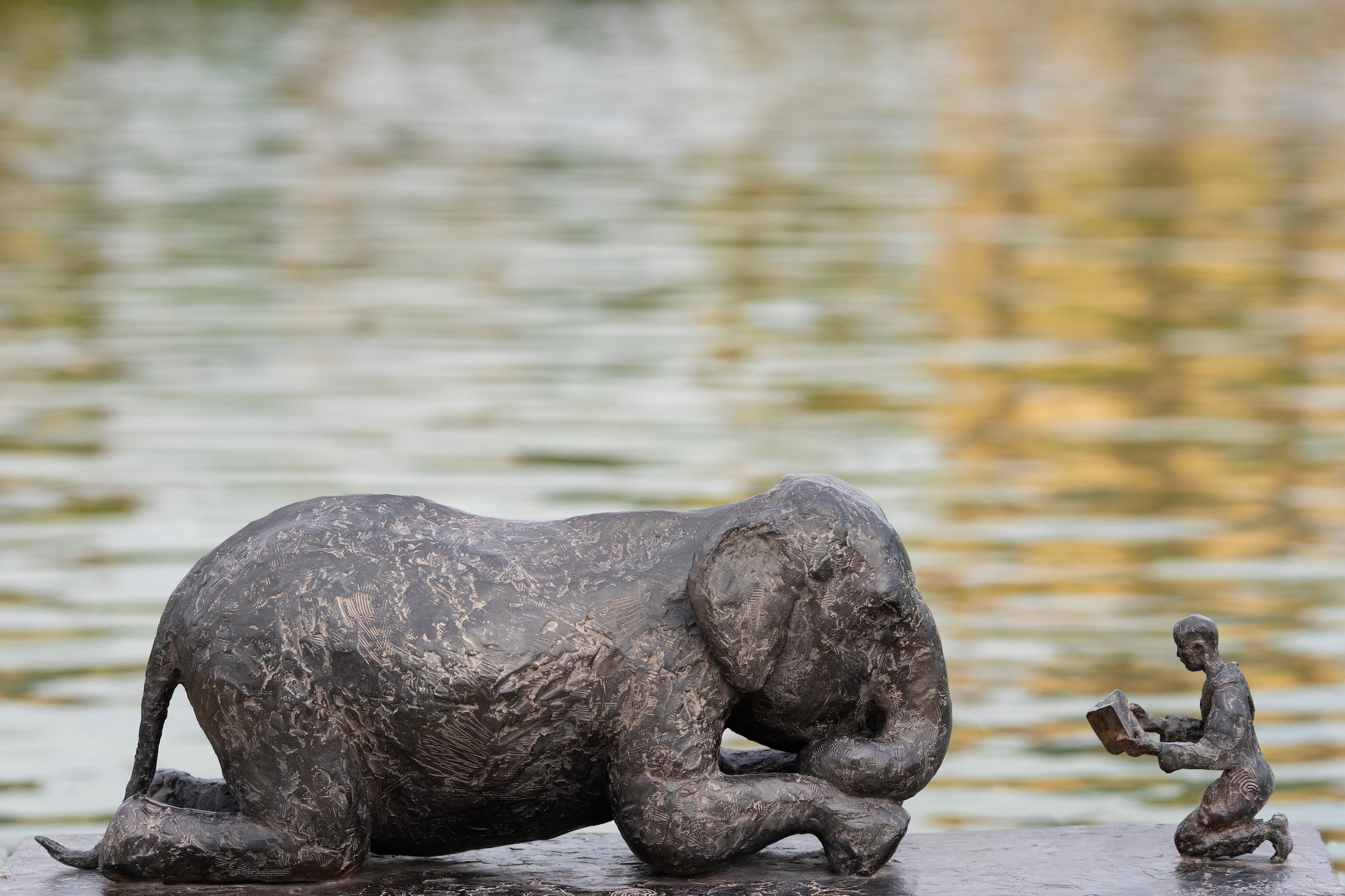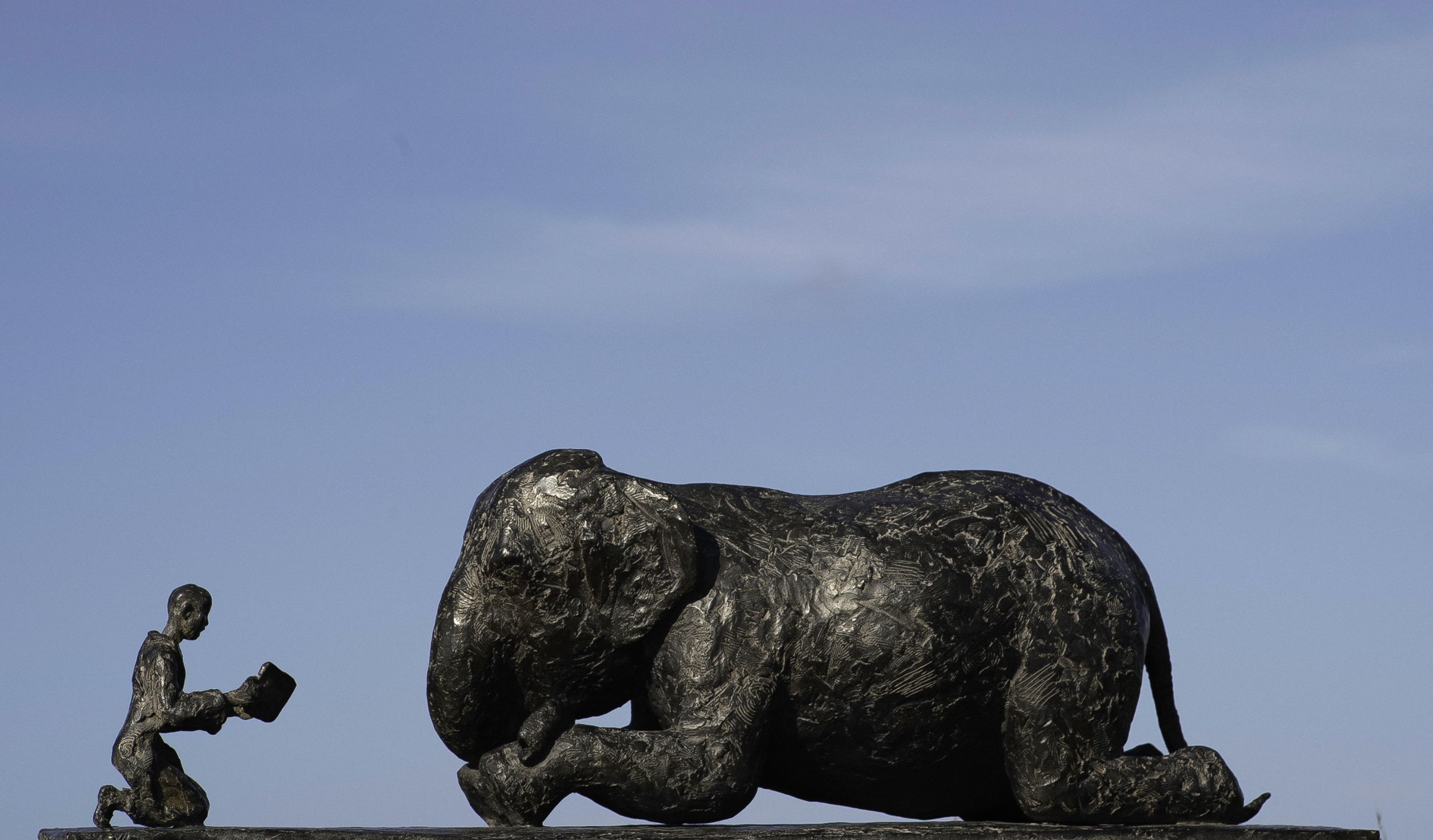 The Book of Ganesh II, Tribute to Gregory Colbert is an artwork by French contemporary sculptor Marine de Soos. This sculpture presents an elephant lying down and a man with a book kneeling beside it. Ganesh is one of the most worshipped Hindu deities, represented with an elephant head. This artwork is a tribute to the work of Canadian filmmaker and photographer Gregory Colbert, emphasizing the bond between humans and animals.