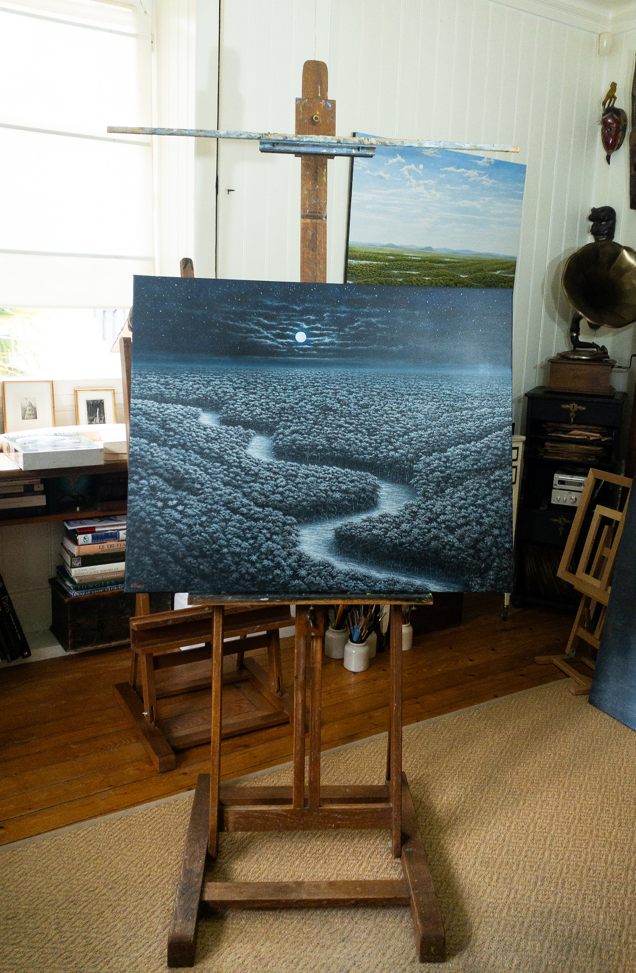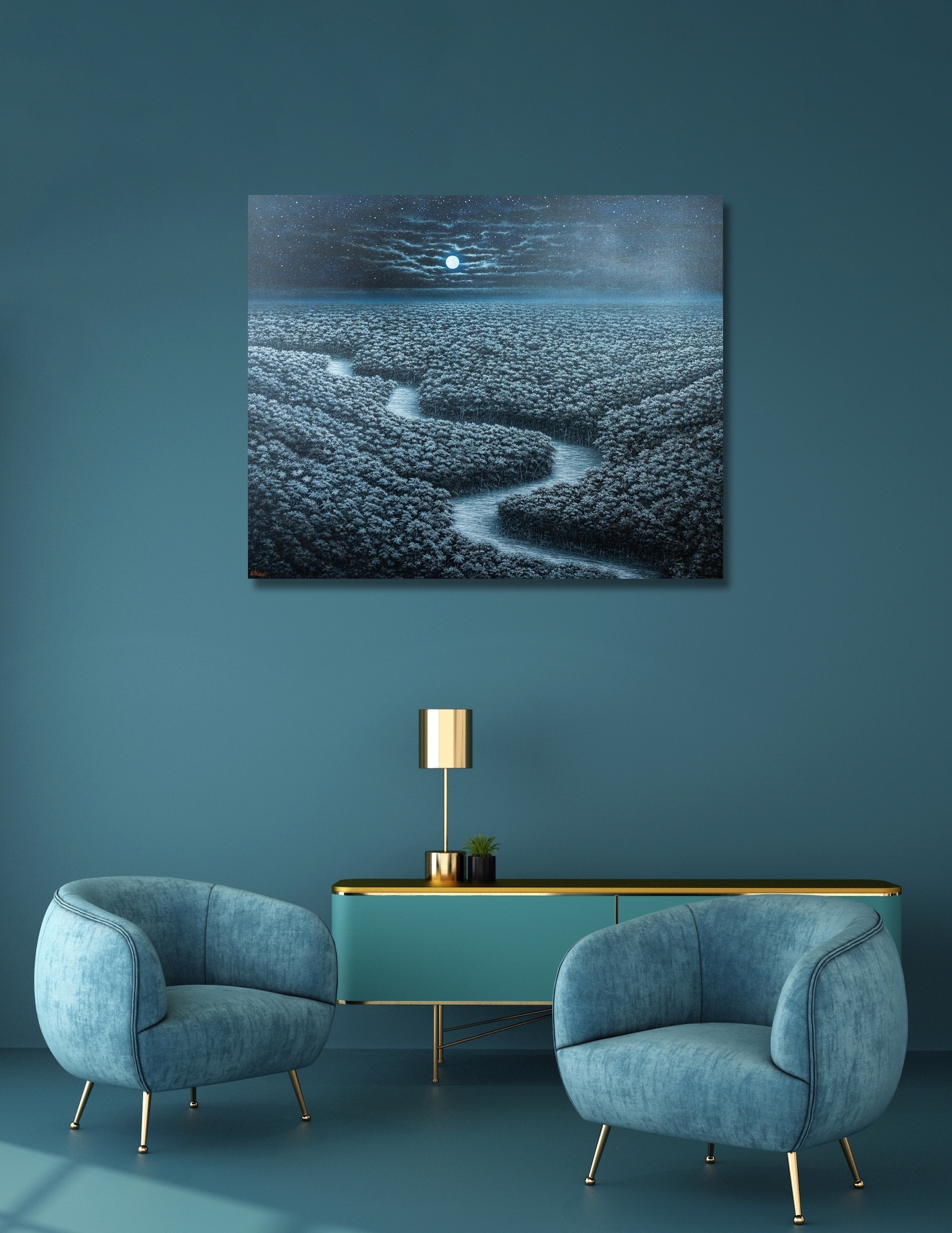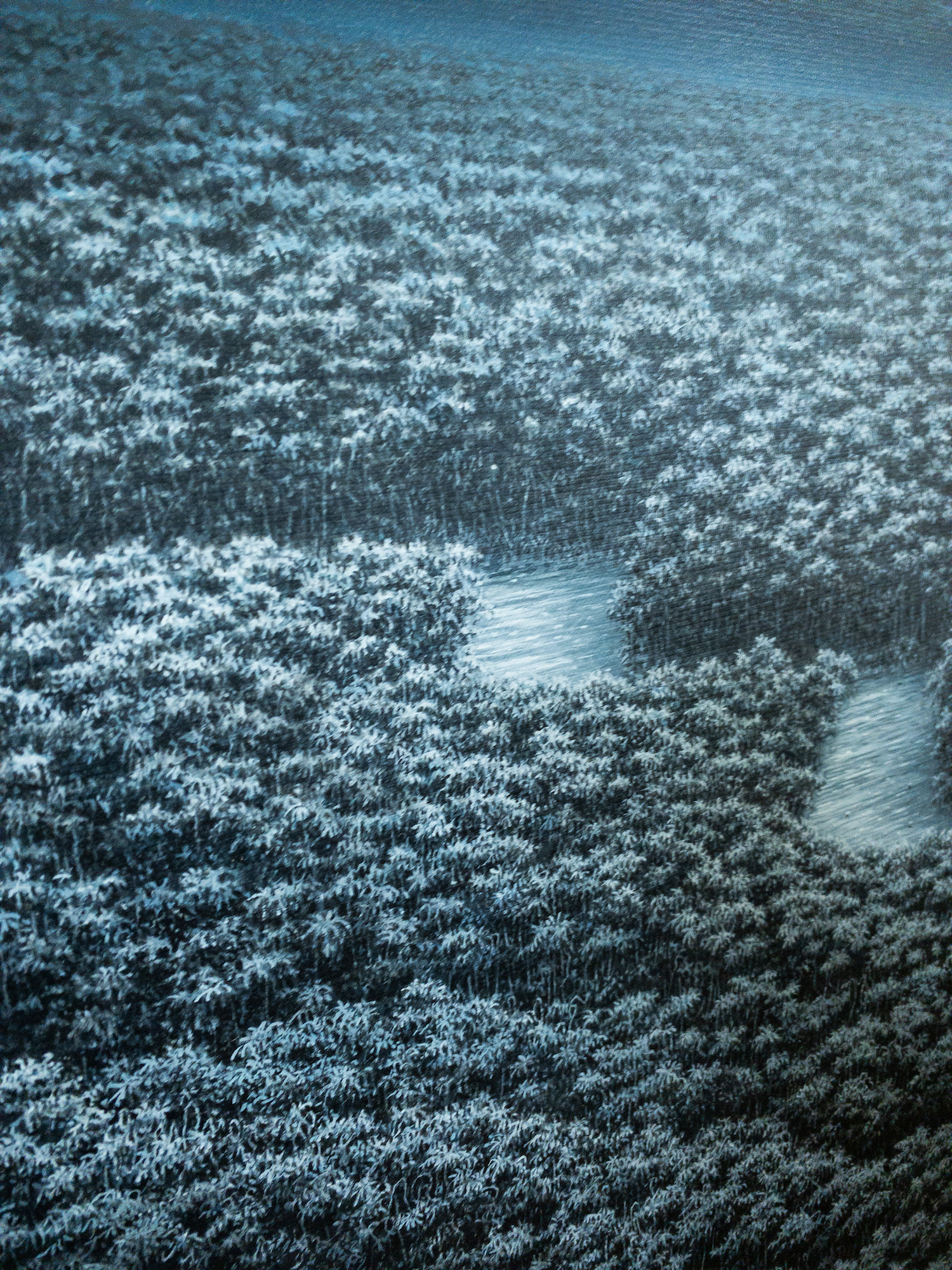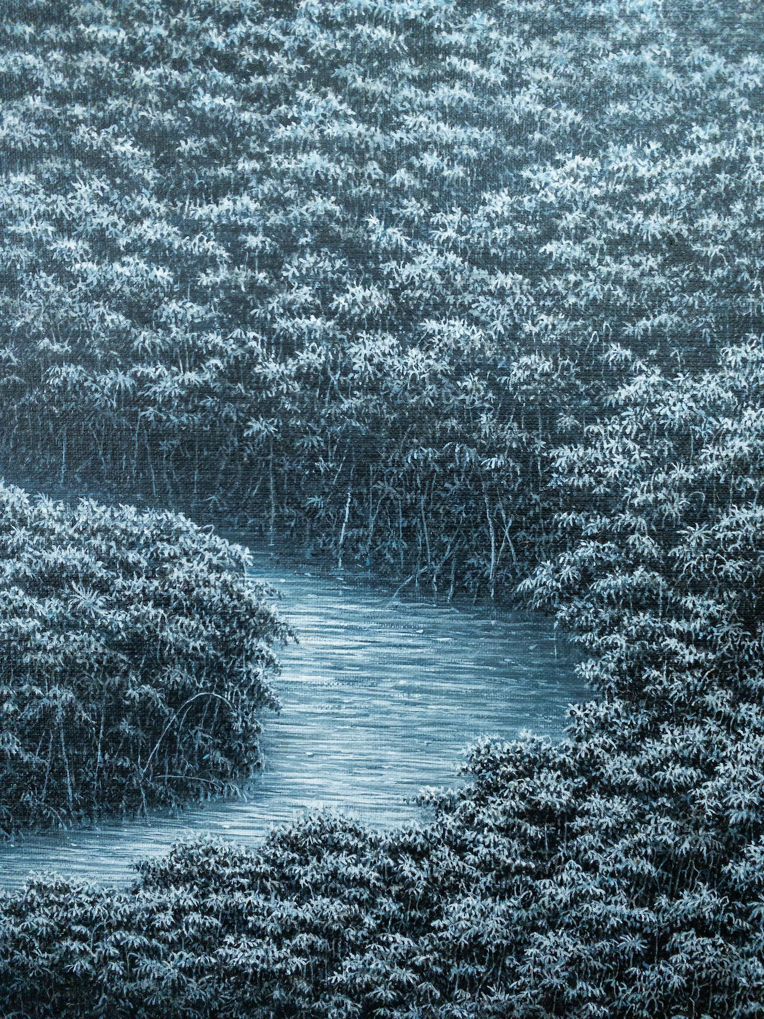 Using a precise and meticulous technique, the artist builds up the landscape tree by tree, leaf by leaf. For him, the creative process is also an inner adventure, in which time no longer exists. The painter brings the painting to life but then allows himself to be transported and guided by the work itself, which suggests how it should be composed. This timelessness in creation is reflected in his works: are we in the present, the future or the past?