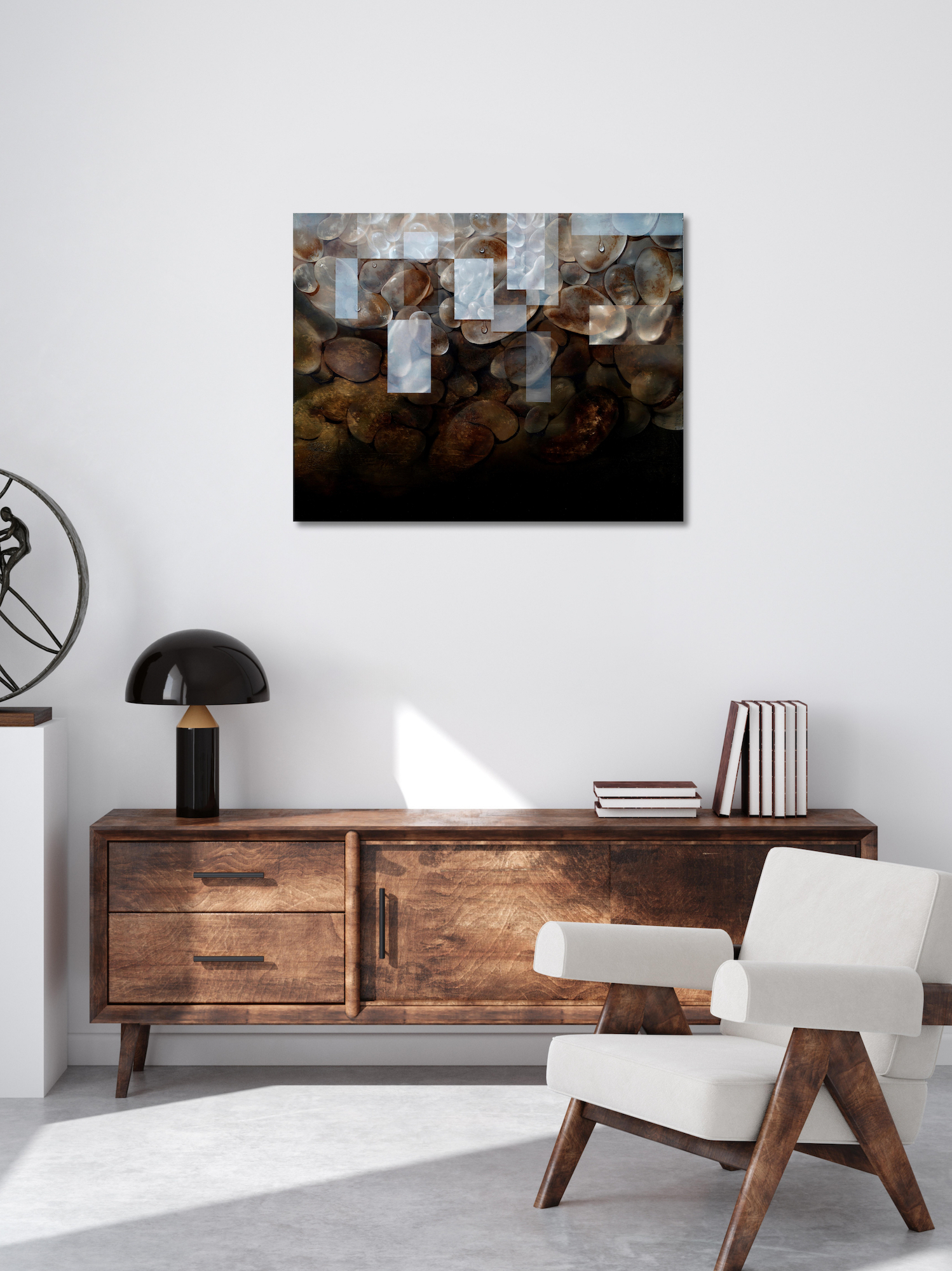 The Cell I is a painting on wood by Dutch contemporary artist Joachim van der Vlugt. In this painting, the artist portrays stones gently illuminated beneath clear water. However, the title of the work suggests to the viewer another subject: cells. As usual in the artist’s painting, the representation oscillates between figuration and abstraction.