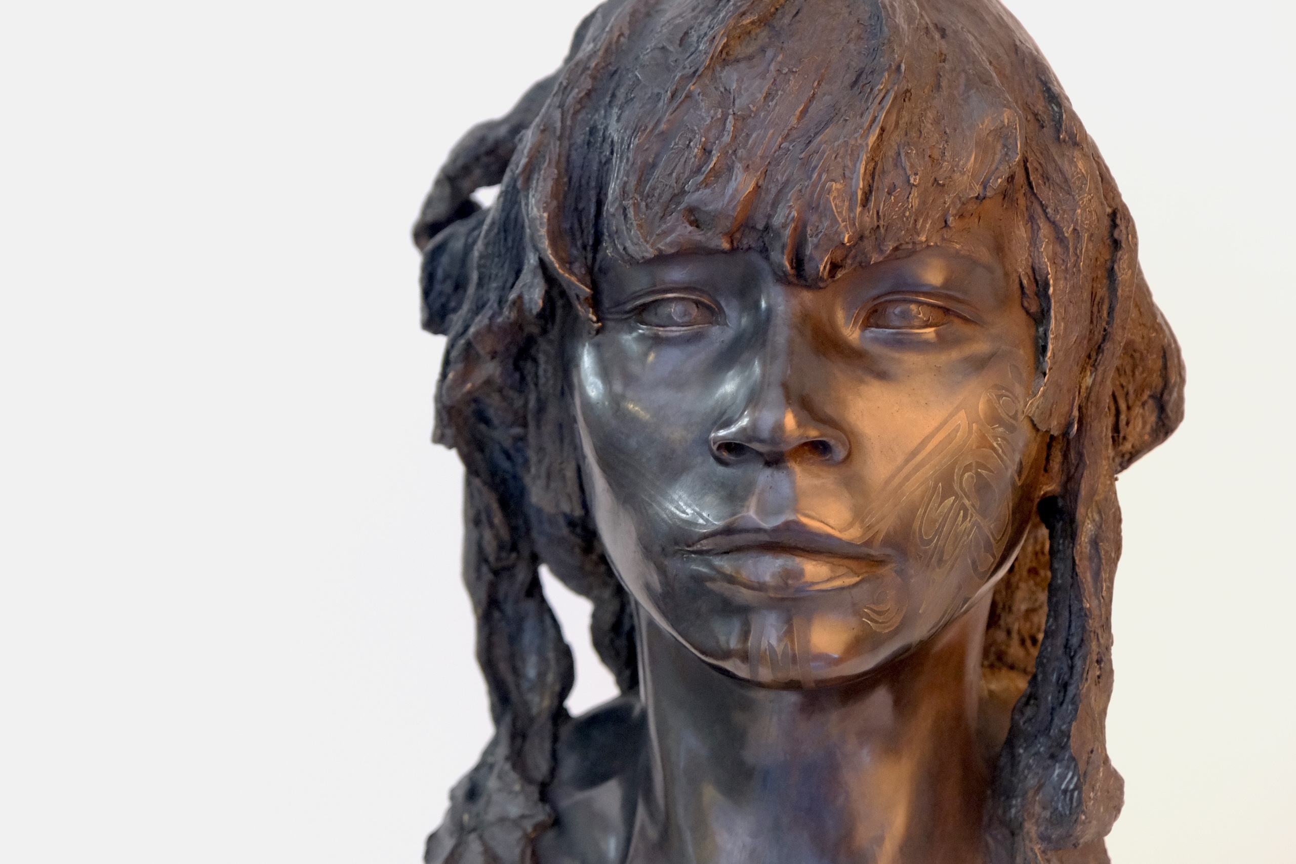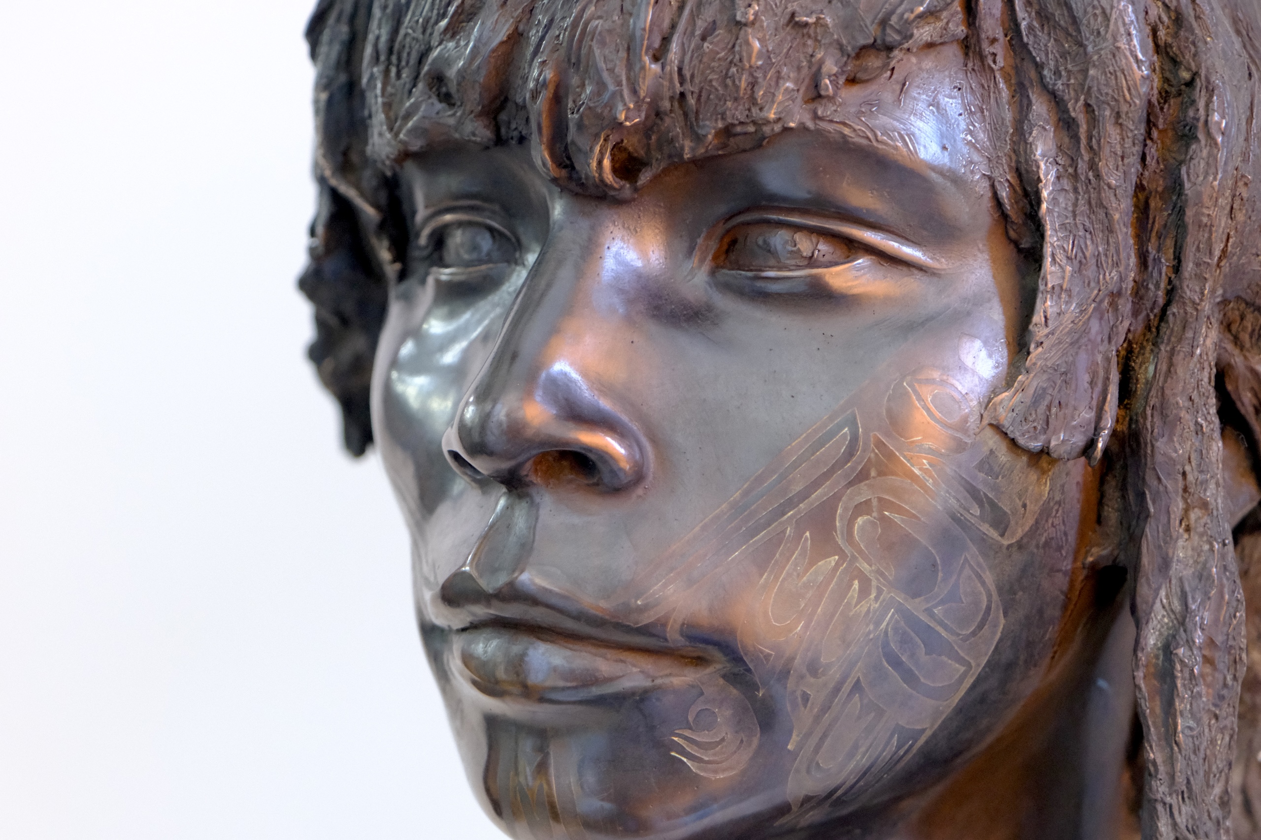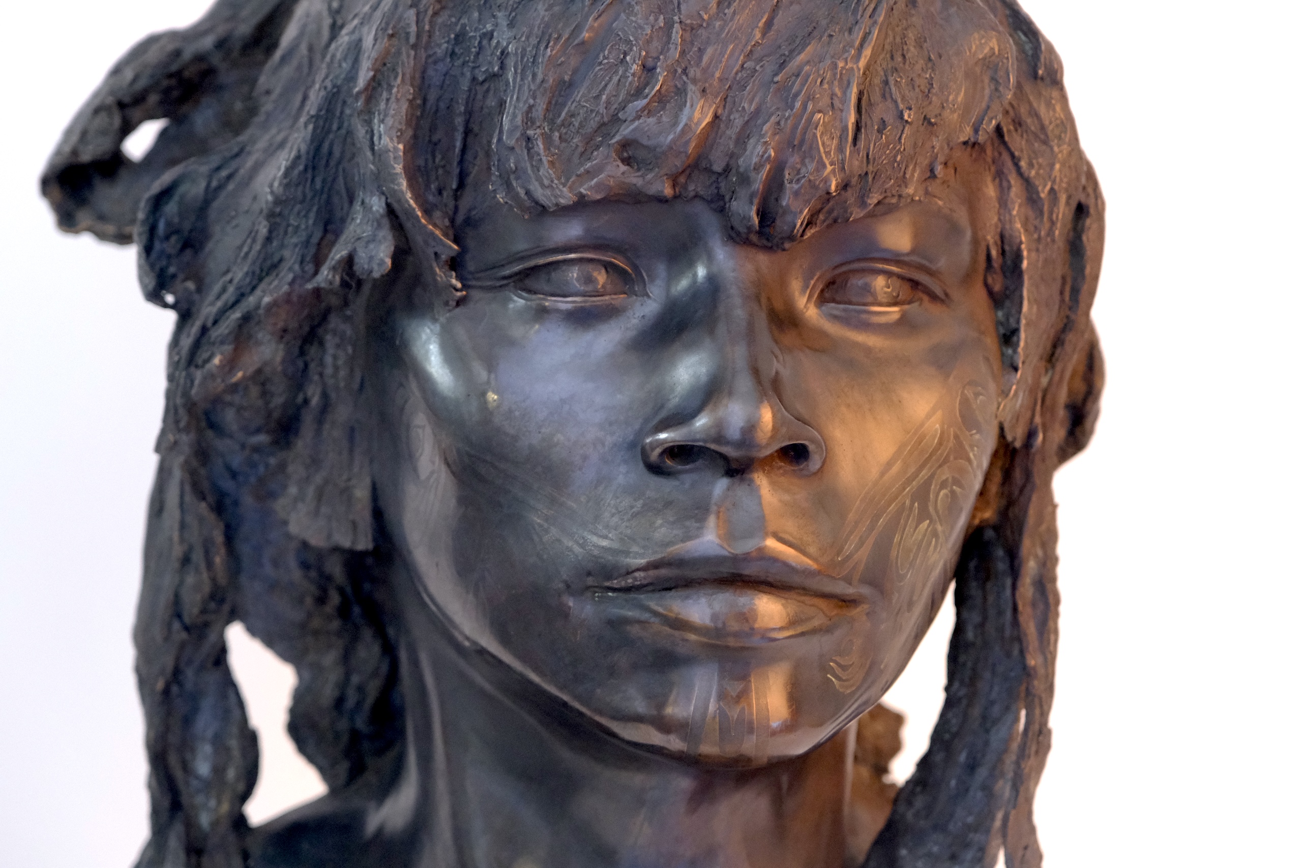 The Raven is a figurative bronze sculpture by French artist Romain Langlois, representing the face of a young man with long hair, his facial features engraved with a traditional tattoo.