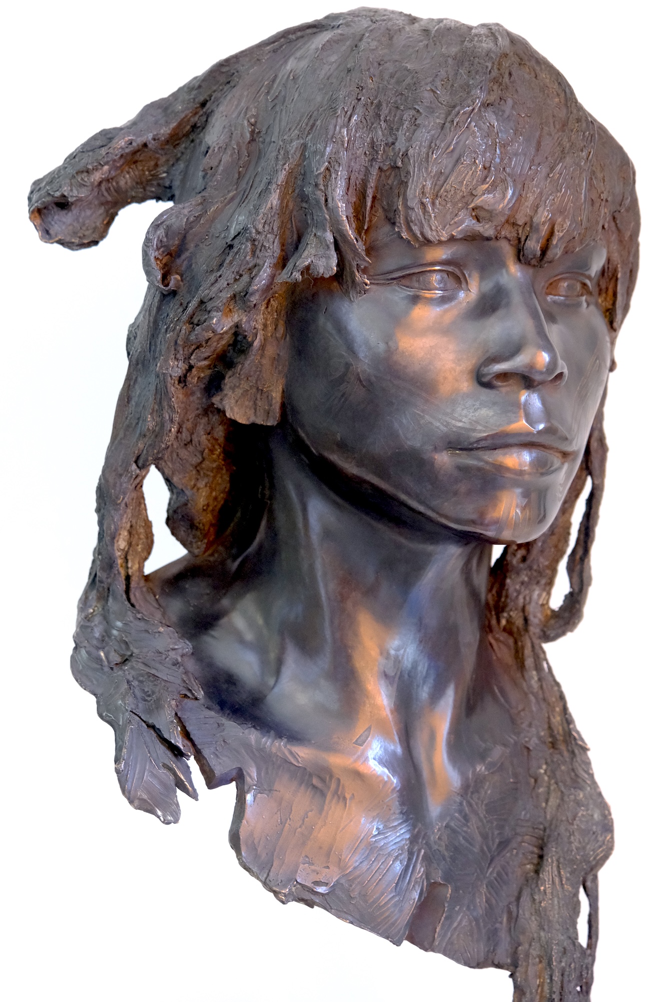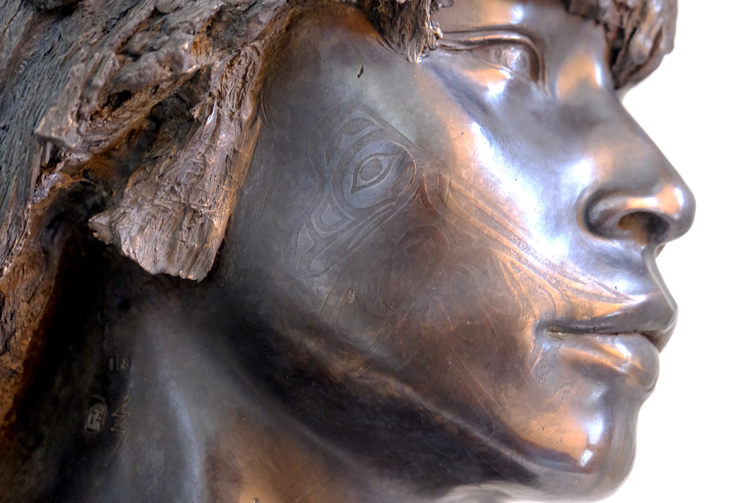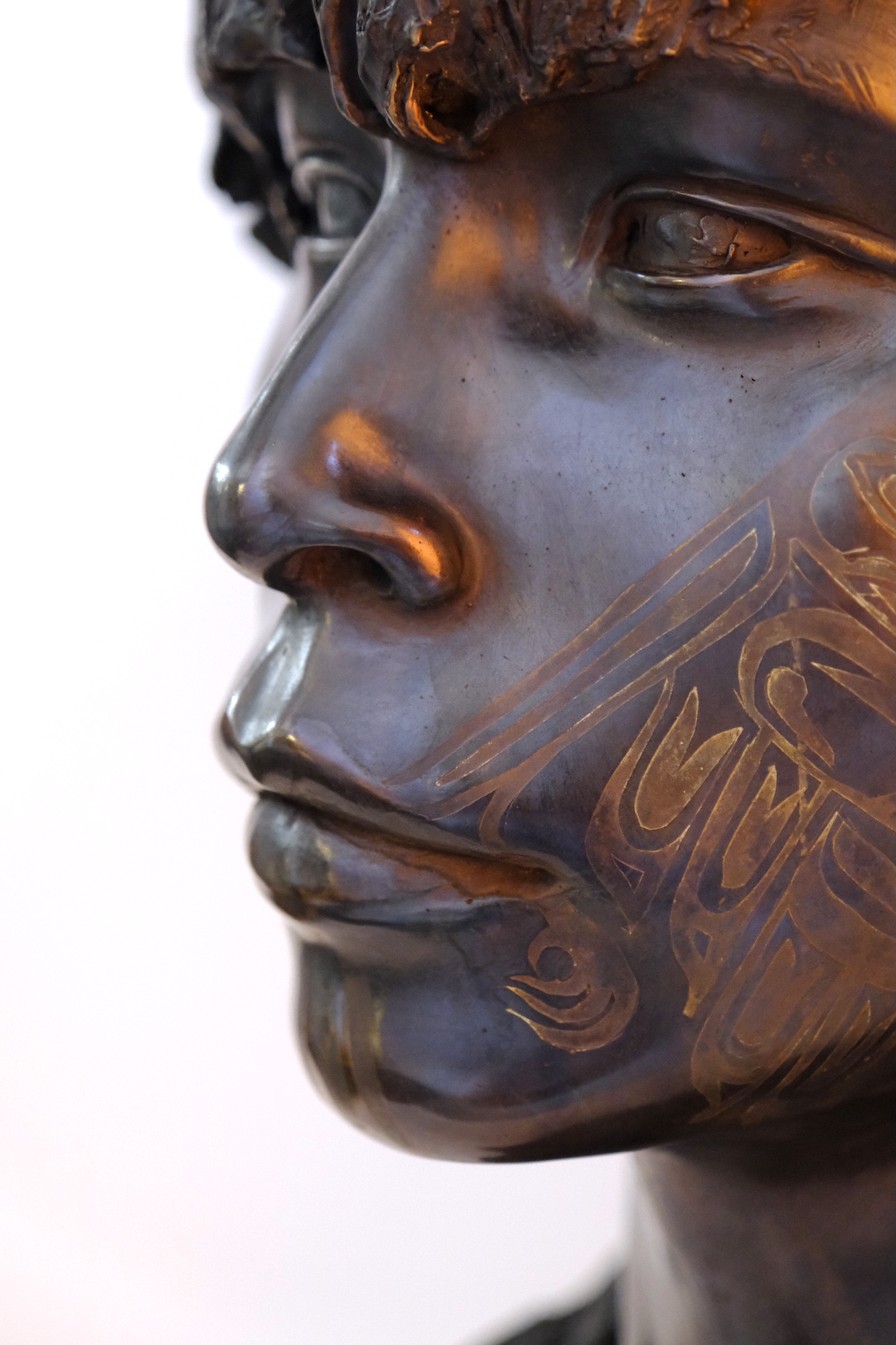 The Raven is a figurative bronze sculpture by French artist Romain Langlois, representing the face of a young man with long hair, his facial features engraved with a traditional tattoo.