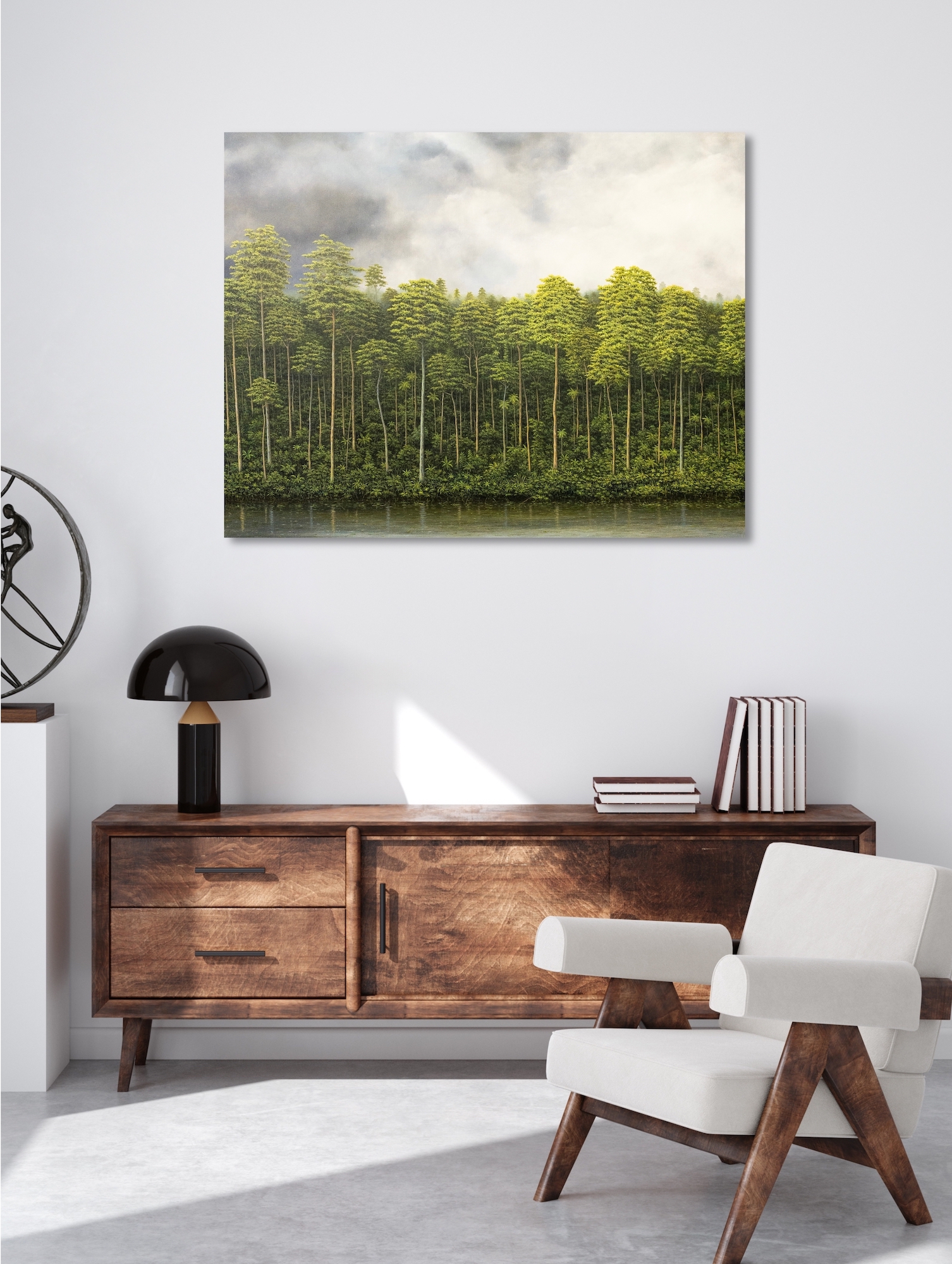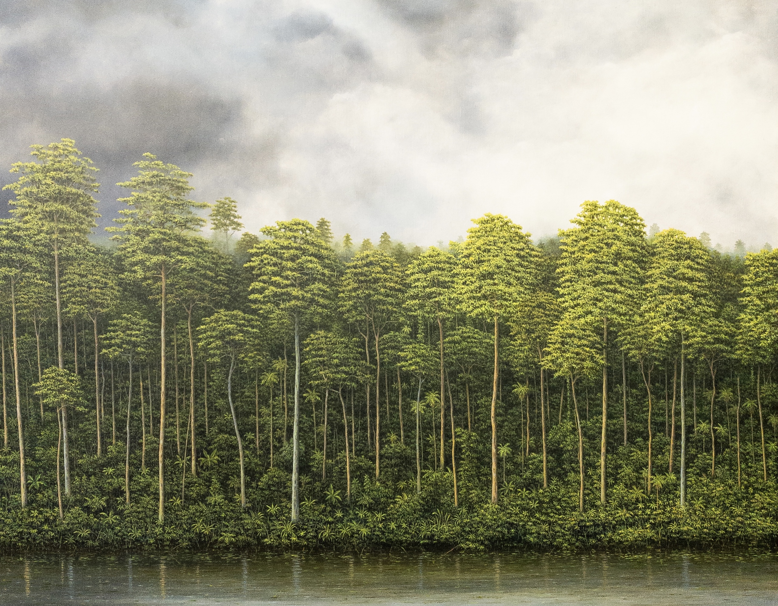 In this painting, a line of trees is in the foreground, immersing the viewer in untouched nature. The sky above the vegetation is cloudy. The painting features another natural element, water, with the inclusion of a river.