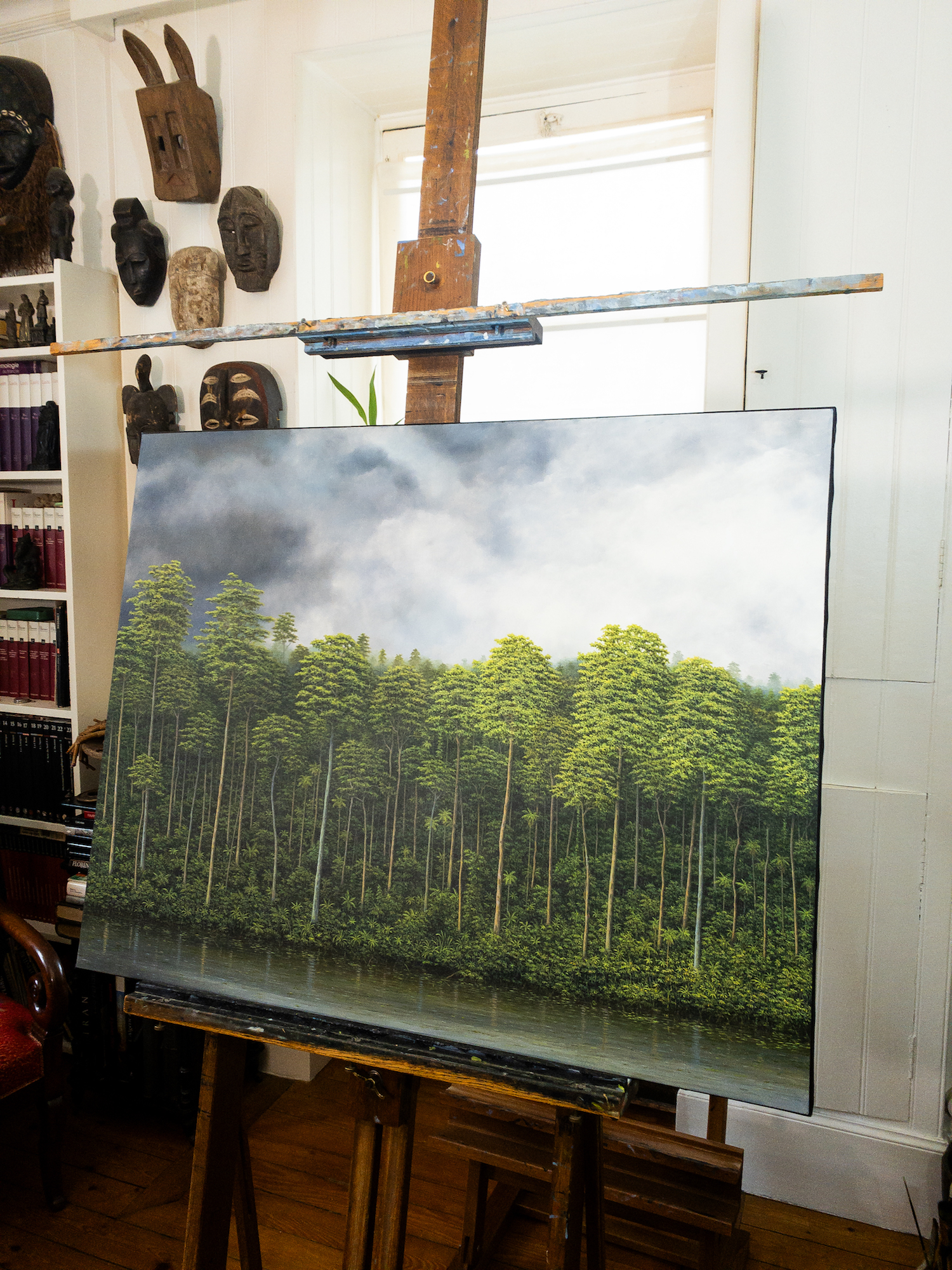 Gérard Priault draws his inspiration from nature: during his many trips to the world’s tropical rainforests, the artist immerses himself in an almost contemplative way in untouched nature and allows himself to be totally immersed in its elements. However, his paintings do not represent real rainforests but are the product of his imagination, based on personal memories and impressions. The viewer is invited to travel through these landscapes, which have a mysterious, almost dreamlike atmosphere: they can imagine the sounds of birds and monkeys, feel the humidity in the air and mist, and be amazed by the intense colours of the vegetation.