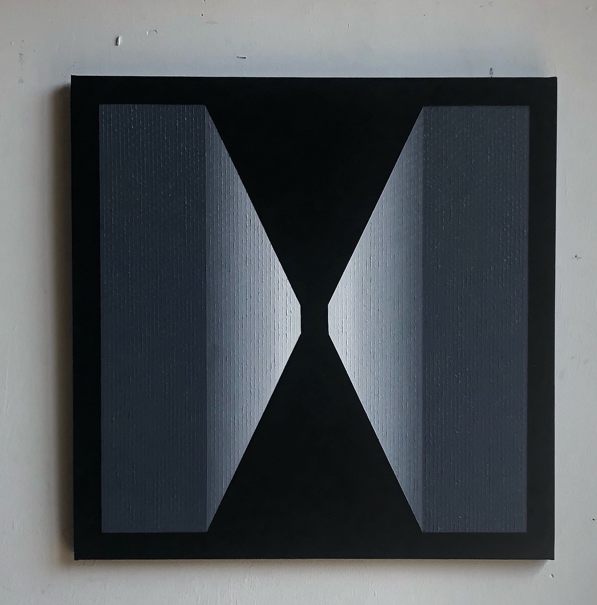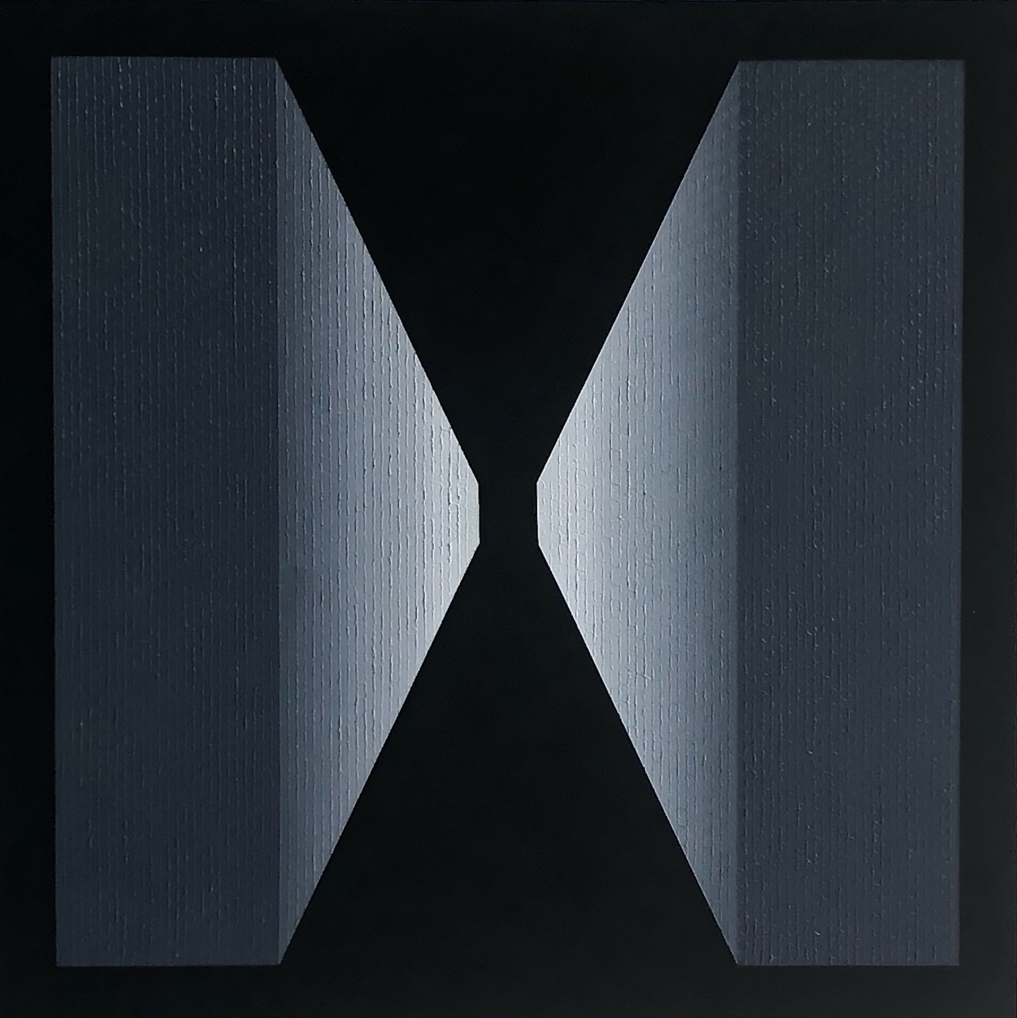 The artist uses a particular and original technique that consists of fragmenting the act of painting: he paints by strokes, square after square, line after line. Each line changes shade slightly, to produce the colour gradation that creates the desired illusion of light. This repetitive process requires great attention to detail and patience, with the work taking several weeks or months to complete. The creative process is always considered and calculated, but surprises can arise from experimentation and mistakes. Mathieu Piffeteau works with all colours except red; for this painting, he used shades of black and white. The artist used water-based paint on the background of this work.