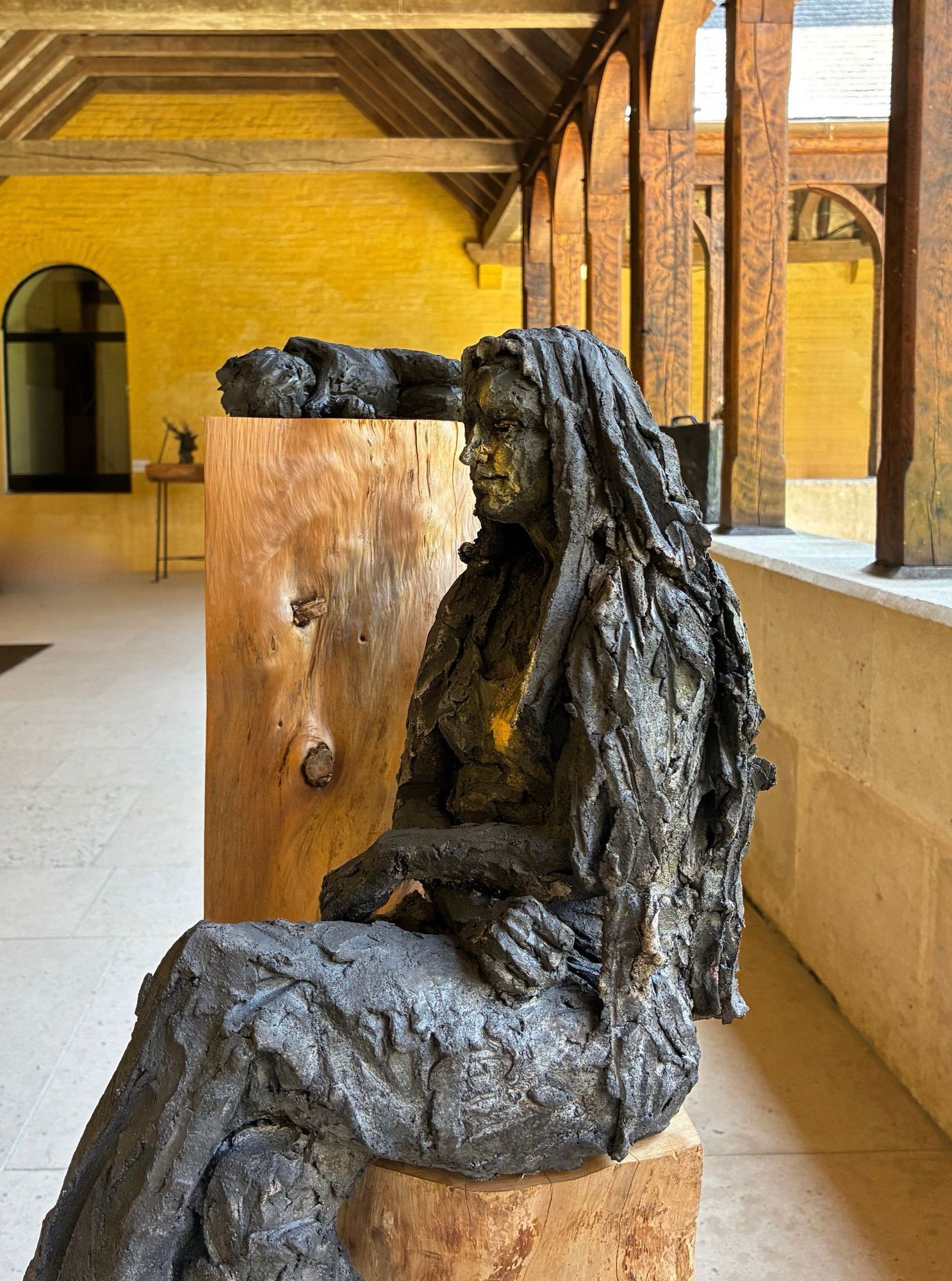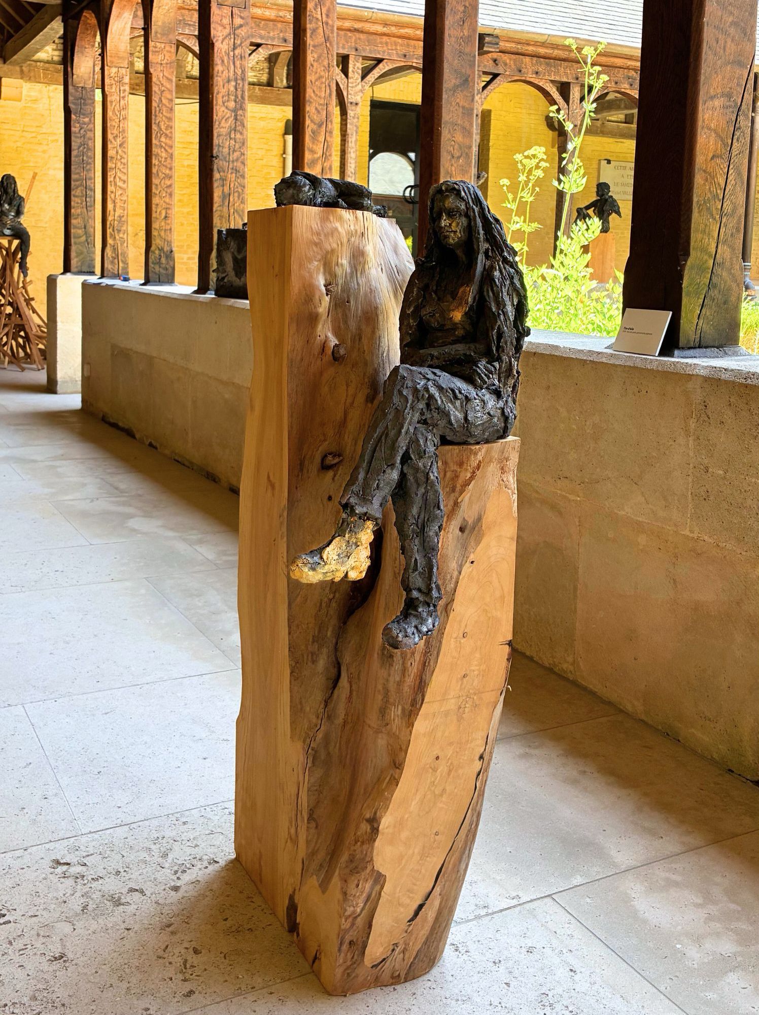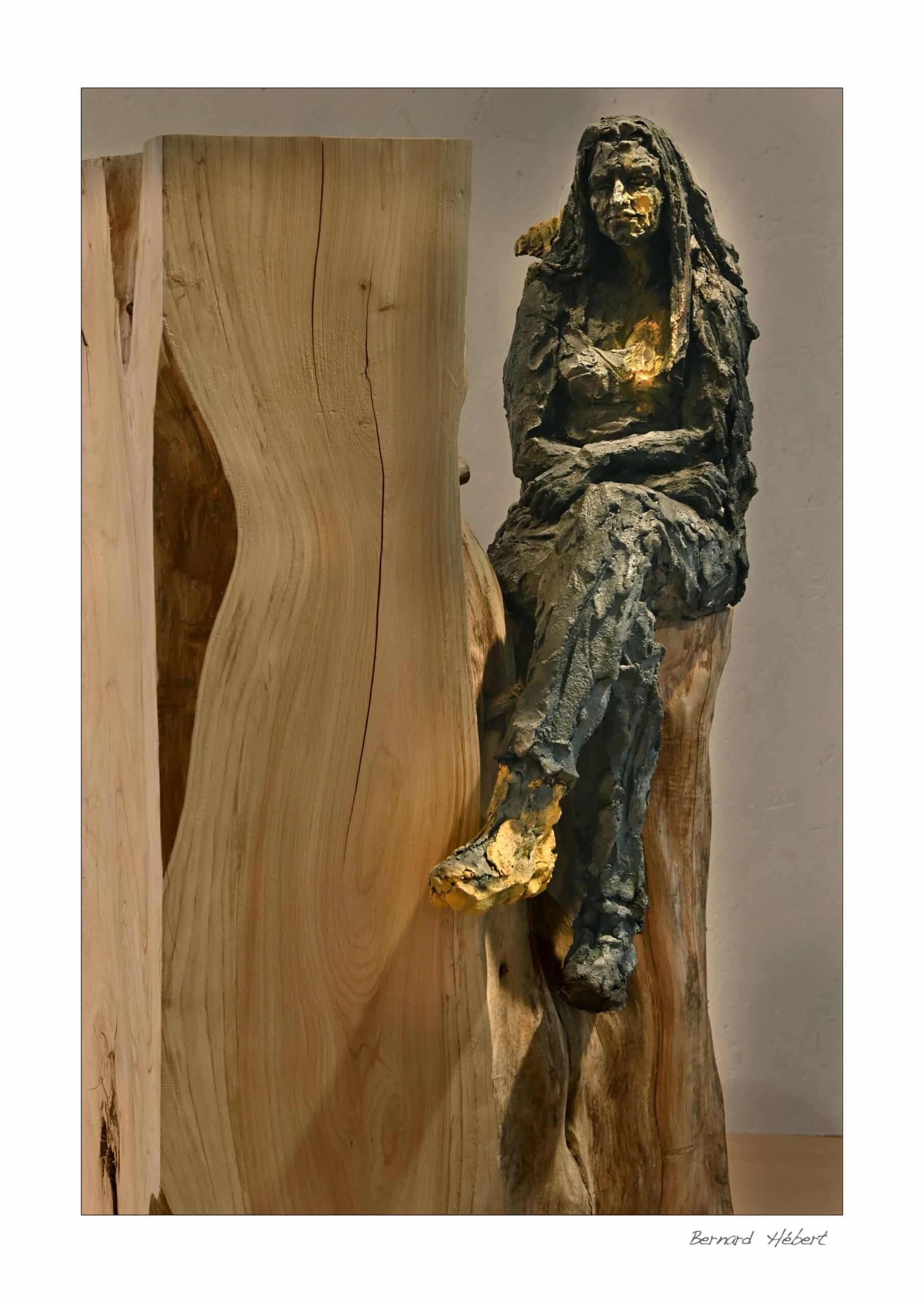 Tire d’aile (with Natacha) is a smoky sandstone sculpture by the contemporary artist Cécile Raynal. It is of a long-haired woman, wearing thick shoes, sitting in the hollow of a block cypress wood, hands crossed on her stomach. A wing on her back.
