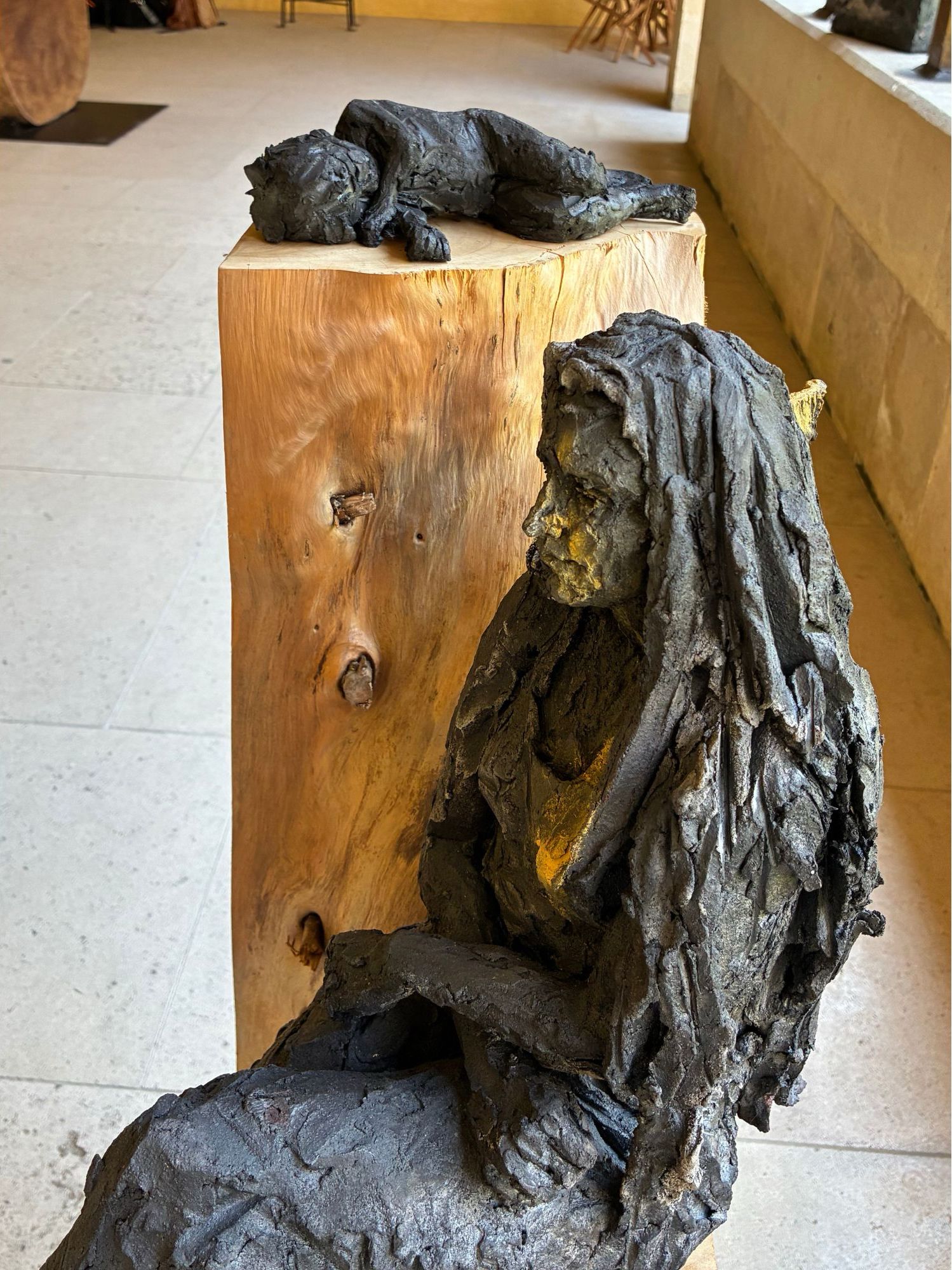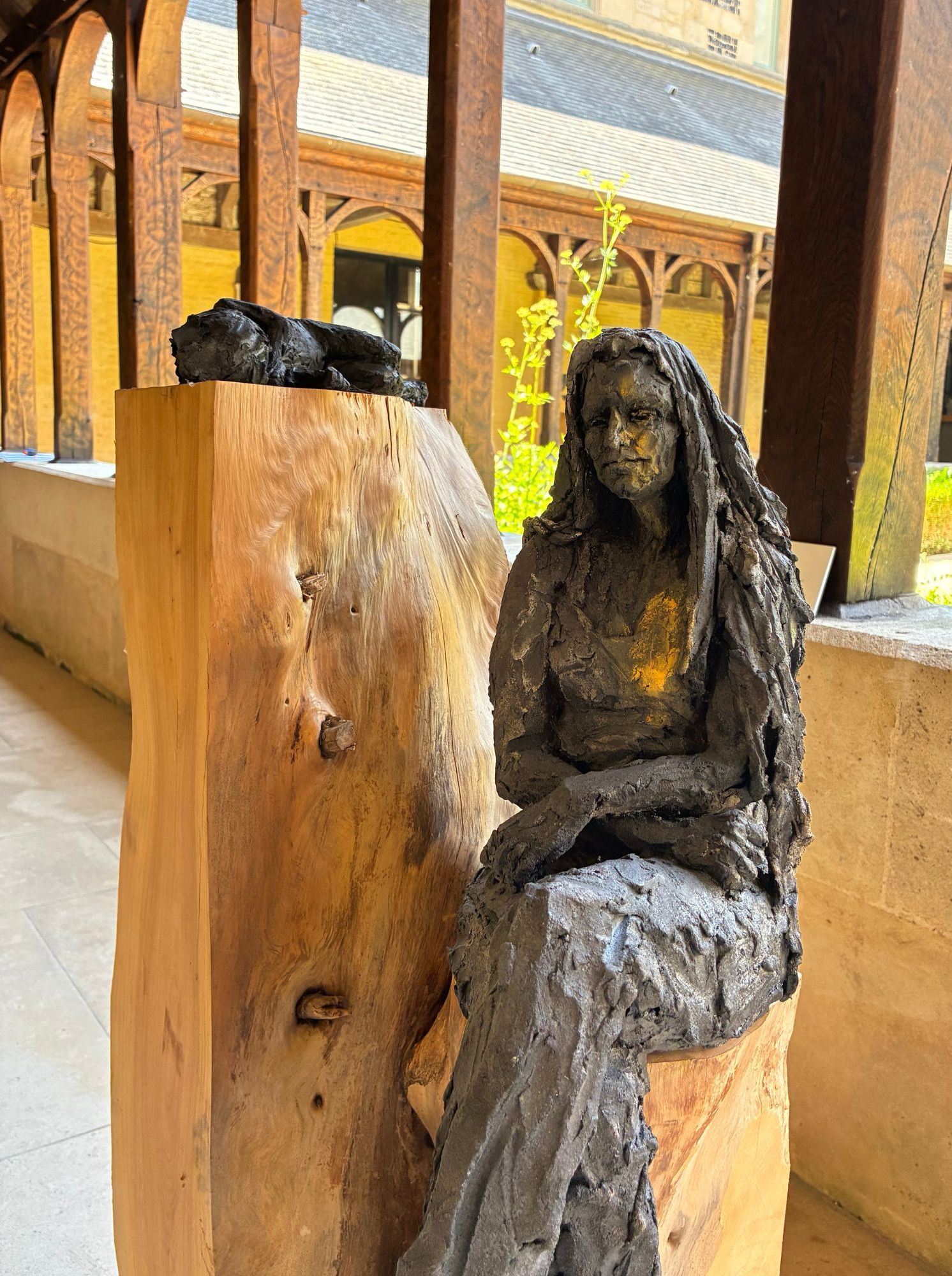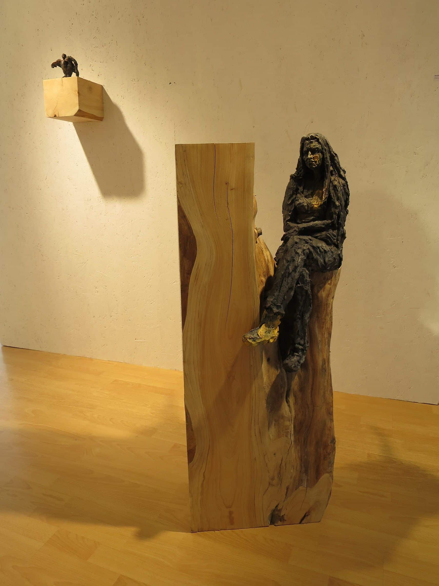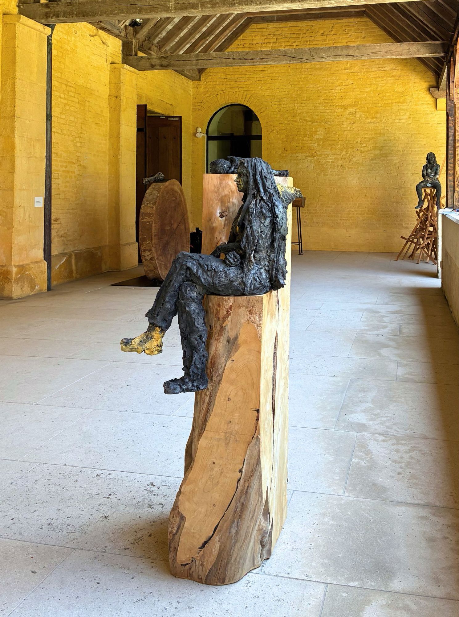 Tire d’aile (with Natacha) is a smoky sandstone sculpture by the contemporary artist Cécile Raynal. It is of a long-haired woman, wearing thick shoes, sitting in the hollow of a block cypress wood, hands crossed on her stomach. A wing on her back.