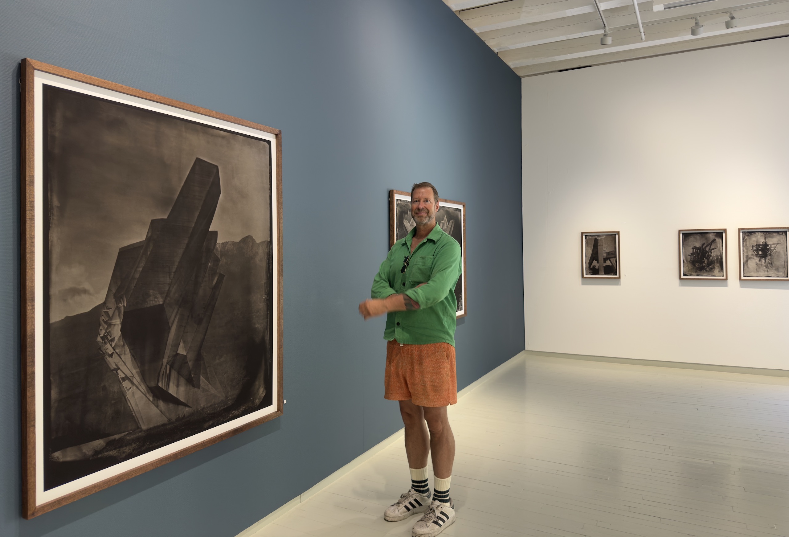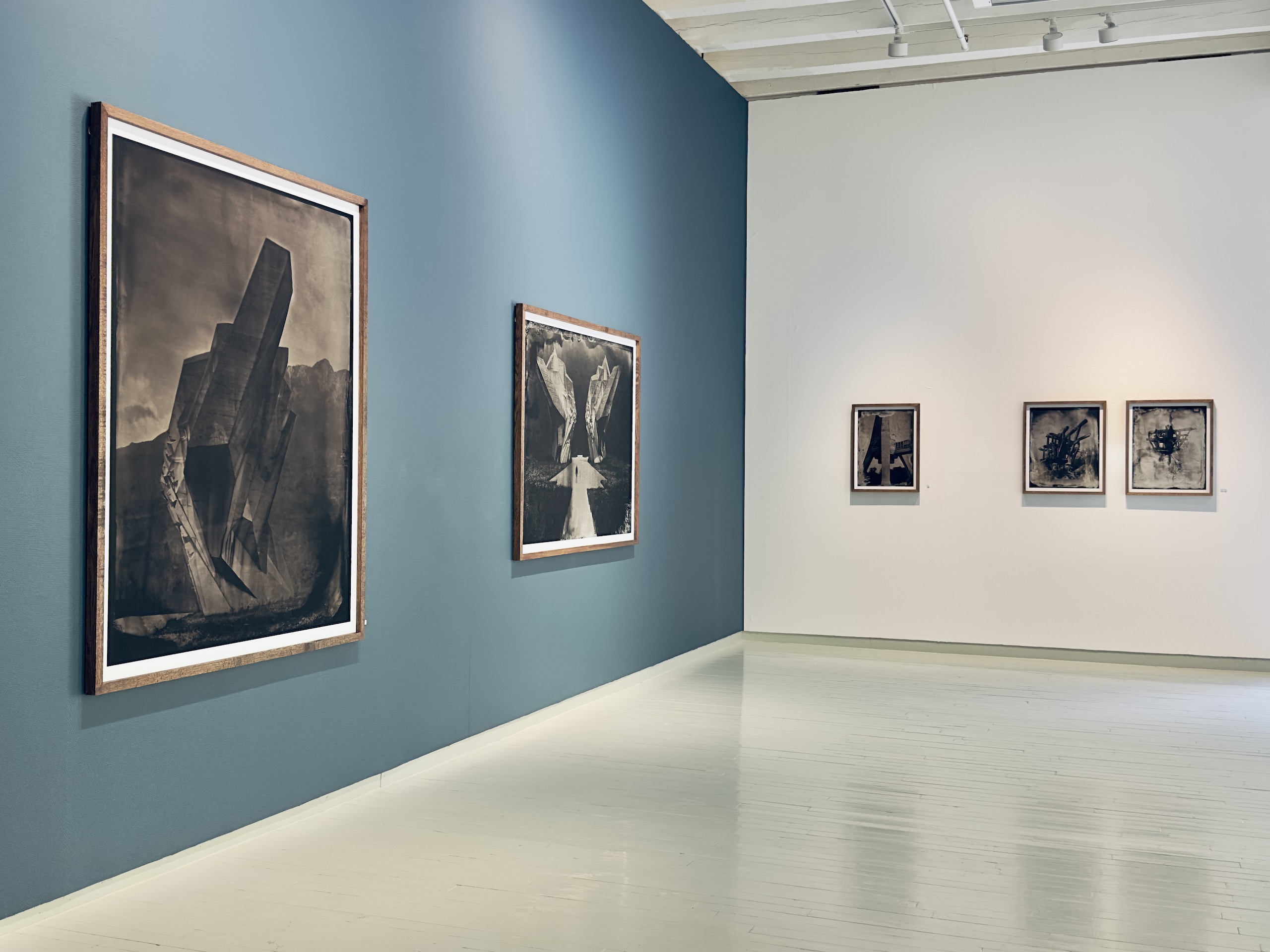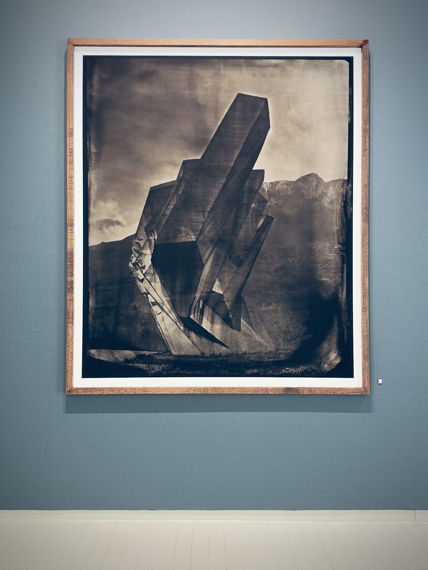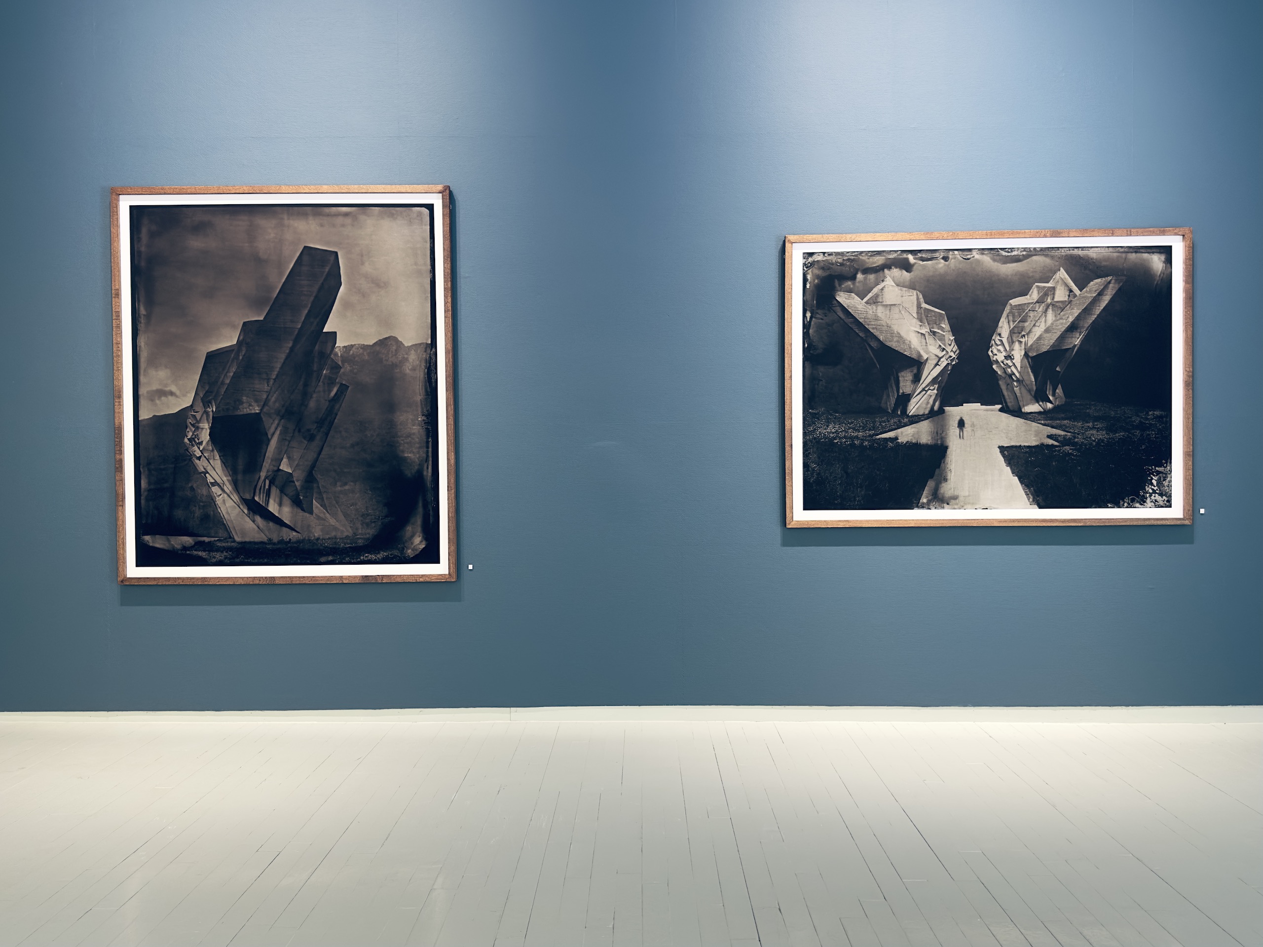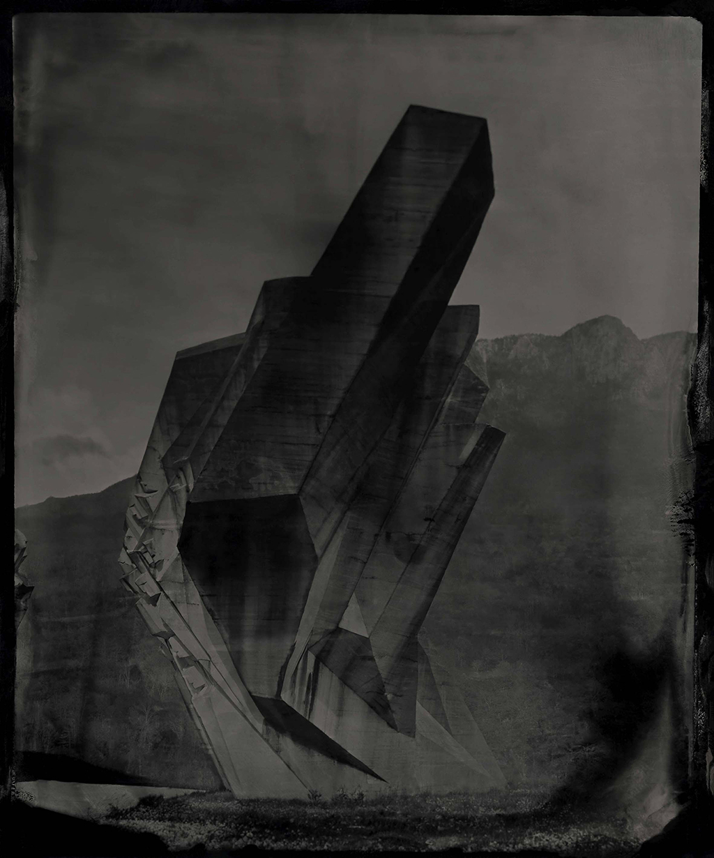 “The imperfections of the process—chemical veils, cracks, ghostly anomalies—are not corrected but embraced, echoing the erosion and uncertainty etched into the monuments themselves. The silver images shimmer with otherworldly tones in collodion alchemy, transforming solid concrete into spectral forms, softening hard edges, and inviting new emotional interpretations of these politically charged structures. […] Through the alchemy of this process, these monuments are recontextualized—not as relics of propaganda, nor as obsolete war memorials, but as poetic thresholds between past and present, utopia and aftermath. They become luminous apparitions, suspended in time, reflecting both the grandeur of their original intent and the melancholy of their abandonment. In an age of digital speed, AI and historical amnesia, `Echoes of Utopia` invites the viewers to slow down, to look deeper, and to reflect on the impermanence of power, the fragility of memory, and the strange beauty that arises when two distant eras – concrete modernism and photographic romanticism – collide.” Christian Houge