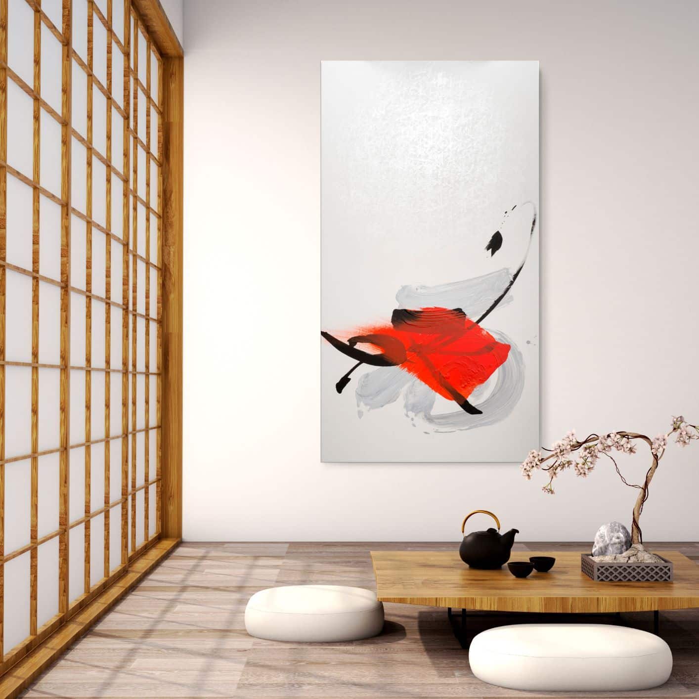 This artwork belongs to an abstract register and draws its influences from Japanese calligraphy. The brushstrokes, vigorous and yet elegant, are clearly visible and suggest the painter’s gestures. The black and white colors intersect on the canvas, creating layers and transparencies. This painting, created with ink and acrylic, seems to spread a sort of energy and at the same time it invites to meditation.