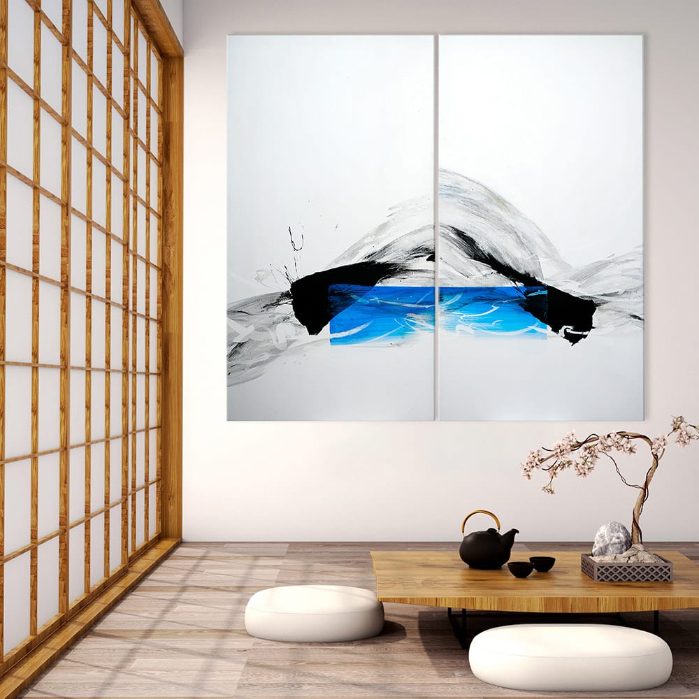 This artwork belongs to an abstract register and draws its influences from Japanese calligraphy. The brushstrokes, vigorous and yet elegant, are clearly visible and suggest the painter’s gestures. The black, grey and blue colors intersect on the canvas, creating layers and transparencies. This painting, created with ink and acrylic, seems to spread a sort of energy and at the same time it invites to meditation.