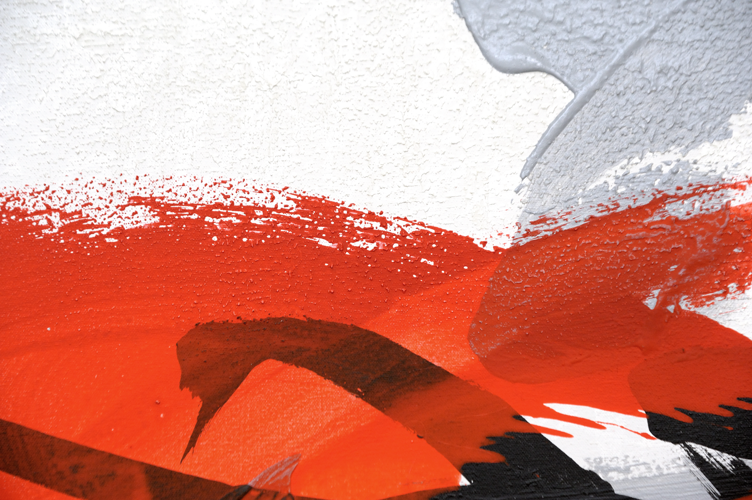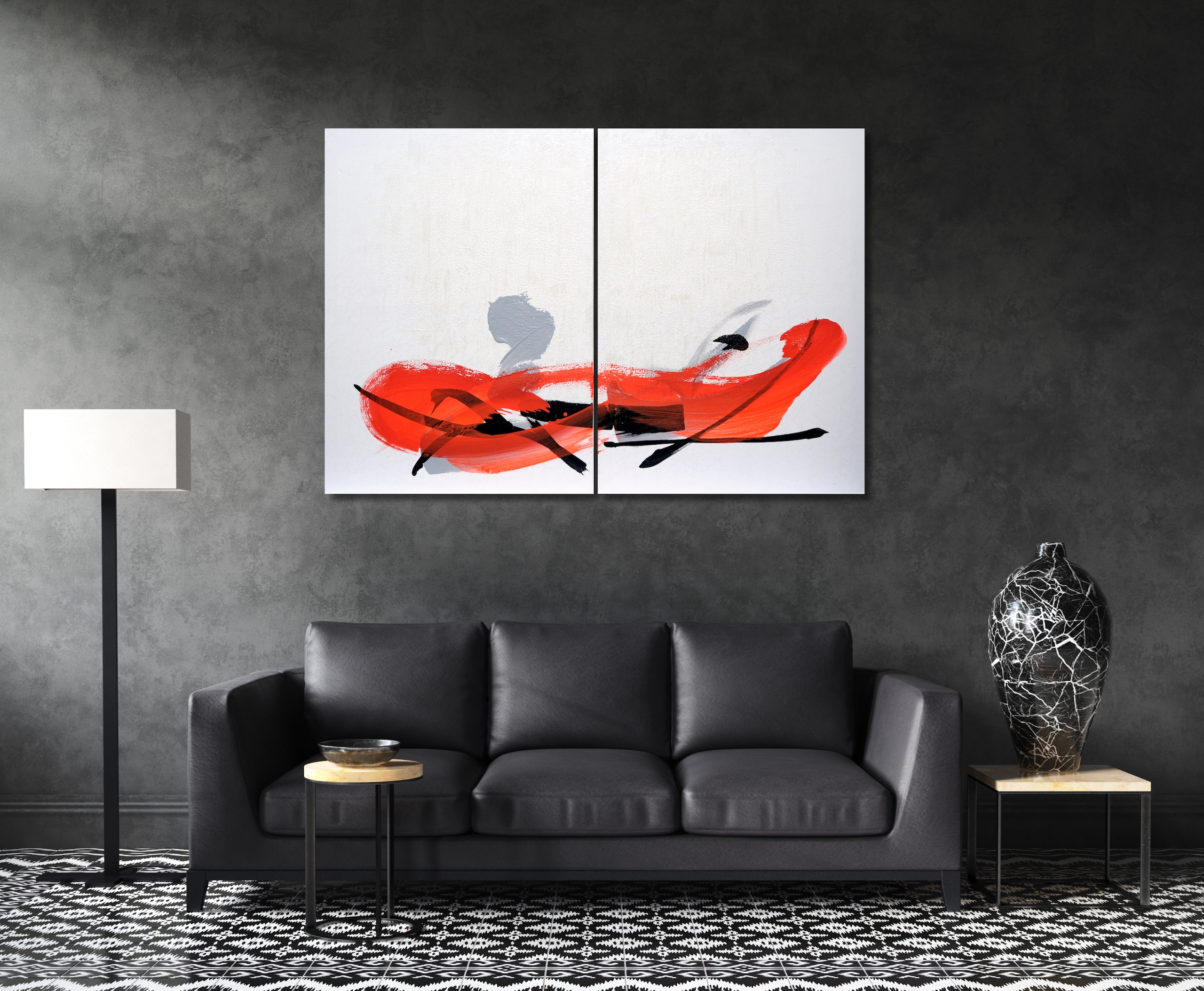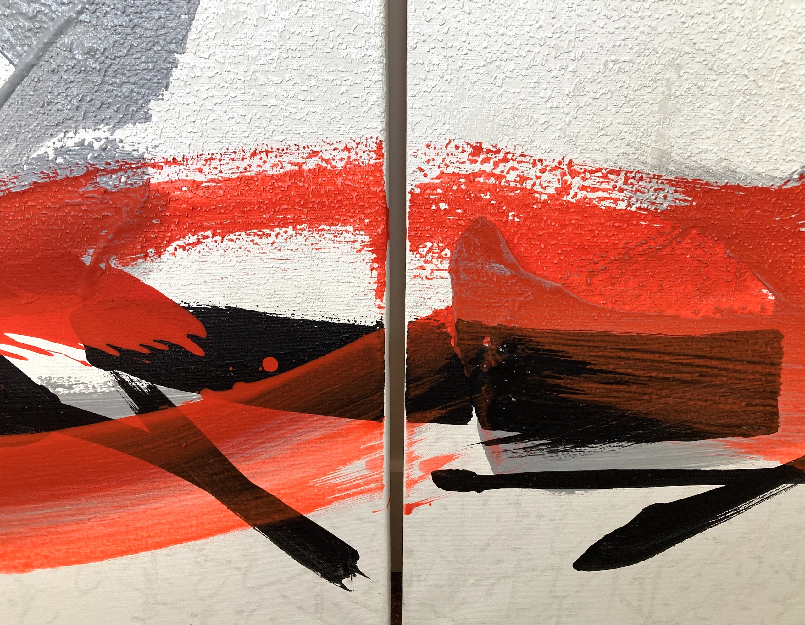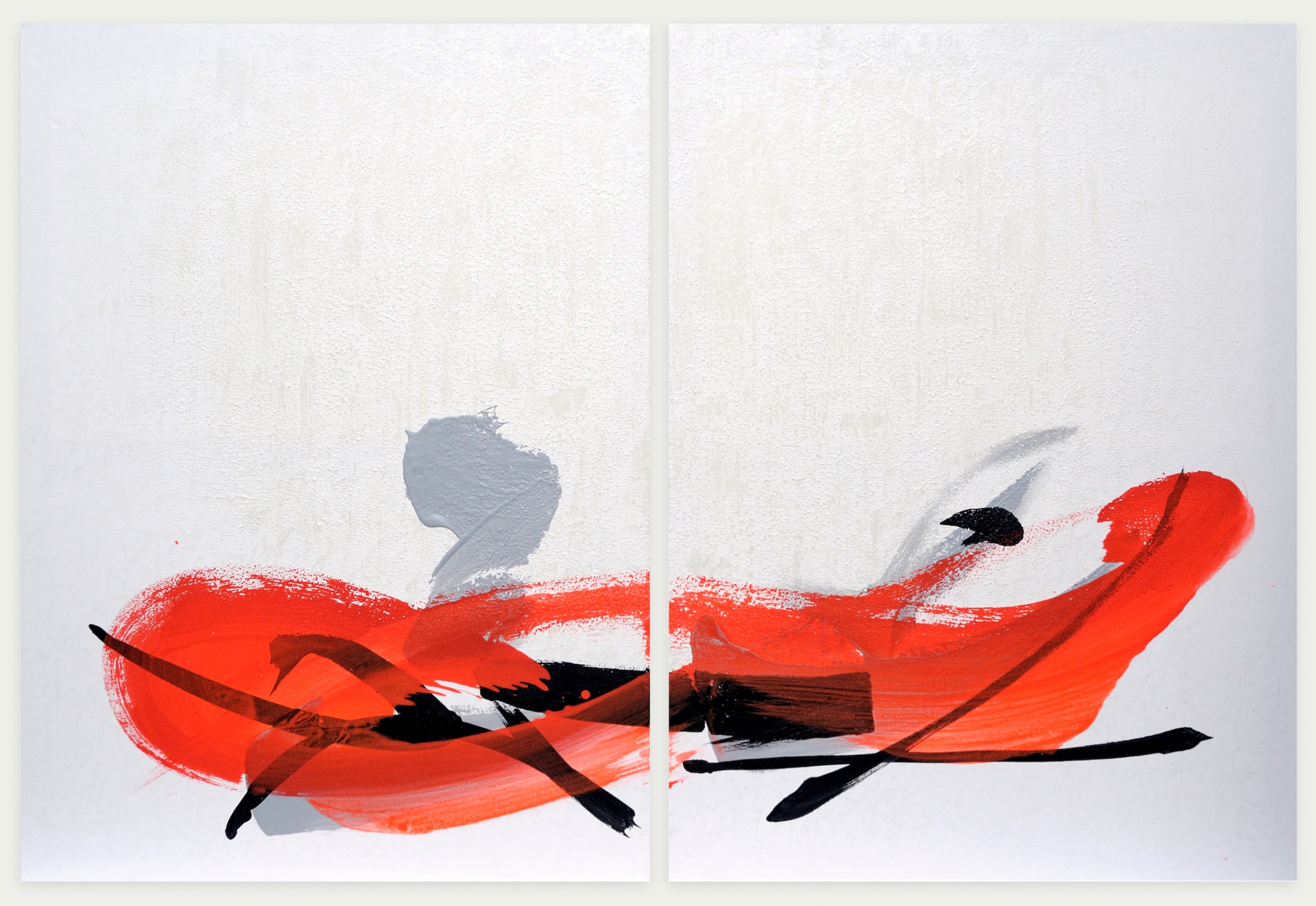 This large abstract painting is composed of two panels on which large red and black brushstrokes, in ink and acrylic paint, apprear on a white background. These few strokes, in their diversity, perfectly suggest the richness and mastery of the painter’s gestures.