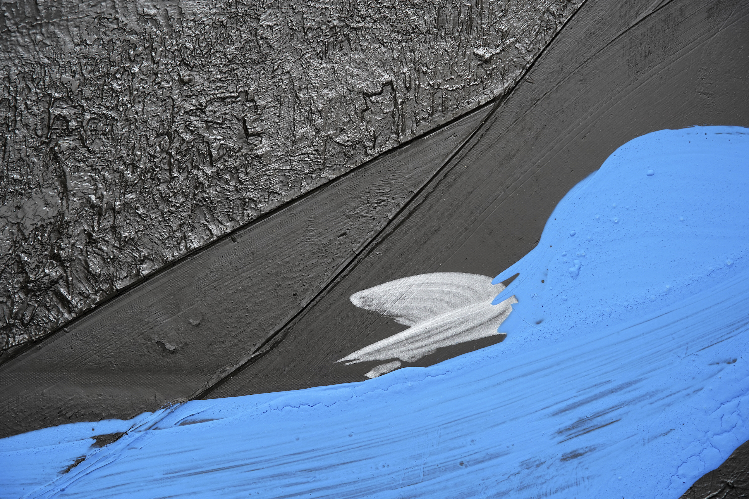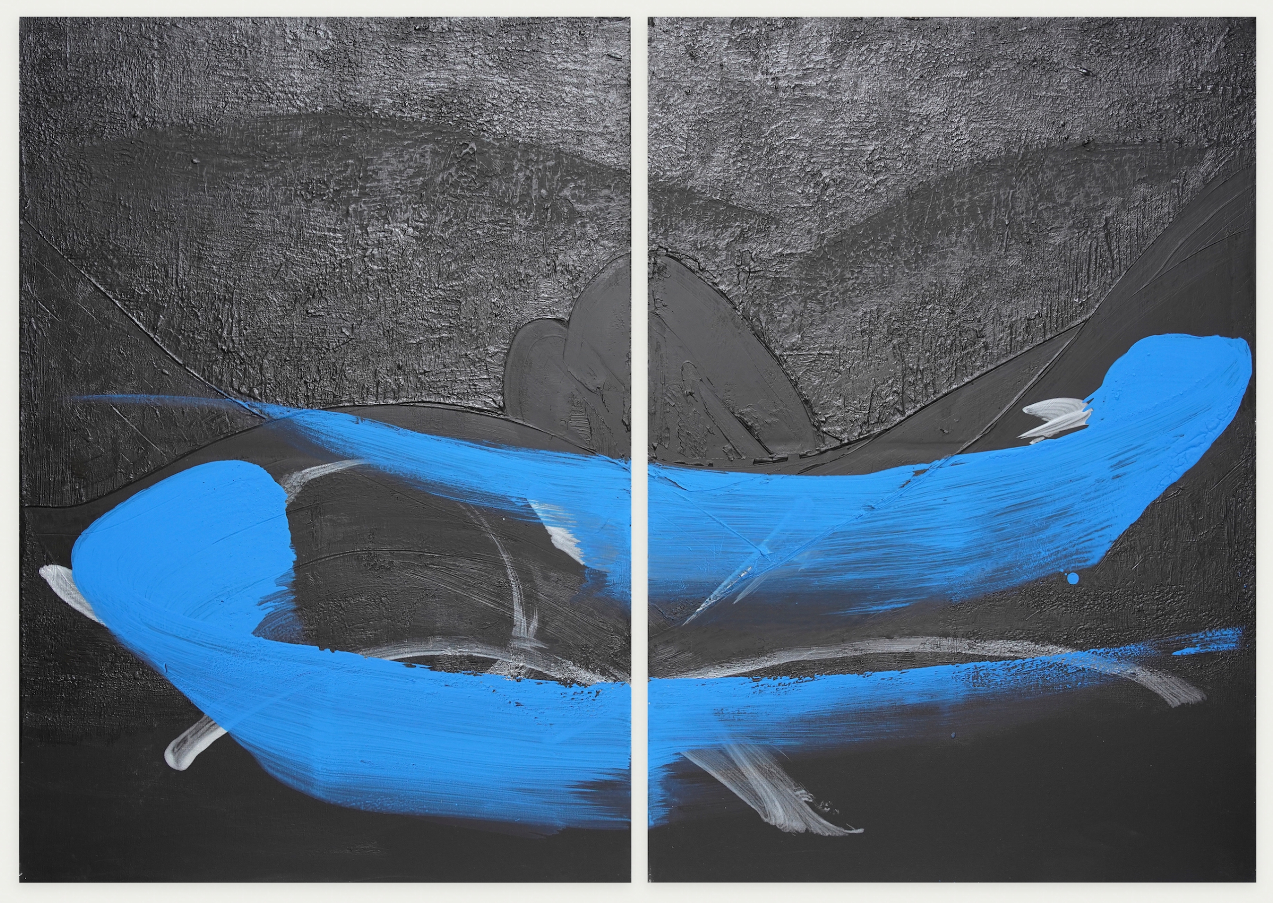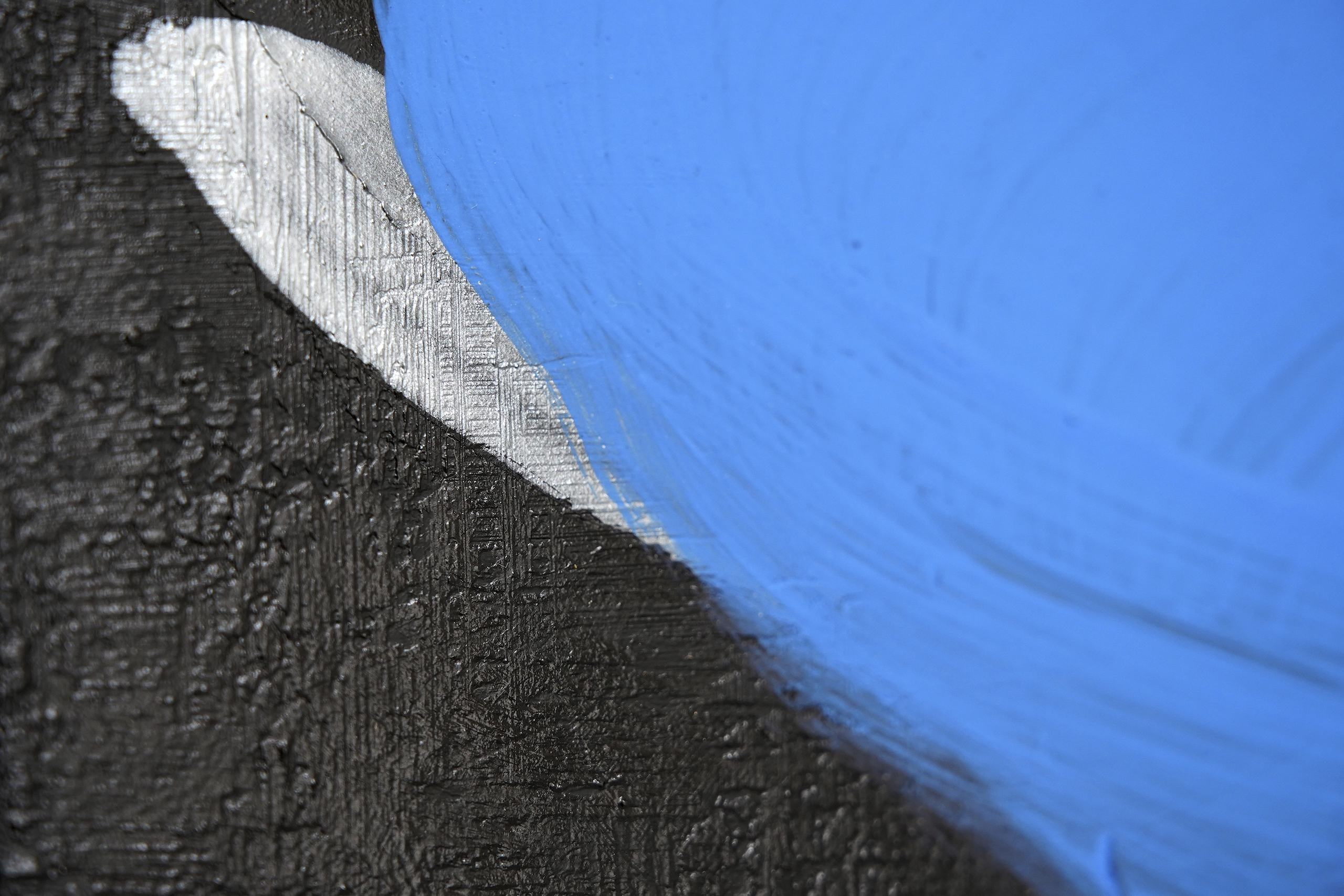 This artwork belongs to an abstract register and draws its influences from Japanese calligraphy. For this painting, created with ink and acrylic, only black, white and blue are used. The brushstrokes, vigorous and yet elegant, are clearly visible and suggest the painter’s gestures. The contrast between the dark background and the blue, a very brilliant and vibrant shade that the artist chose, seems to spread a sort of energy from the painting.