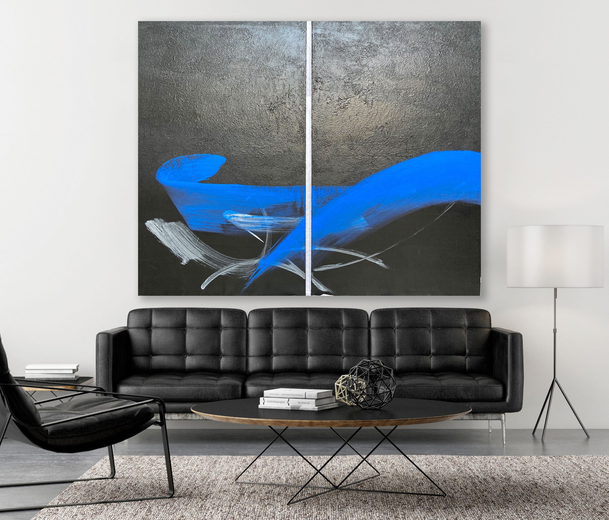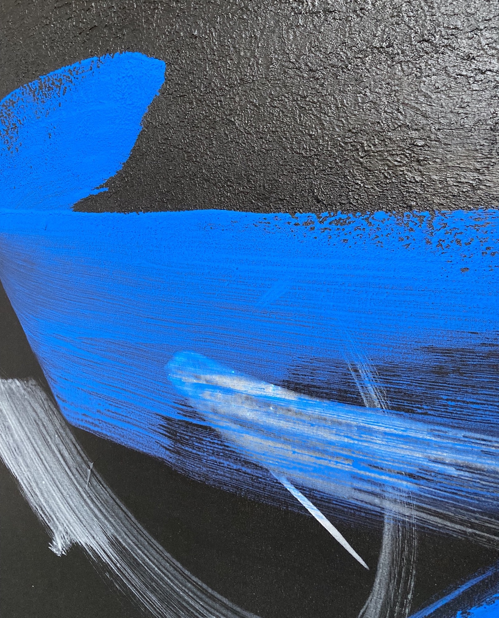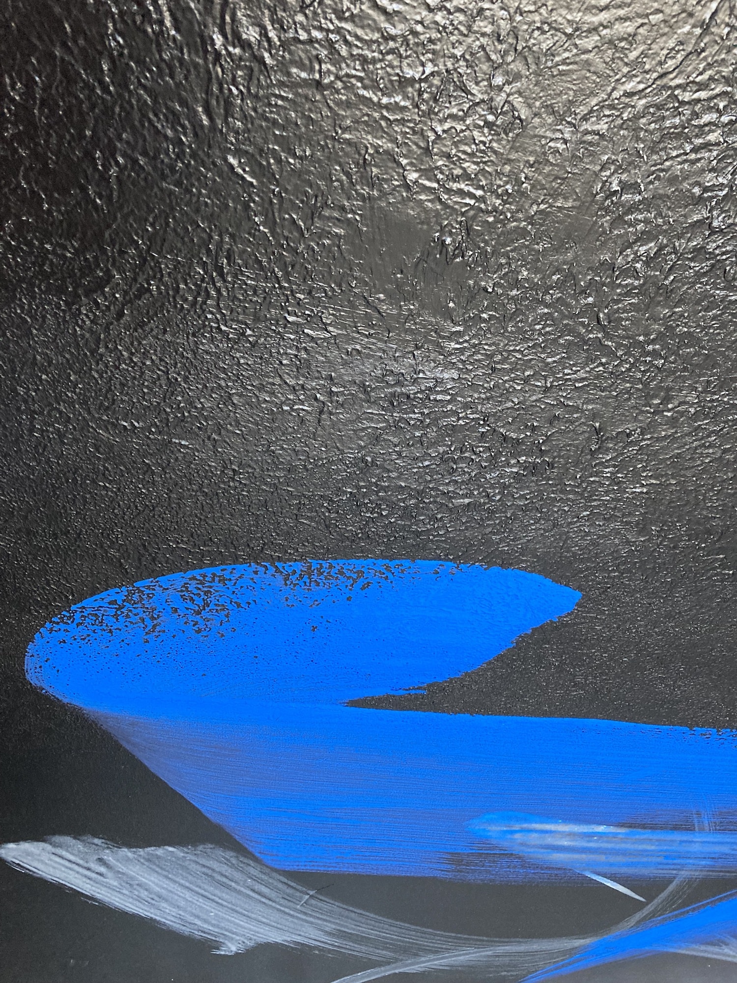 This artwork belongs to an abstract register and draws its influences from Japanese calligraphy. For this painting, created with acrylic, only black, white and blue are used. The brushstrokes, vigorous and yet elegant, are clearly visible and suggest the painter’s gestures. The contrast between the dark background and the blue, a very brilliant and vibrant shade that the artist chose, seems to spread a sort of energy from the painting.