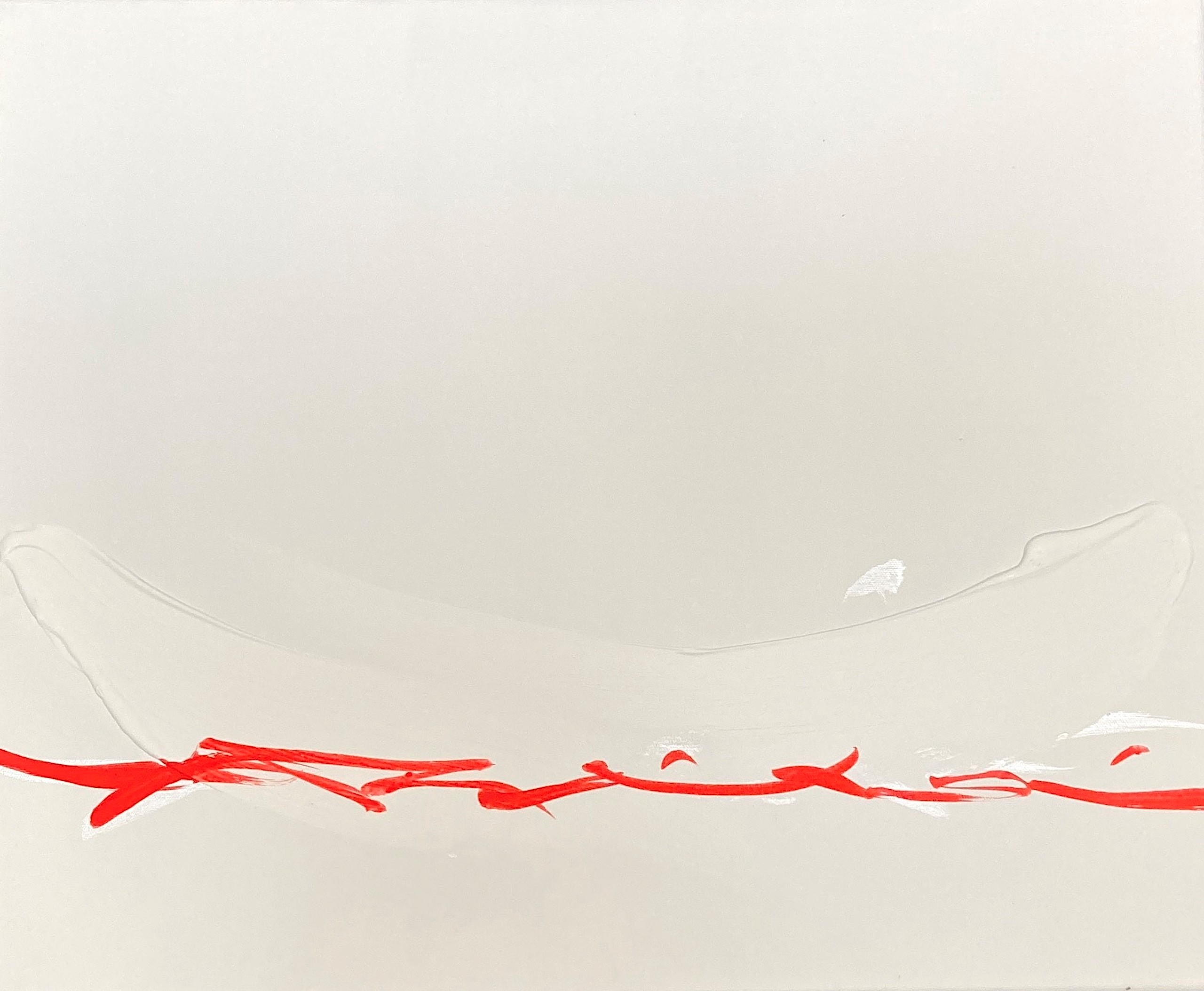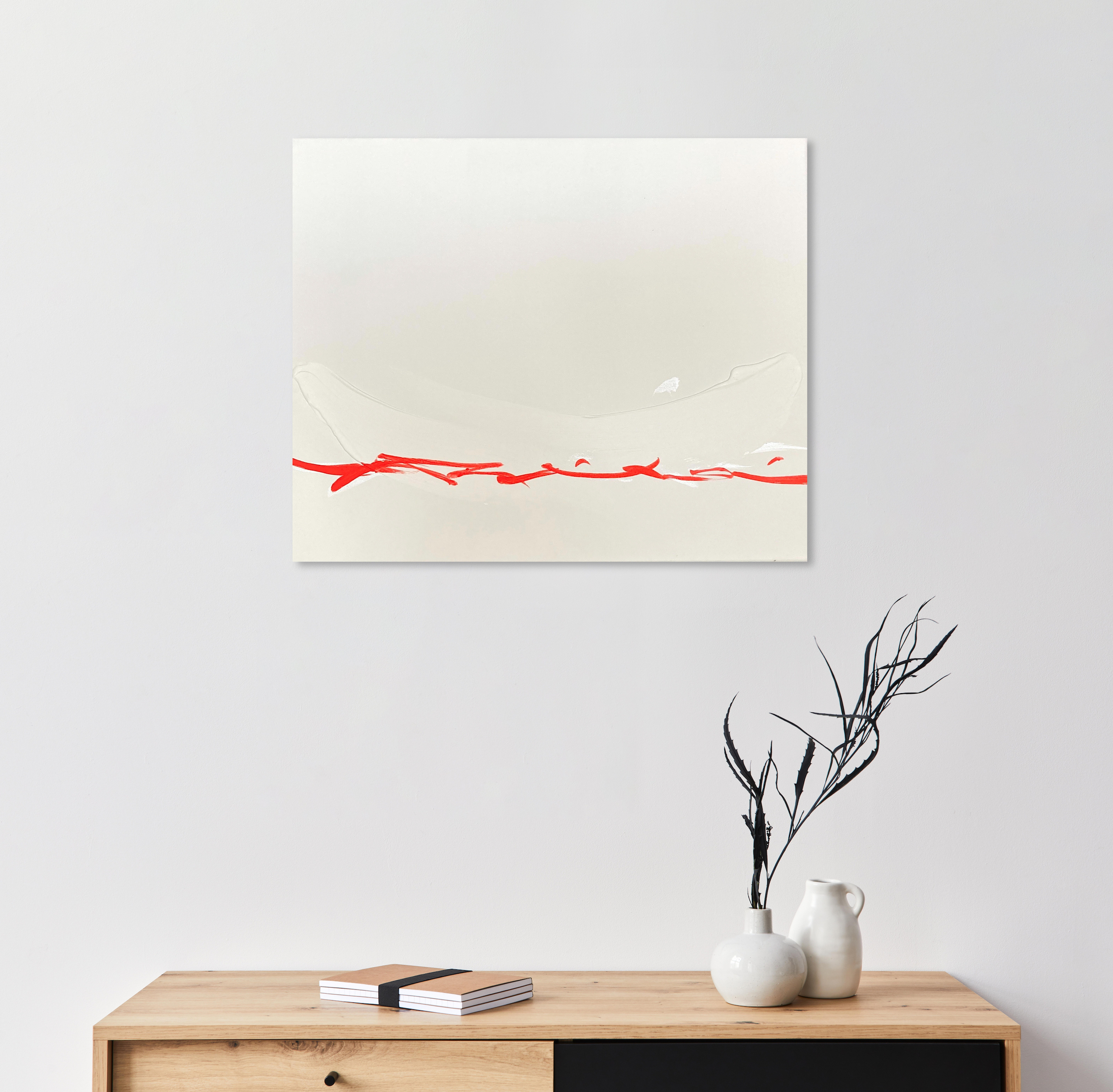 This artwork belongs to an abstract register and draws its influences from Japanese calligraphy. The brushstrokes, vigorous and yet elegant, are clearly visible and suggest the painter’s gestures. The red color creates a strong contrast with the white color. This painting, created with acrylic, seems to spread a sort of energy and at the same time it invites to meditation.