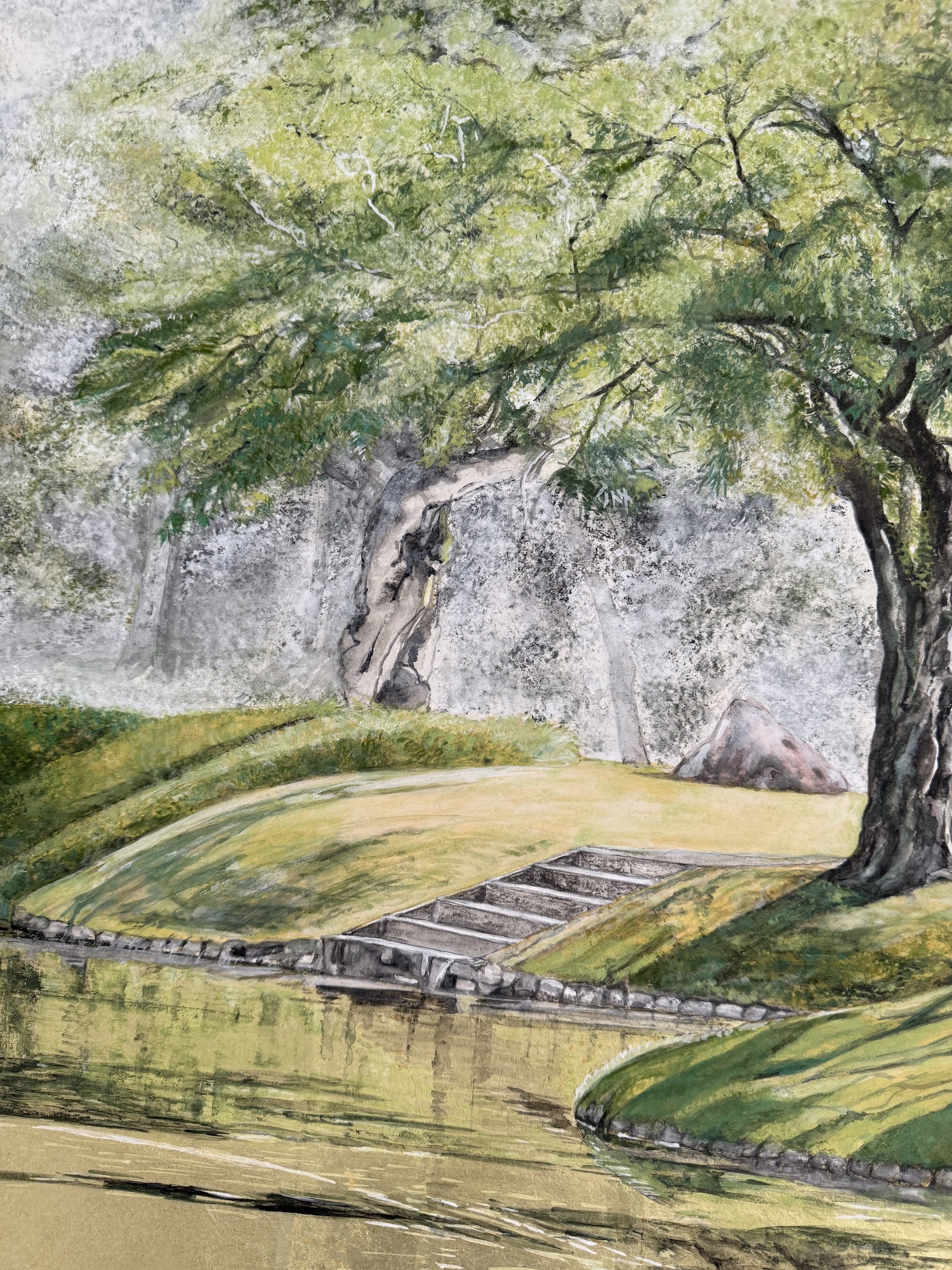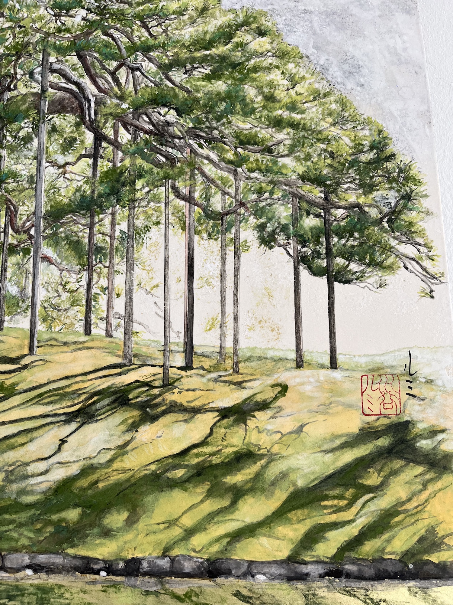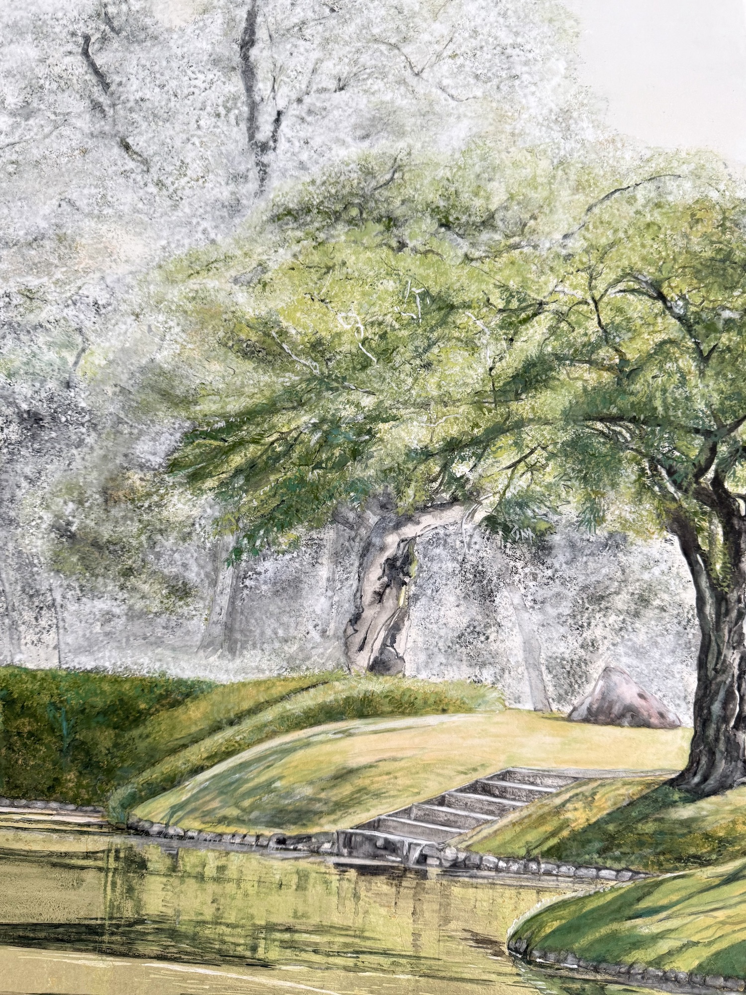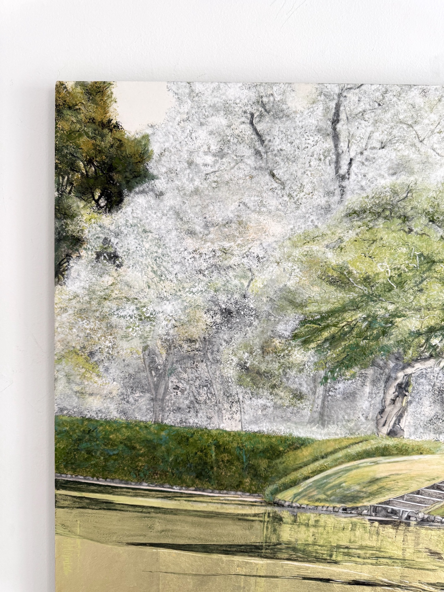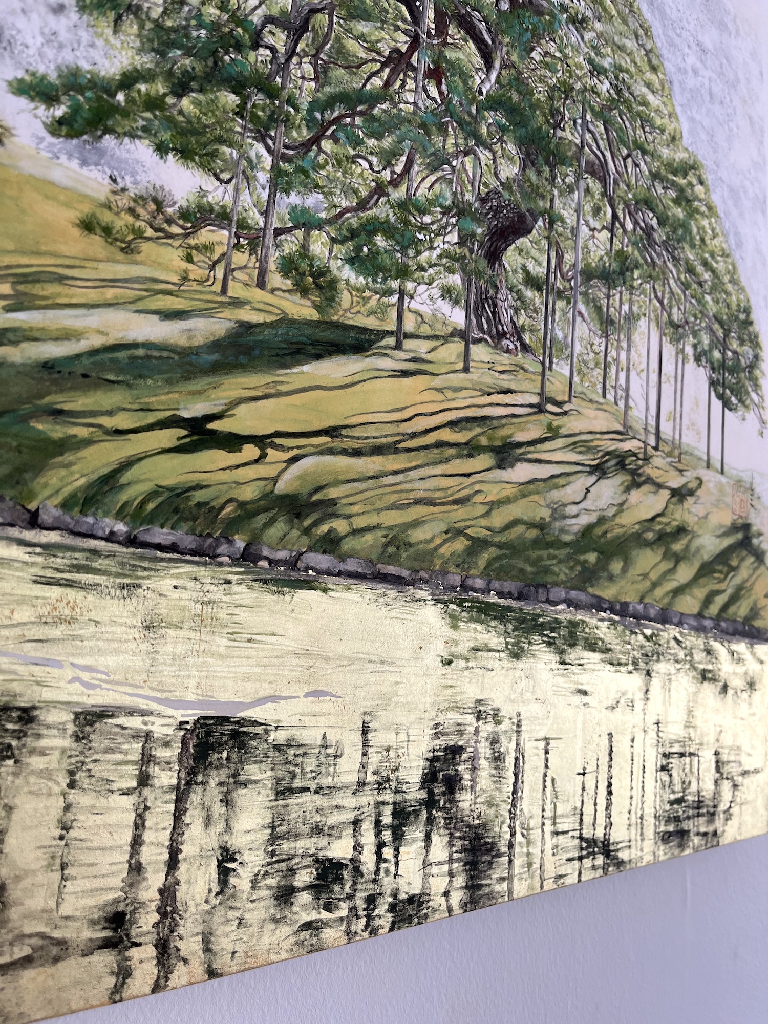 In her figurative paintings, the artist frequently pays tribute to Japan and its traditional landscapes. The painting shows a landscape that exudes a sense of tranquillity and calm, with a river and a succession of trees painted in shades of green.