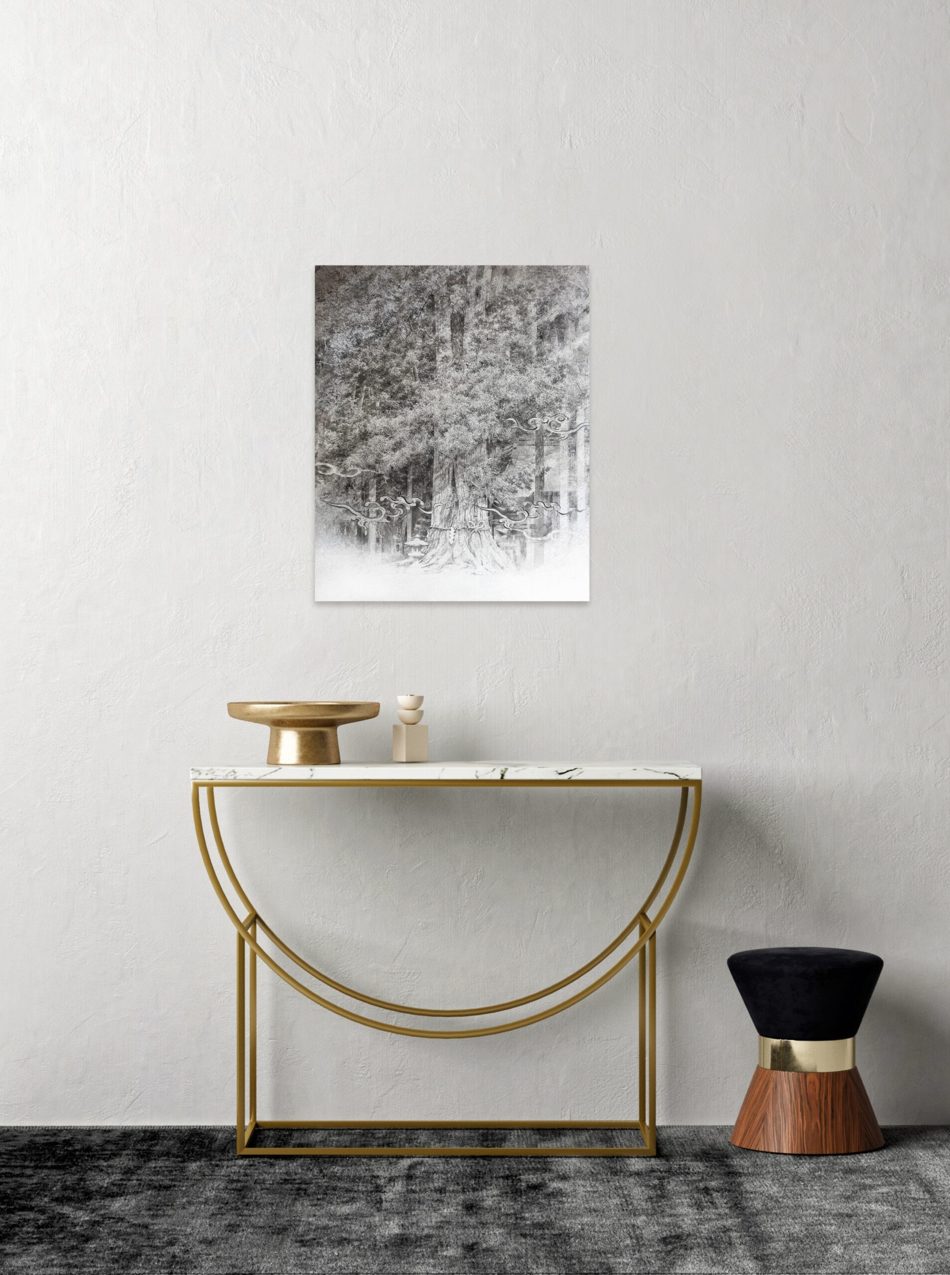 Tree Portrait #1 is a painting by Japanese artist Shoko Okumura from the series Tree Portraits.The painting depicts a majestic sacred tree, delicately rendered in ink, surrounded by stylized cloud motifs in a silent, spiritual atmosphere inspired by Japanese tradition.